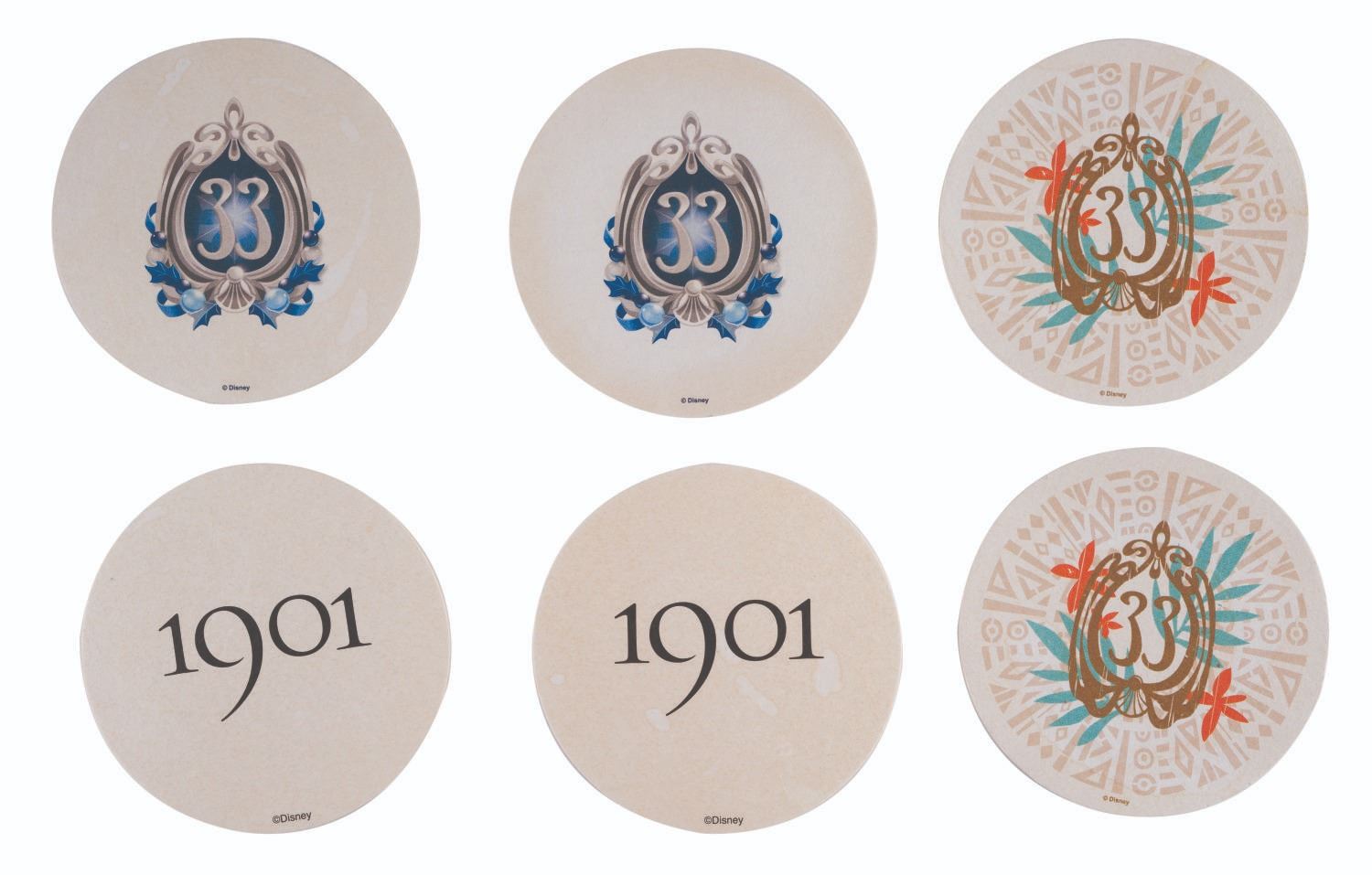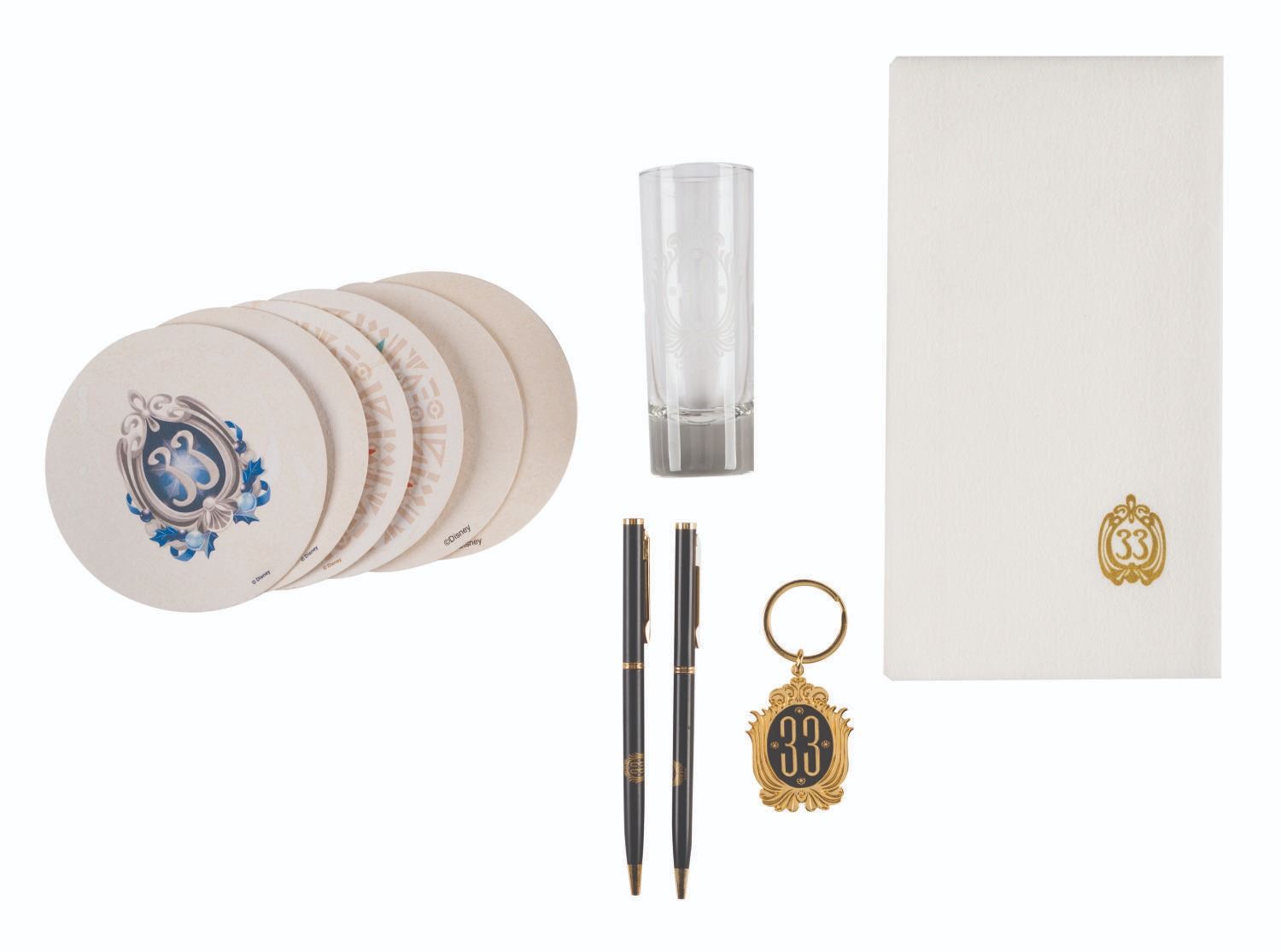 (Disneyland, 2010s-2020s) A collection of souvenirs and ephemera from the Disneyland Resort's exclusive Club 33 in New Orleans Square, and Club 1901 in the Carthay Theatre. Included are (5) Club 33 paper napkins, (2) Club 33 pens, a Club 33 keychain, a 4" Club 33 shot glass, (4) Club 33 coasters, and (2) 1901 coasters. Measuring various sizes, the pieces are all in very good unused condition.