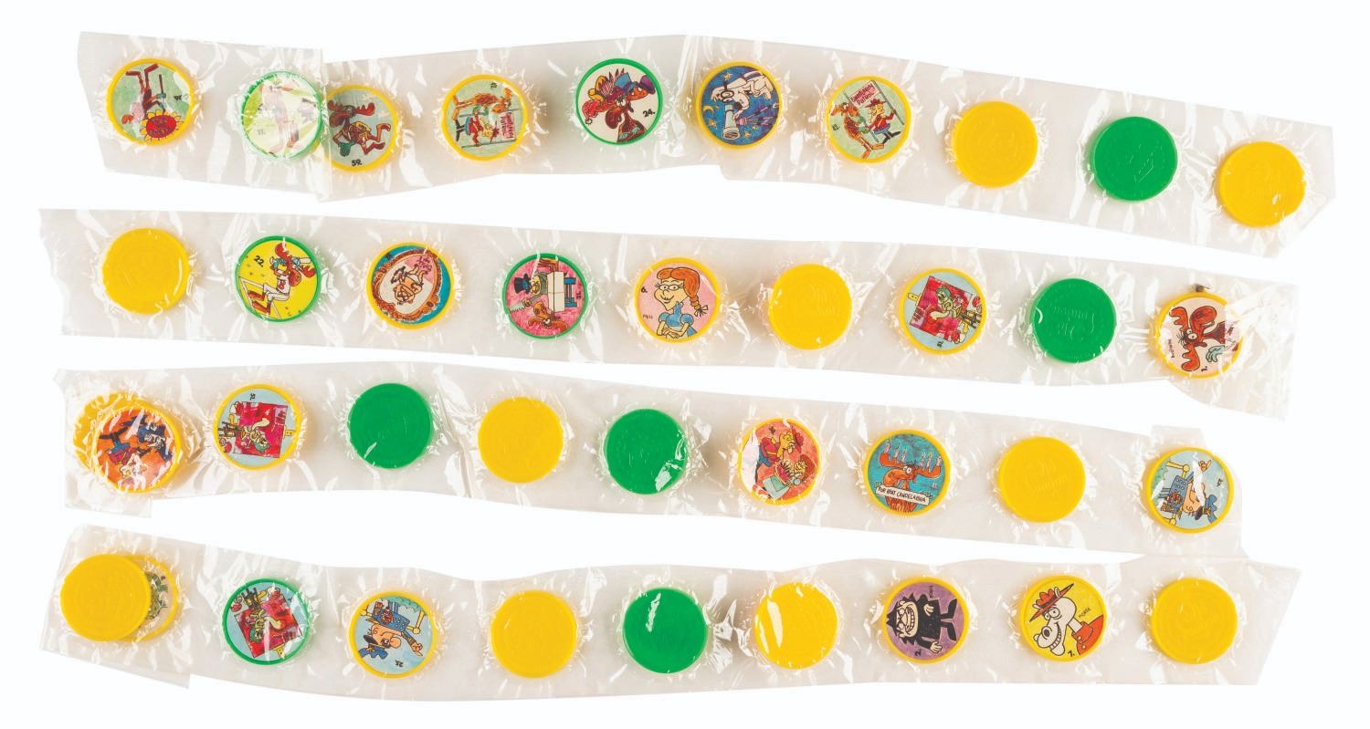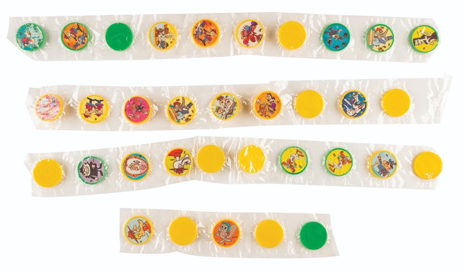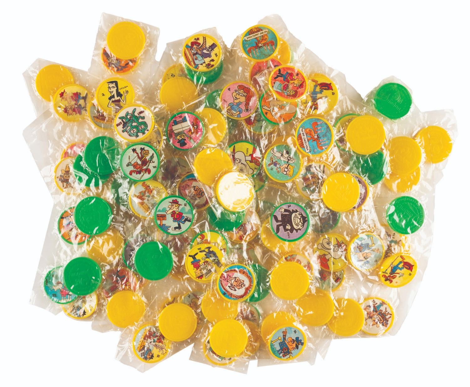 (Old London Foods, 1964) A collection of 126 rare Bullwinkle Trading Coins, originally offered as a giveaway with Dipsy Doodle snacks. Out of a numbered set of 60 total there are 48 different designs represented, with up to five duplicates of some included. The coins are in plastic strips of up to 10 each, not individually as released, making these uncirculated samples direct from the manufacturer. The plastic coins measure 1.25” in diameter each and are in fine condition, with the plastic wrap showing typical brittleness and wear from age.