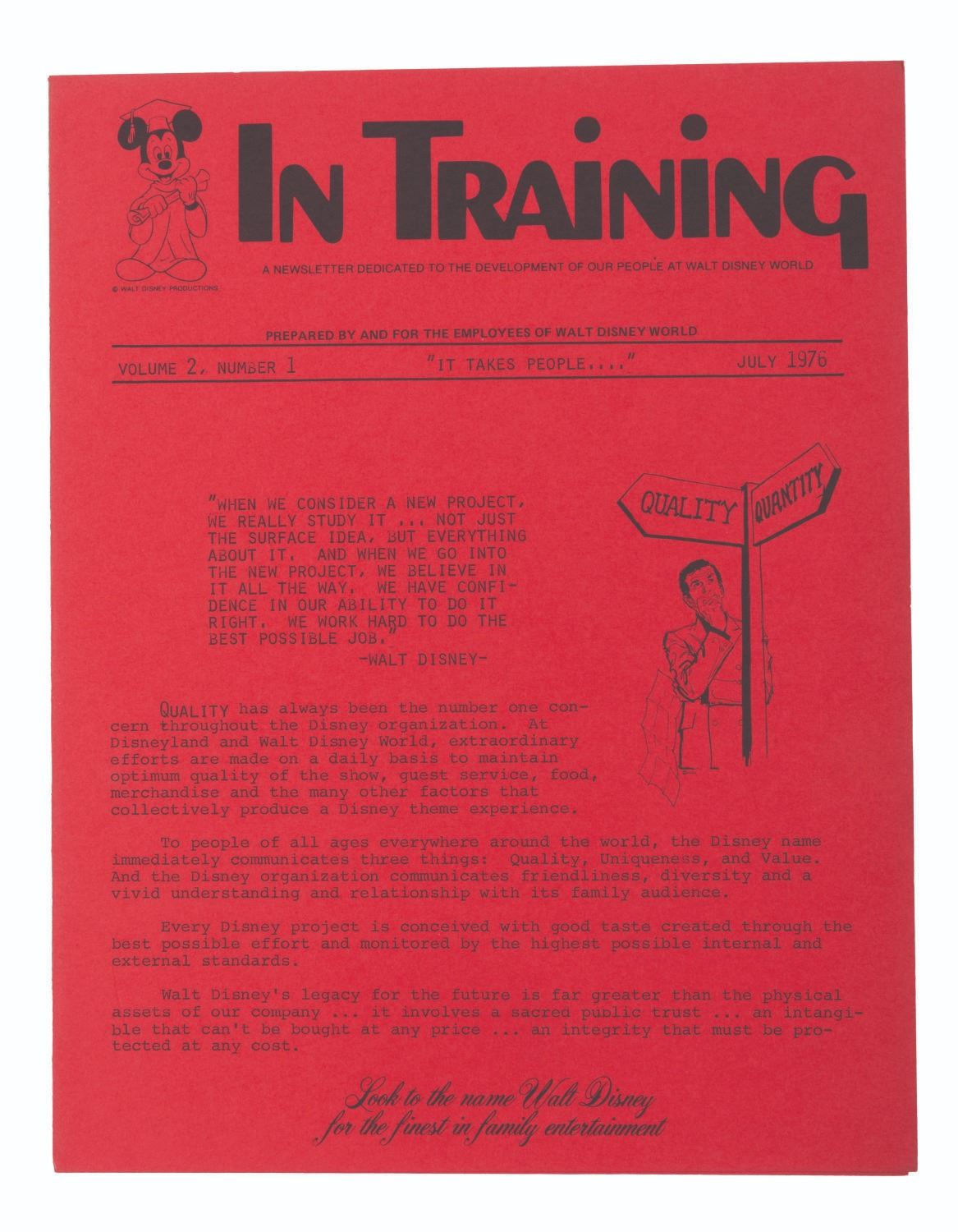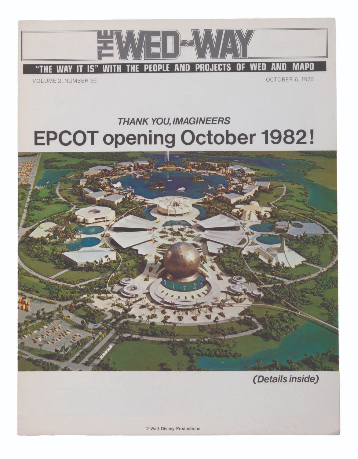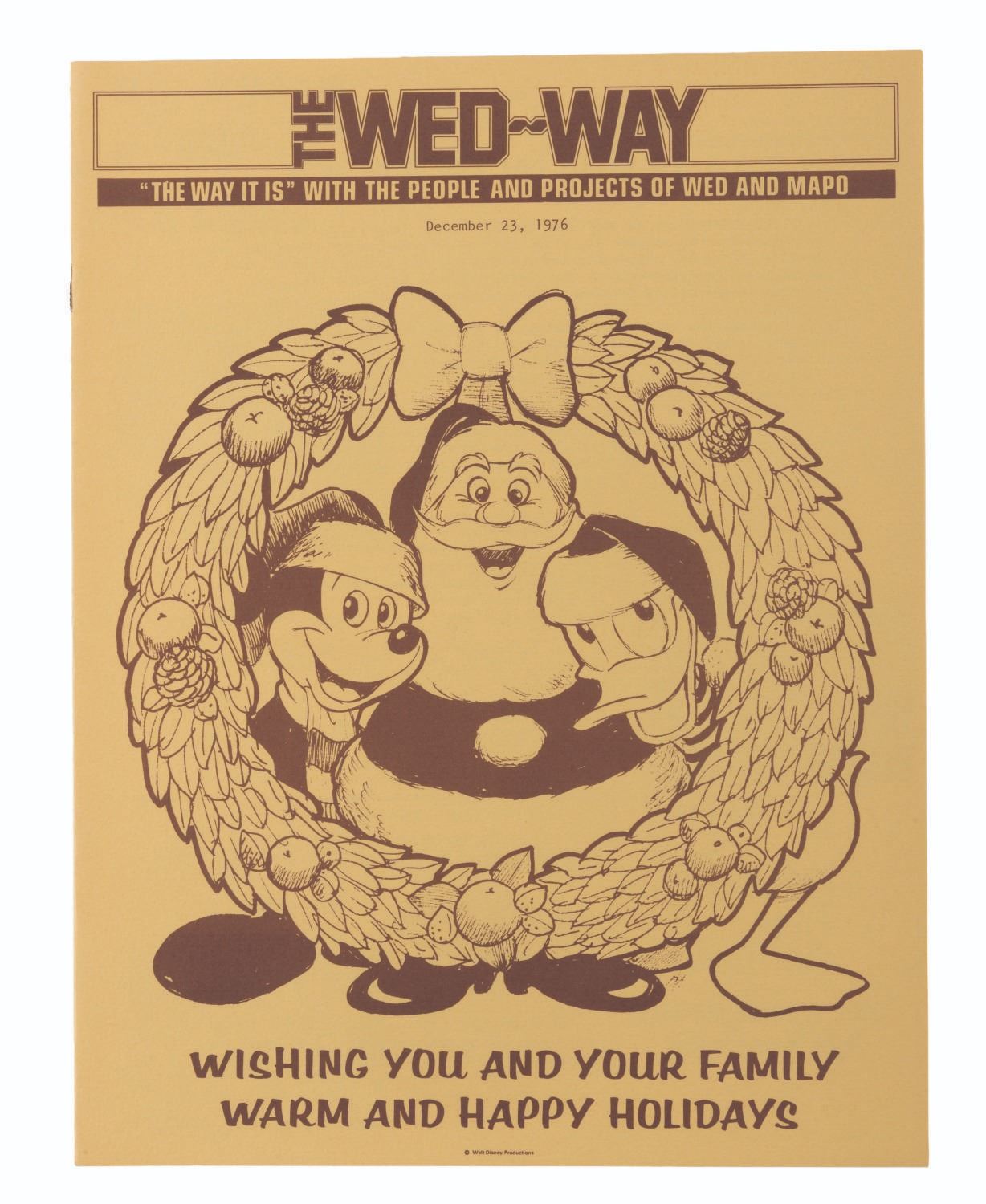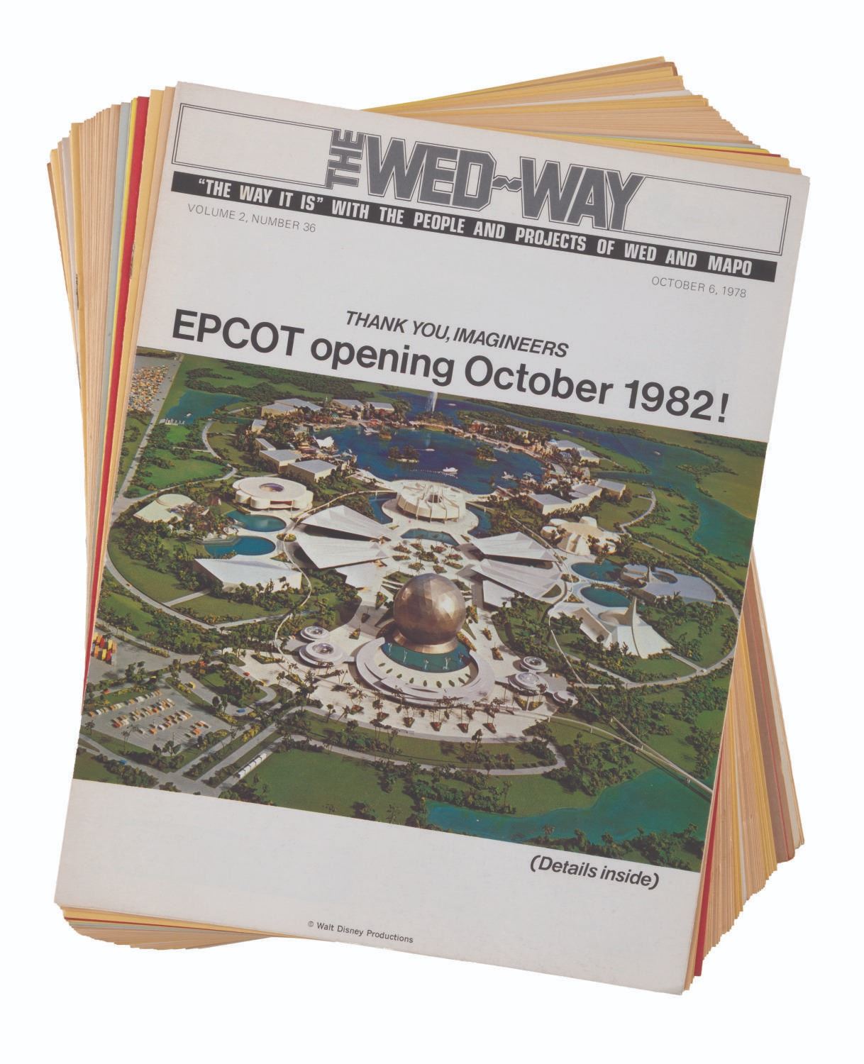 (Disney, 1975-78) A collection of 63 Cast Member publications. Included with duplicates are 16 different issues of The WED-Way from 1976 thru ‘78, 32 of Walt Disney World Showcase News from 1975 to ‘76, 13 issues of In Training from 1975 thru '77, one issue of Eyes and Ears from September 1976, and EPCOT: The Challenge and Commitment pamphlet. Measuring 8.5" x 11", the magazines are in good condition with light discoloration and soiling.