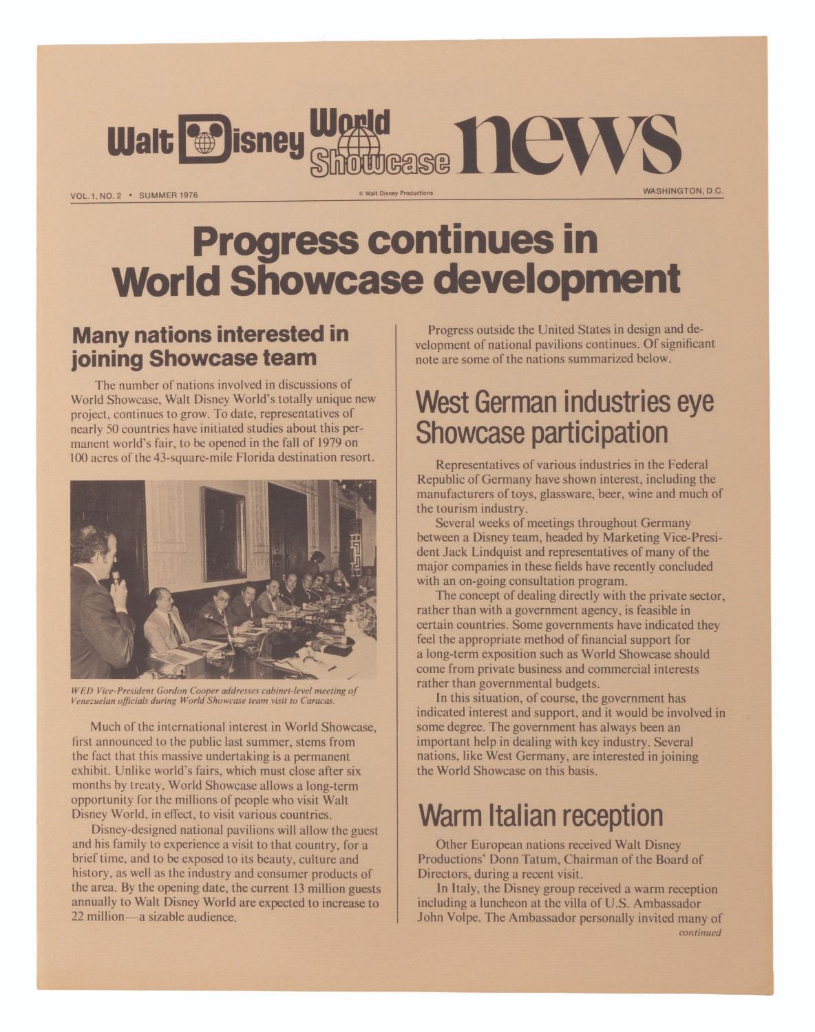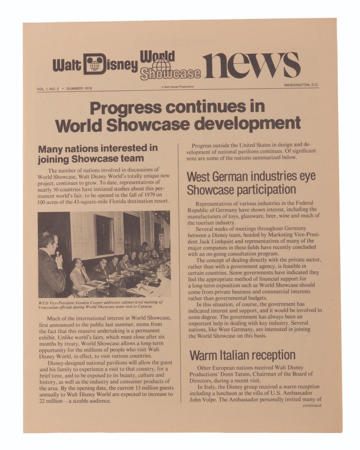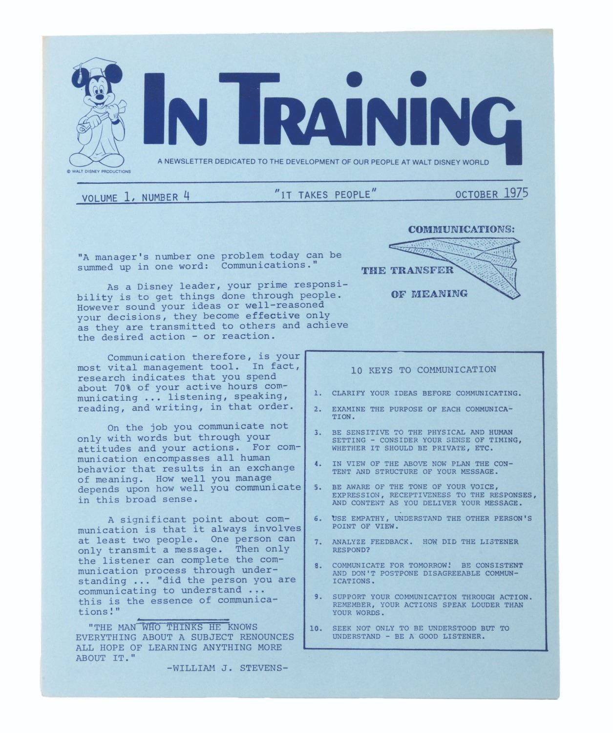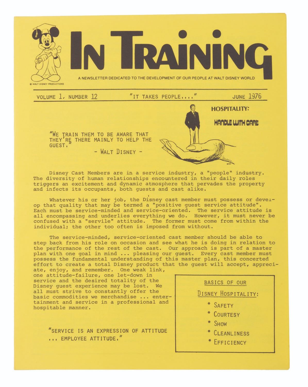 (Disney, 1975-78) A collection of 63 Cast Member publications. Included with duplicates are 16 different issues of The WED-Way from 1976 thru ‘78, 32 of Walt Disney World Showcase News from 1975 to ‘76, 13 issues of In Training from 1975 thru '77, one issue of Eyes and Ears from September 1976, and EPCOT: The Challenge and Commitment pamphlet. Measuring 8.5" x 11", the magazines are in good condition with light discoloration and soiling.
