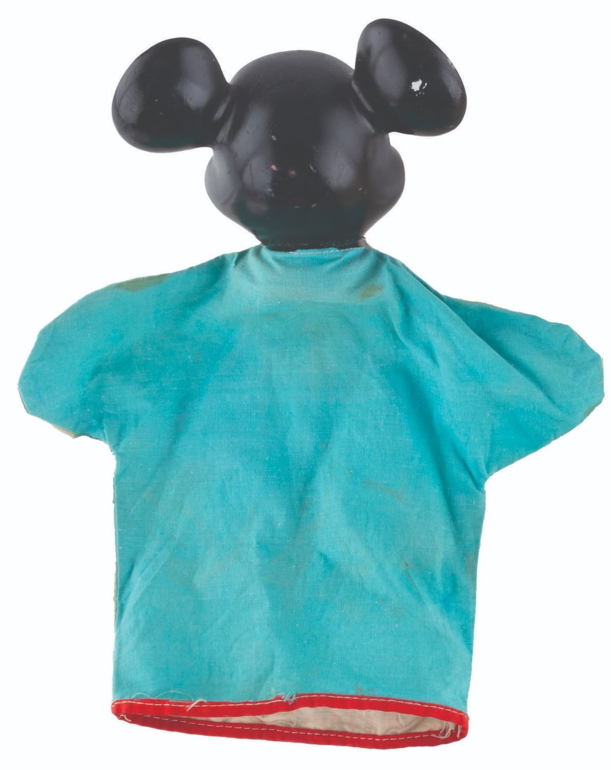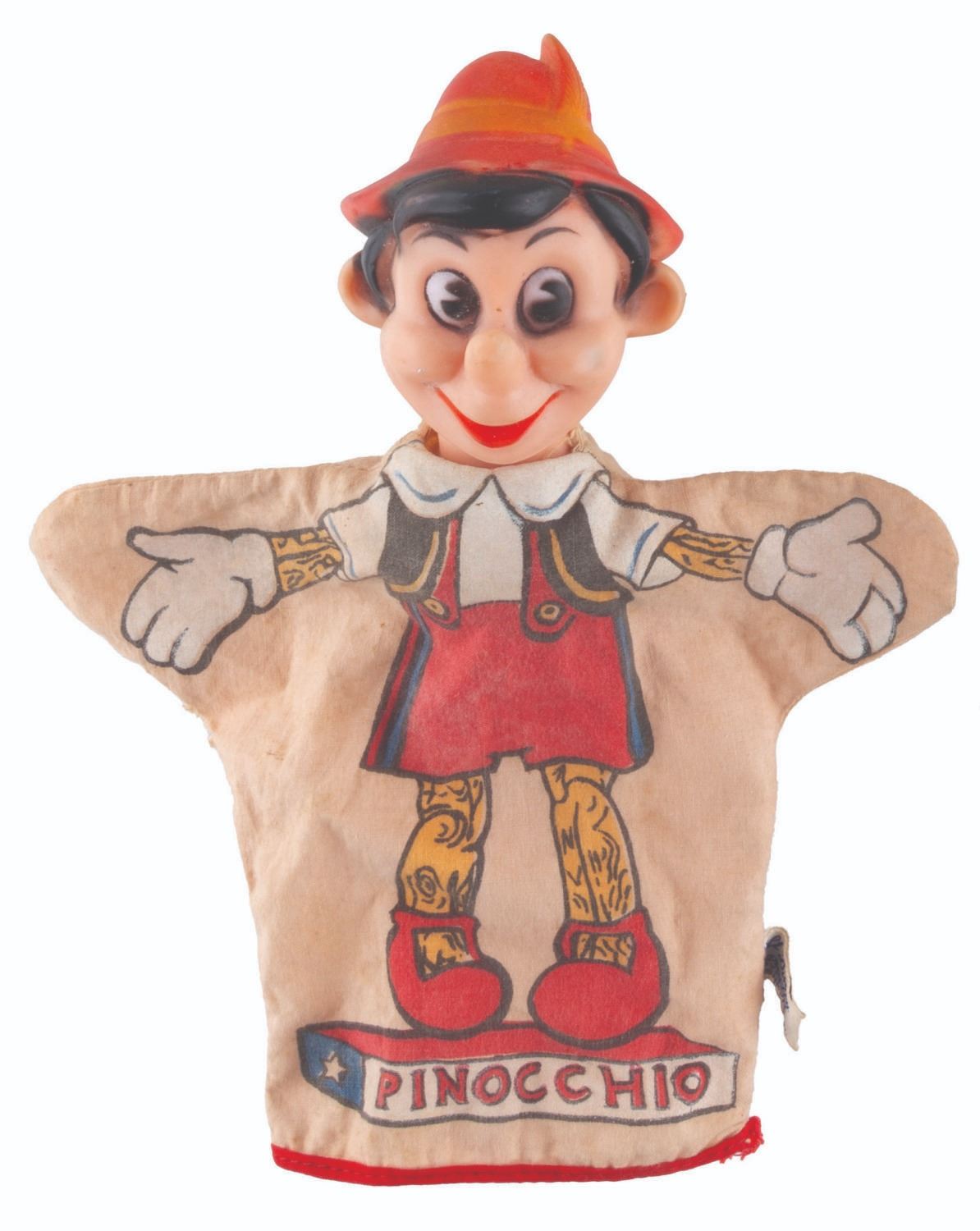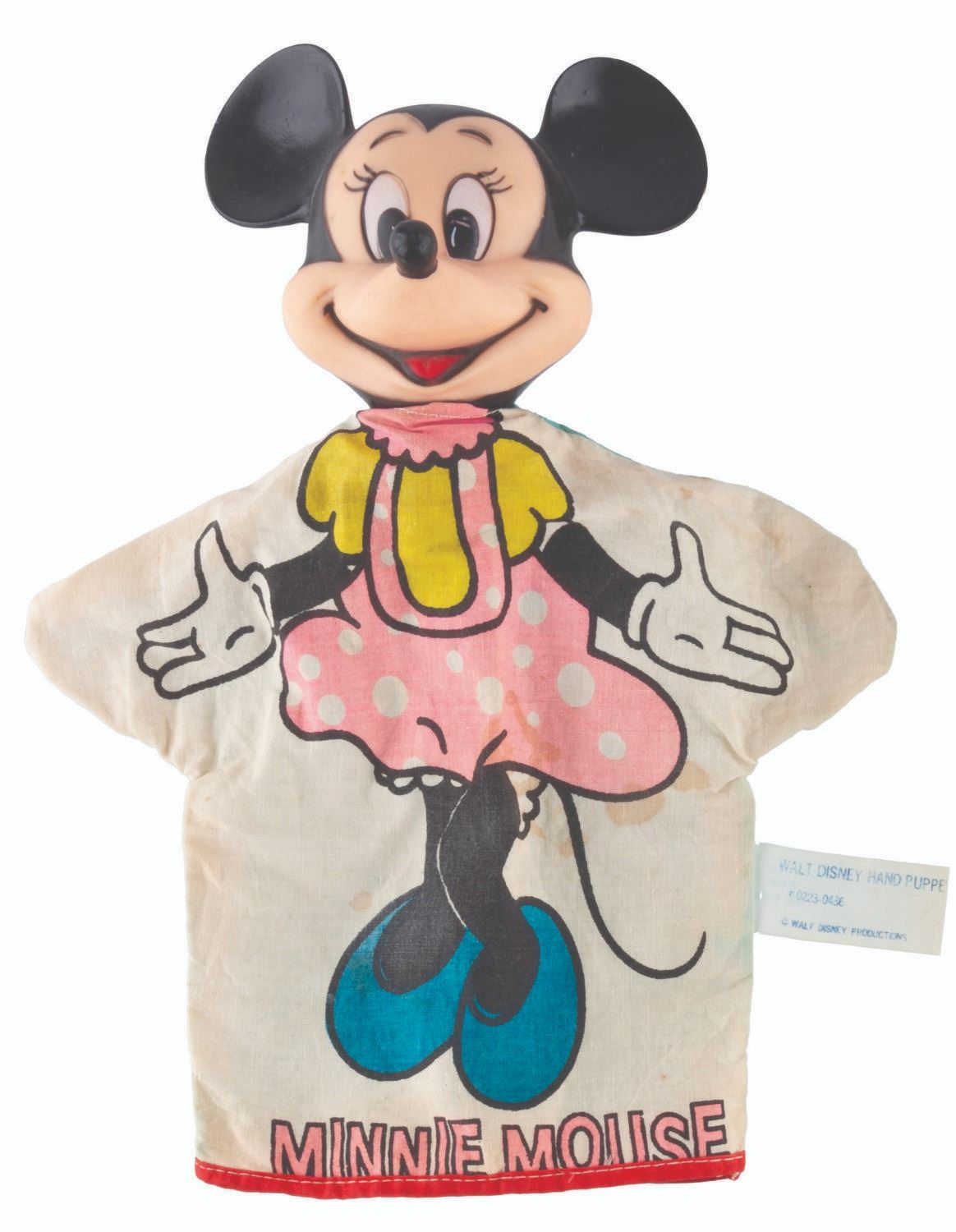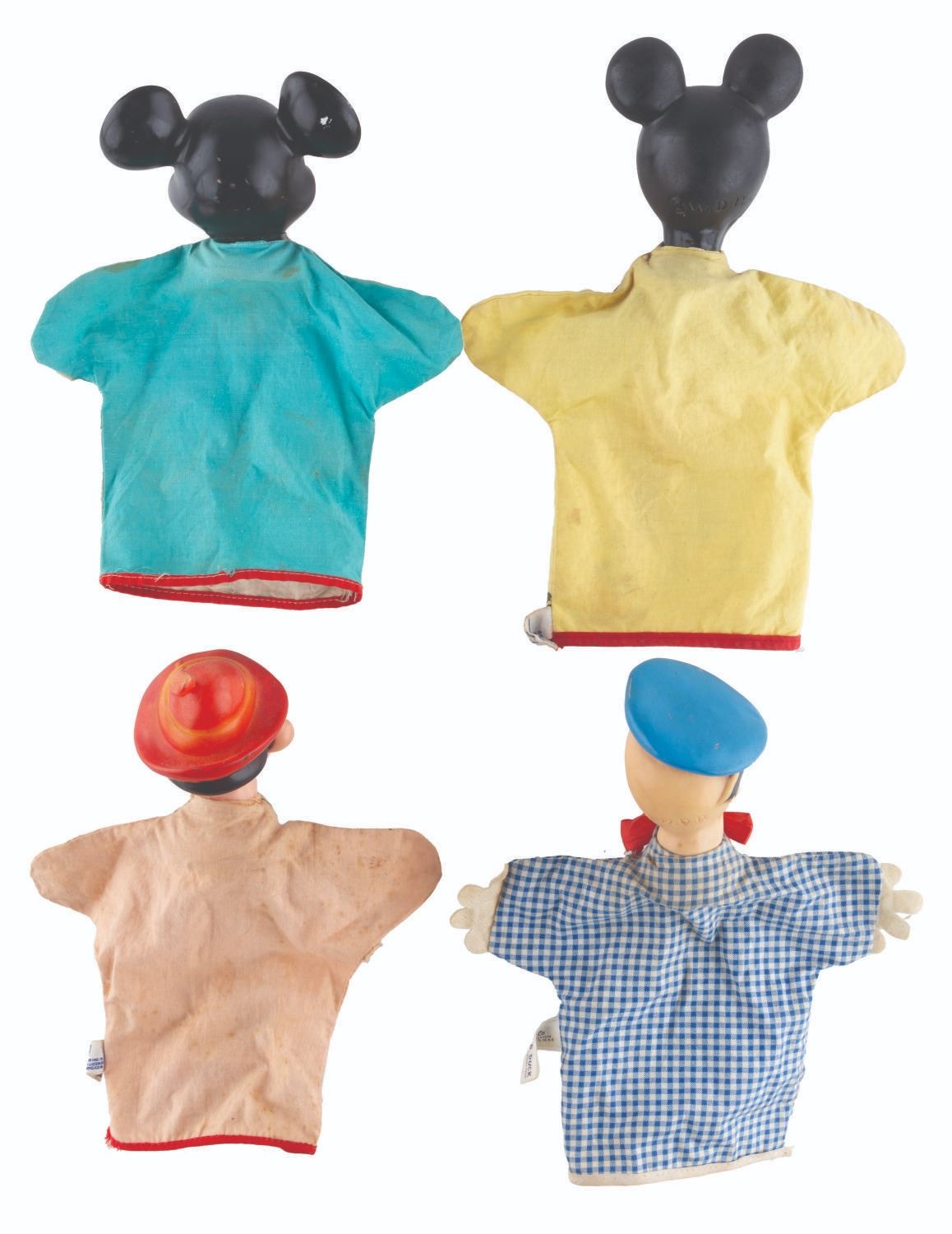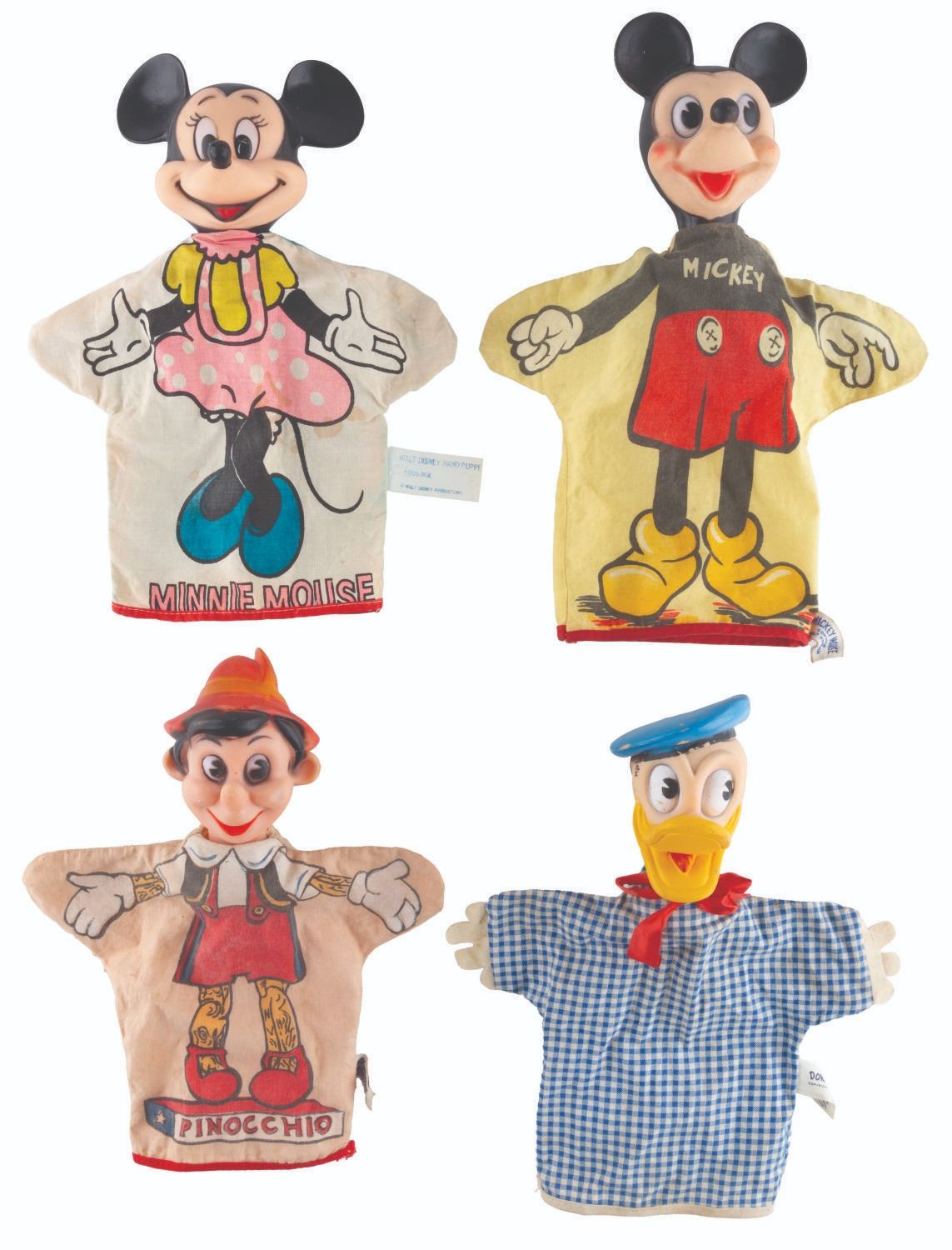 (Gund, 1950s-60s) A collection of four Disney character hand puppets by Gund. Included are Mickey, Minnie, Donald Duck, and Pinocchio. Ranging in size from 8” x 10” to 8.5” x 11”, the hand puppets are in good condition with discoloration from age, stains, paint loss, scuffs, and tears including a 2.25” tear at Minnie’s base.