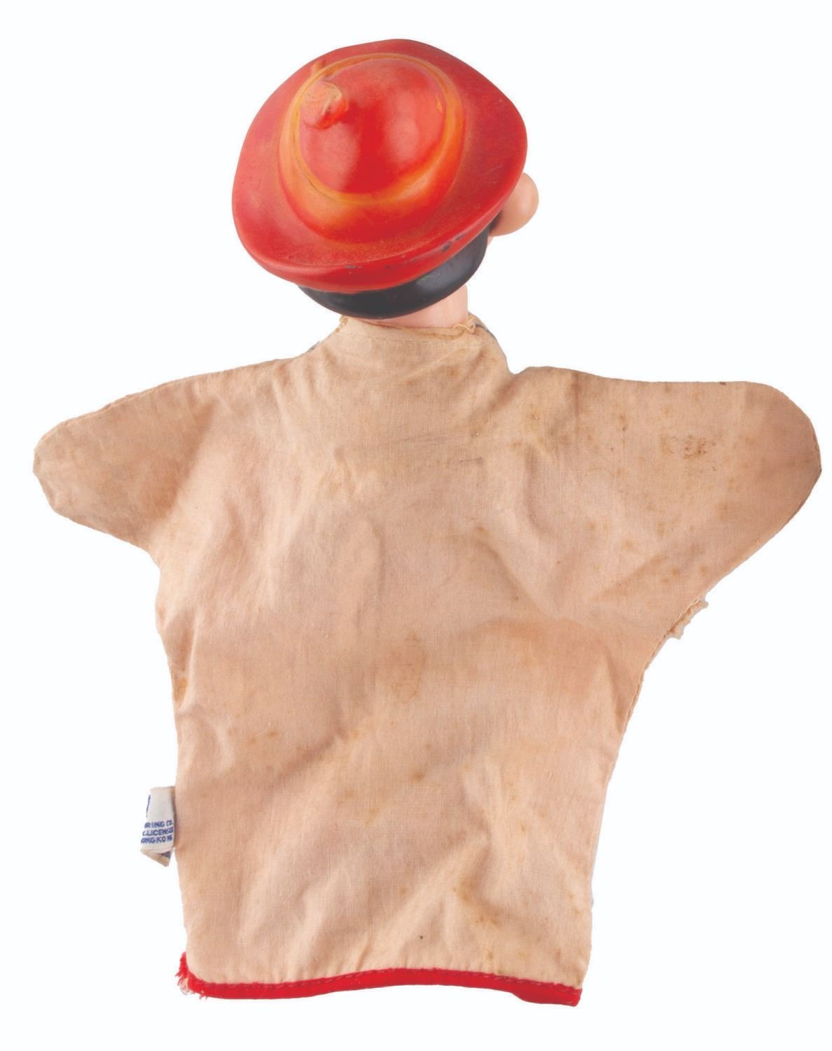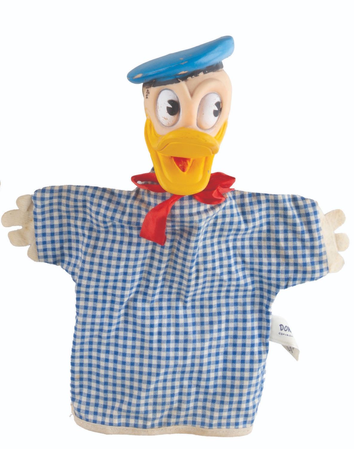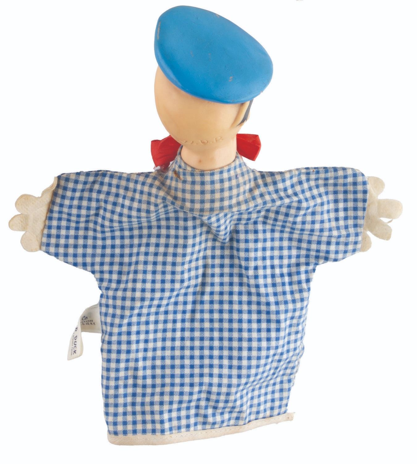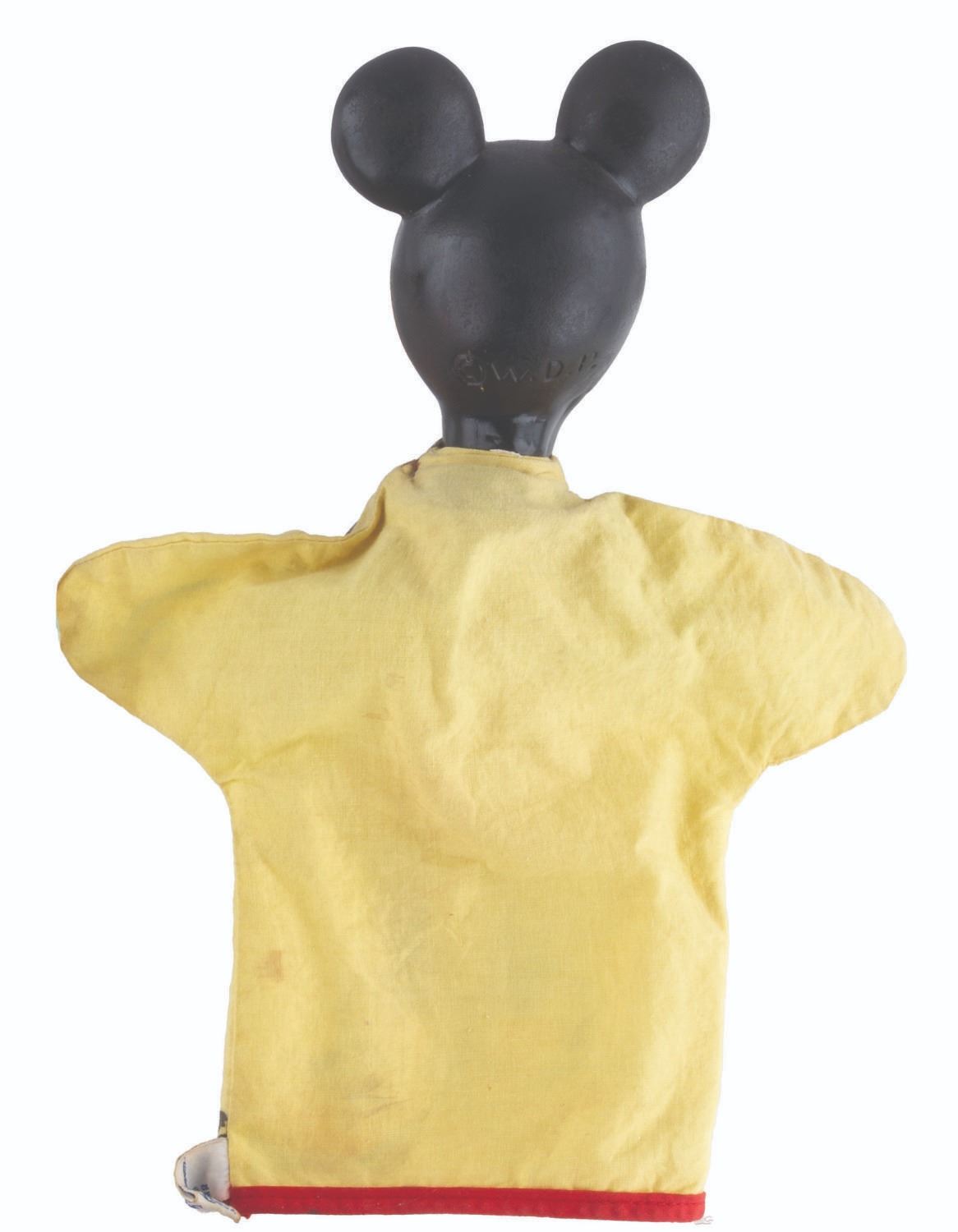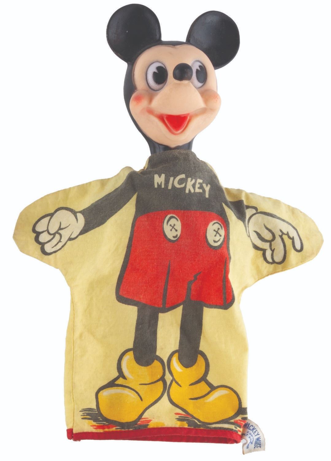 (Gund, 1950s-60s) A collection of four Disney character hand puppets by Gund. Included are Mickey, Minnie, Donald Duck, and Pinocchio. Ranging in size from 8” x 10” to 8.5” x 11”, the hand puppets are in good condition with discoloration from age, stains, paint loss, scuffs, and tears including a 2.25” tear at Minnie’s base.