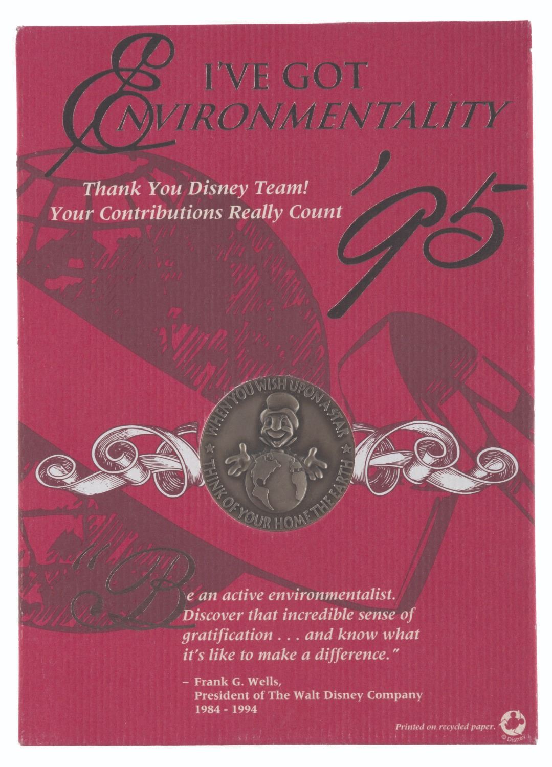 (Disneyland, 1994-1998) A collection of Disney internal environmental newsletters and a Jiminy Cricket coin. Included are the April 1994, 1996, and 1997 issues of Disney’s Enviroport, May and August 1996 Disneylandscaping newsletters, a January 1998 Disneyland Horticulture & Park Enhancement newsletter, and a 1995 coin in a display thanking the Disney team for contributions to the environment. Ranging in size from the 6.75” x 7” coin display to the 8.5” x 11” magazines, the lot is in very good to fine condition with light creases and wear.