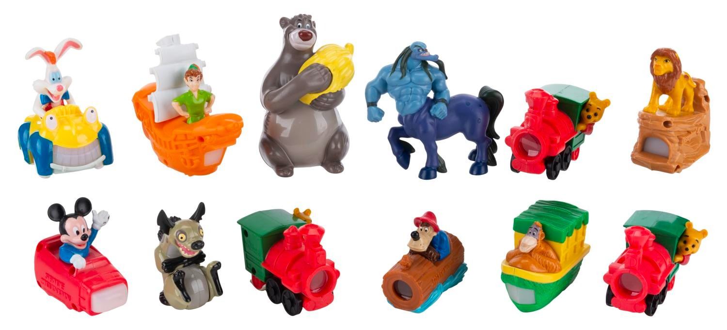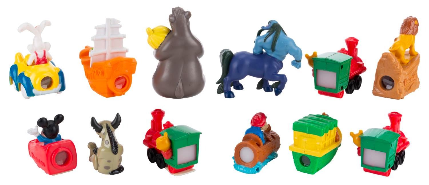 (McDonald's/Burger King, 1990s) A collection of 12 Disney toys, 11 of which were originally included in fast food kids' meals. Nine viewfinder toys are from Disneyland's 40th anniversary promotion at McDonald's and are themed to Space Mountain, Jungle Cruise, Fantasmic!, Roger Rabbit's Car Toon Spin, The Lion King Celebration, and Big Thunder Mountain Railroad with three duplicates. Also included are a McDonald's Baloo toy, Burger King Ed toy, and a toy of the centaur Nessus from "Hercules." Ranging in size from 2.75" x to 4" tall, the toys are in very good condition with wear and light paint loss from age.