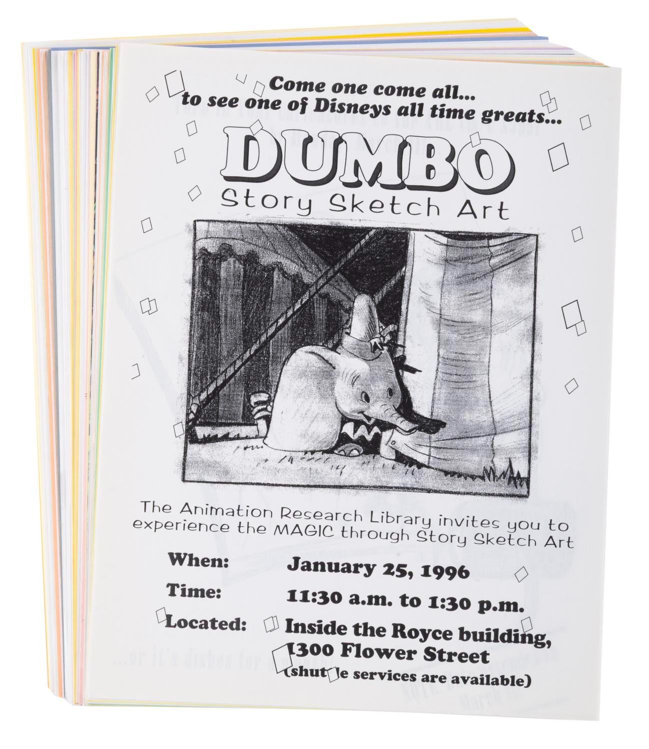 (Disney, 1995-96) A large collection of 50 flyers for Disney Feature Animation film screenings, trailers, sketch art, events, and artist showcases. Titles include "Dumbo, " "Sweating Bullets, " "Quack Pack, " and "Hercules. " Measuring 8.5 " x 11 " each, the flyers are in very good condition with light handling wear.