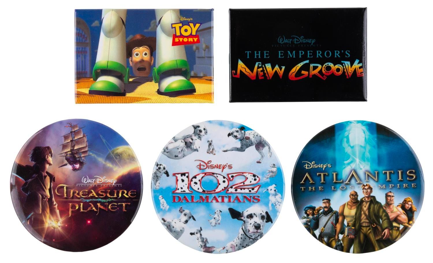 (Disney, 1990s-2000s) Five buttons for Disney films, including "Treasure Planet," "Atlantis," "The Emperor's New Groove," "Toy Story," and "102 Dalmatians." The buttons are in very good condition with some light handling wear.