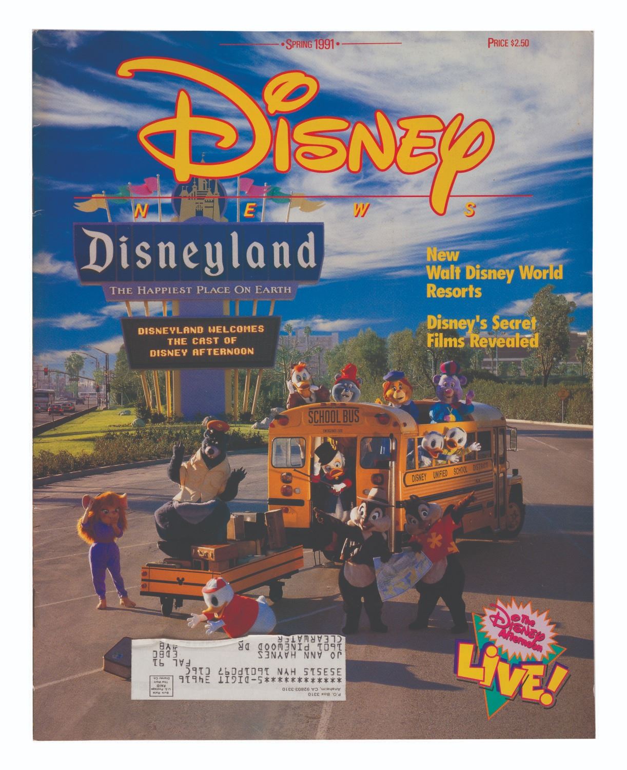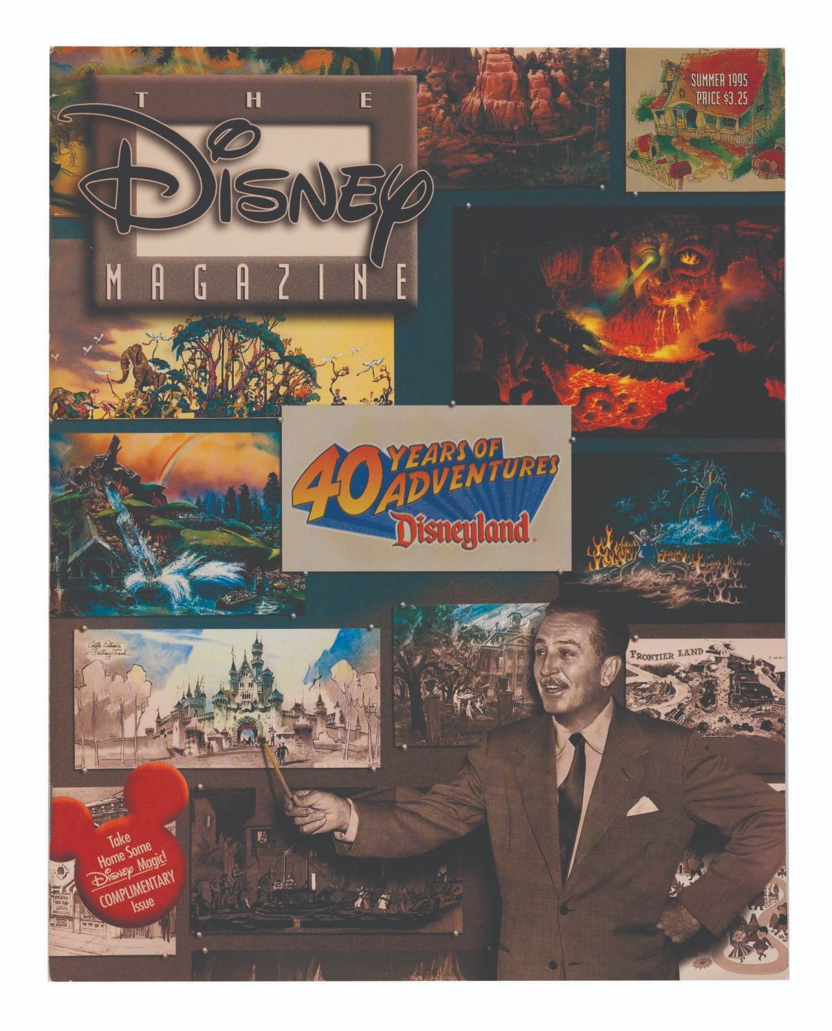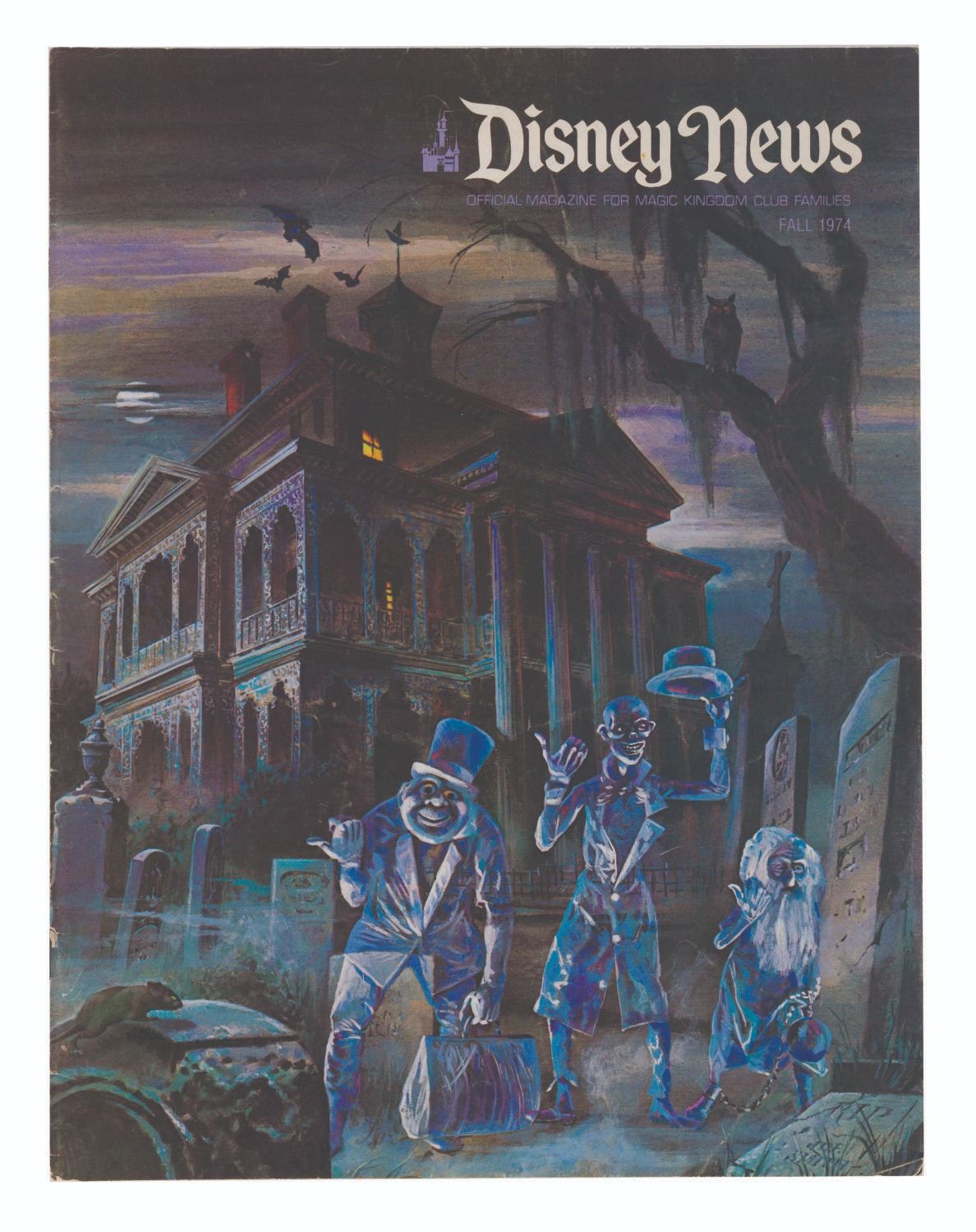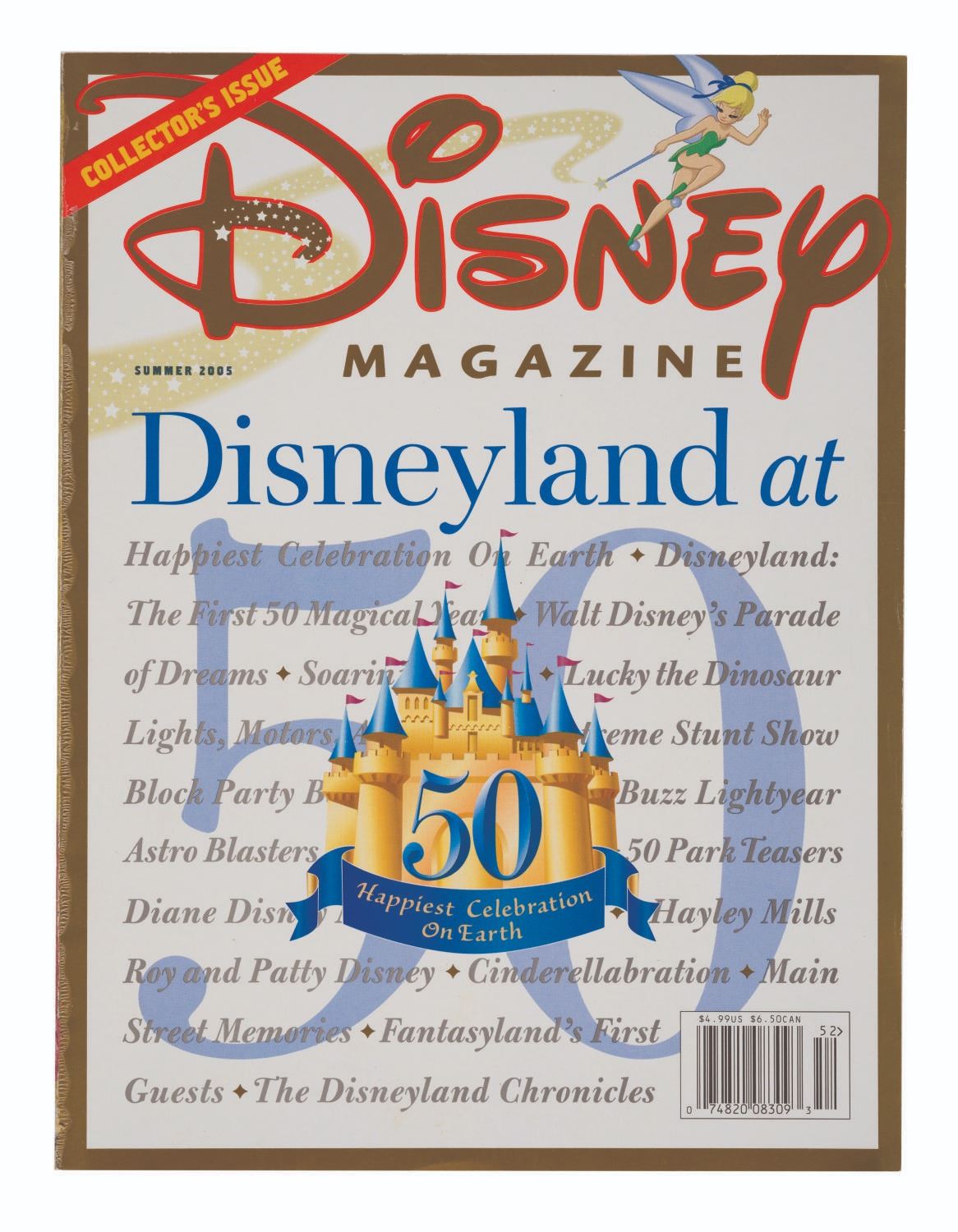 (Disney, 1974-2005) A collection of 50 issues of Disney News and Disney Magazines, spanning 31 years of Disney history. The earliest is the Fall 1974 issue of Disney News with the iconic Haunted Mansion cover, with the latest Disney Magazine from Summer 2005 celebrating Disneyland's 50th anniversary. Included in the span are eight duplicates, for a total of 42 unique issues. All the magazines measure 9"x 11", with most in good to very good condition, with expected wear from use.
