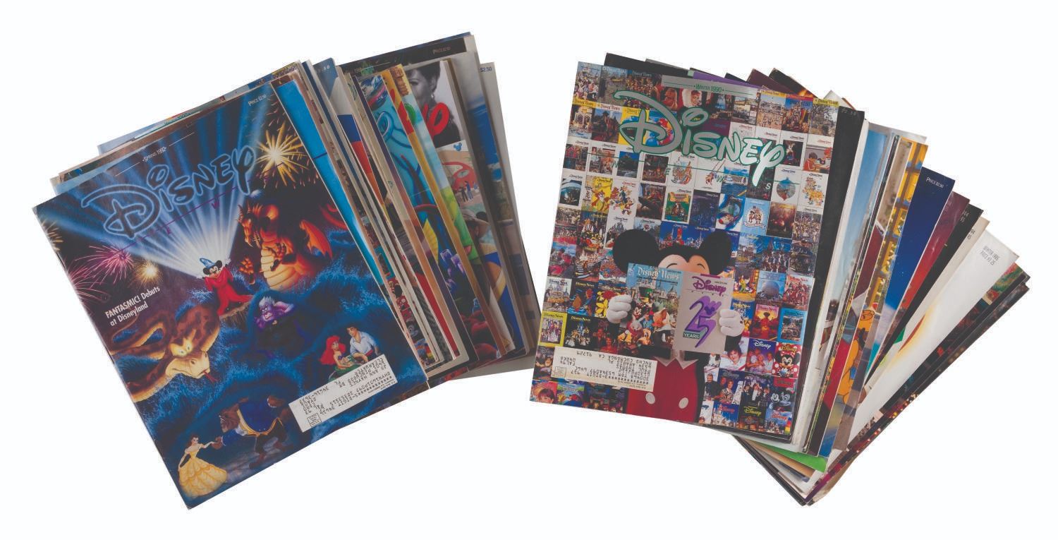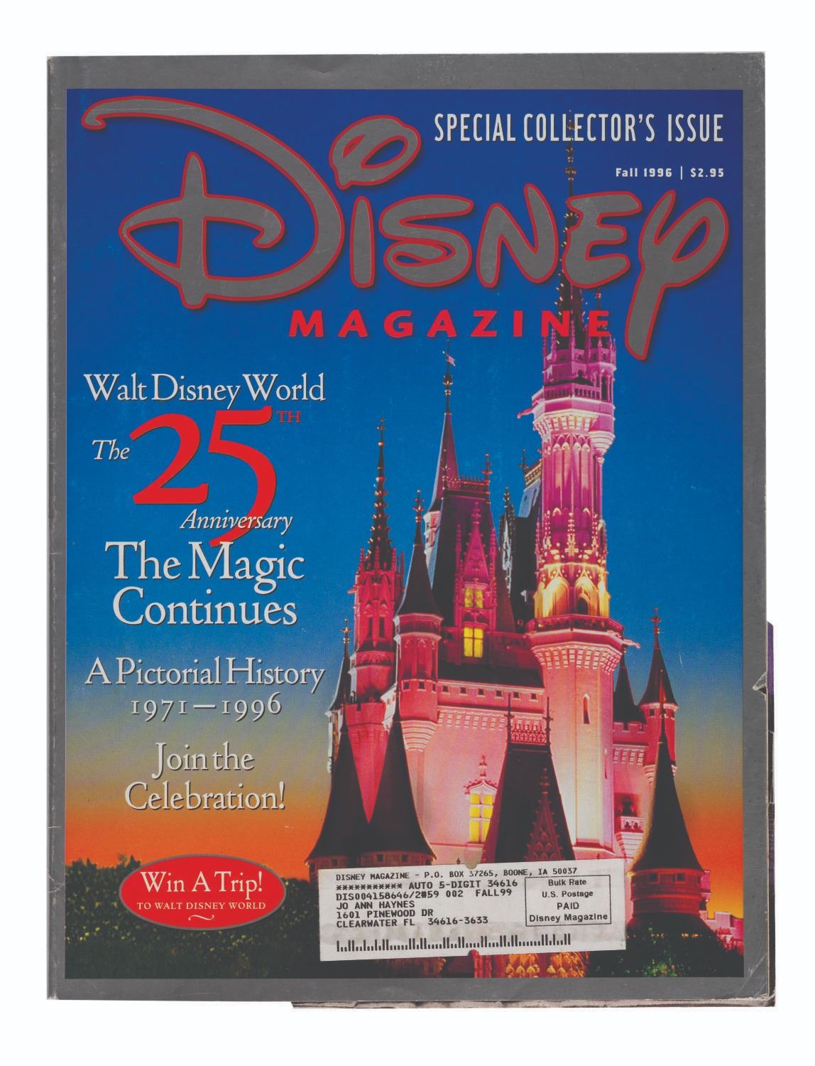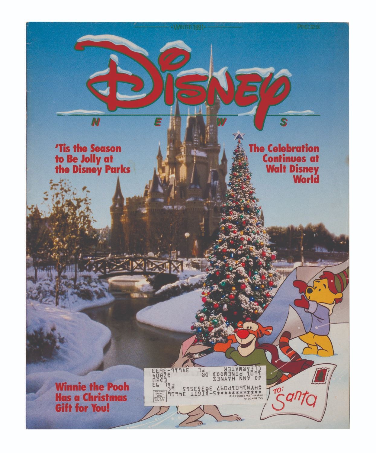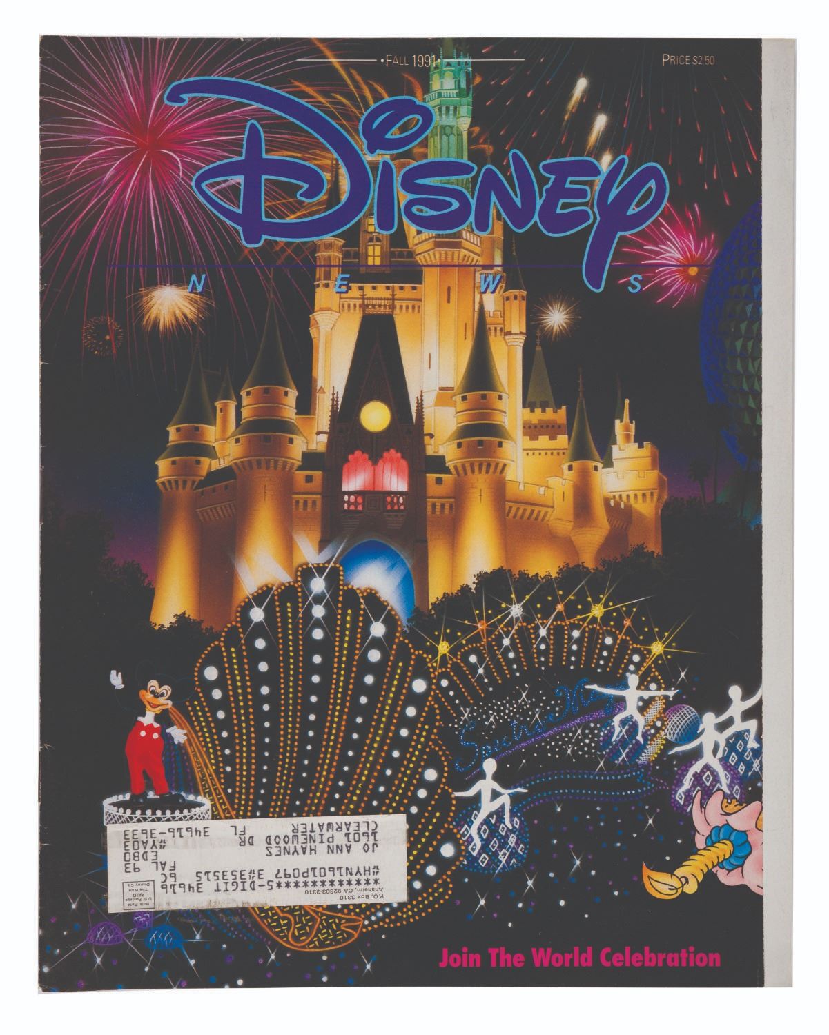 (Disney, 1974-2005) A collection of 50 issues of Disney News and Disney Magazines, spanning 31 years of Disney history. The earliest is the Fall 1974 issue of Disney News with the iconic Haunted Mansion cover, with the latest Disney Magazine from Summer 2005 celebrating Disneyland's 50th anniversary. Included in the span are eight duplicates, for a total of 42 unique issues. All the magazines measure 9"x 11", with most in good to very good condition, with expected wear from use.