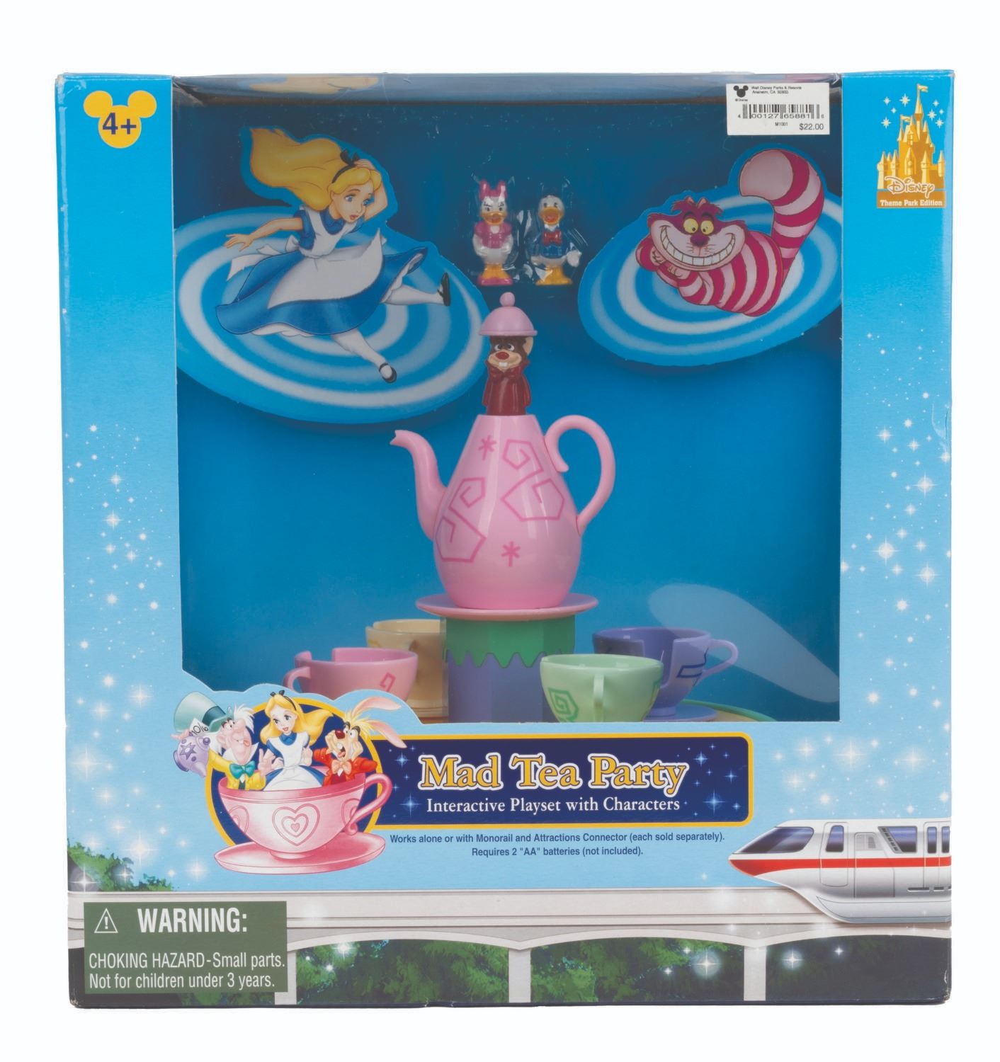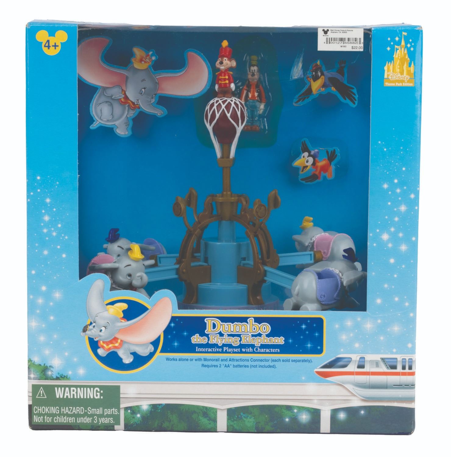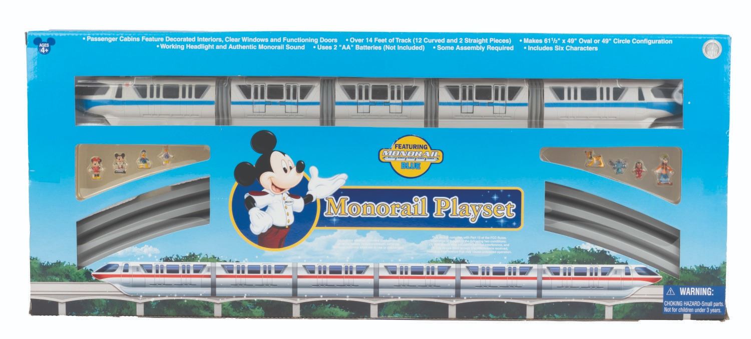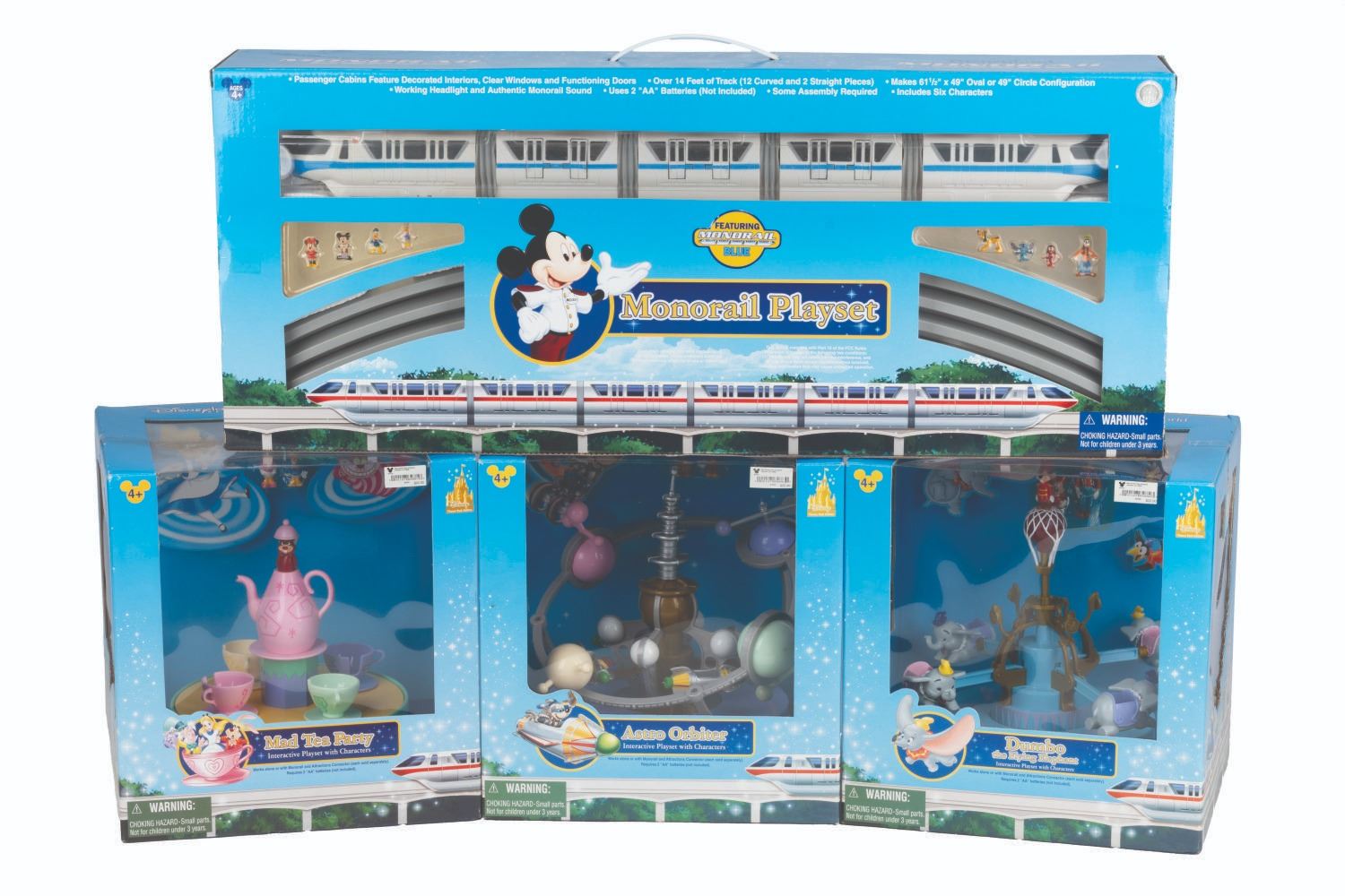 (Disneyland/Walt Disney World, 2000s) A collection of four Disneyland and Walt Disney World interactive playsets. Included are plastic recreations of Dumbo the Flying Elephant, Astro Orbiter, Mad Tea Party, and the blue Walt Disney World Monorail. The sets feature miniature figures of the Fab Five, Daisy Duck, Lilo, and Stitch. The sets require two AA batteries to work (not included), and some assembly is required. Still intact in their unopened original packaging ranging in size from 10.5” x 8.75” x 11” tall to 27” x 4.75” x 11.25” tall, the playsets appear to be in fine condition.