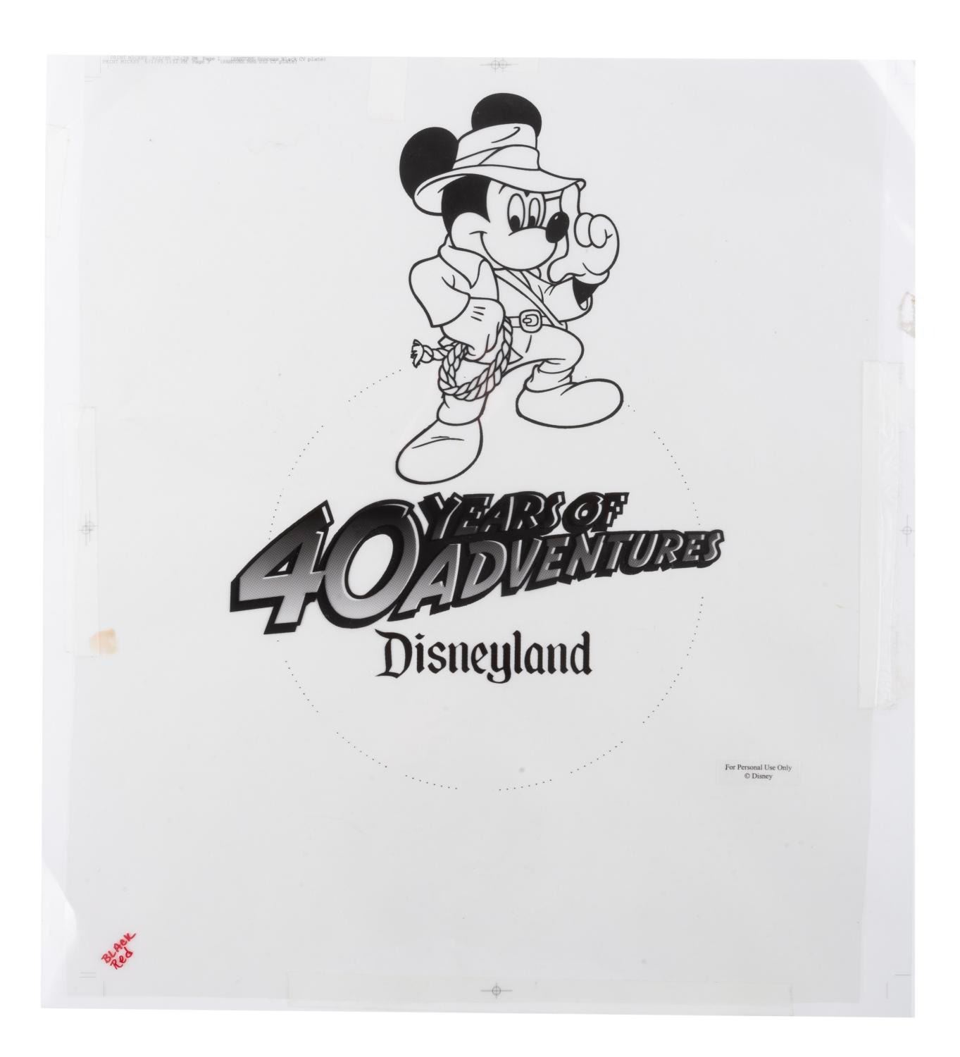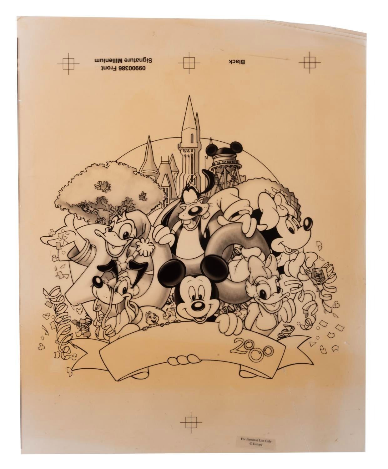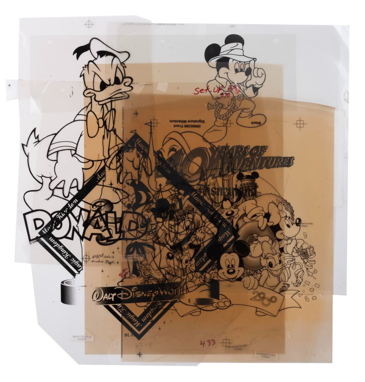 (Disney Parks, 1990s) A collection of six transparencies used to create silkscreens for producing Disney Parks T-shirts. Included are transparencies featuring Donald Duck, Sorcerer Mickey for Walt Disney World's 25th Anniversary, Mickey and Friends for Walt Disney World's Millennium Celebration, Grumpy, and two black and red plate transparencies of Mickey as Indiana Jones for Disneyland's 40th Anniversary. Measuring between 10.5" x 18.75" to 18.25" x 20.5", the transparencies are in good condition with wear, creasing, and pieces of tape typical of production use.