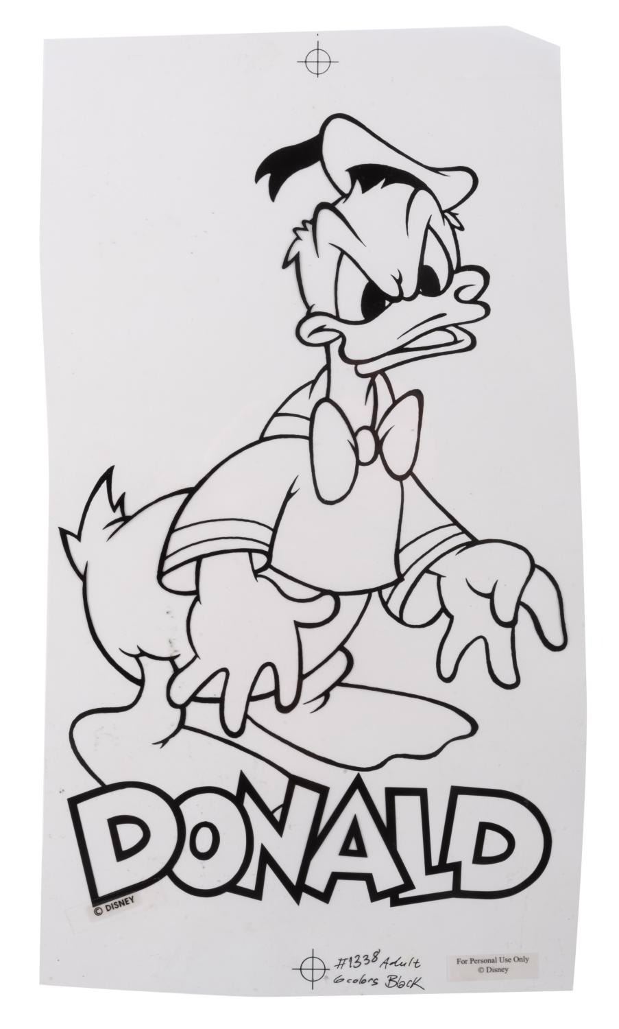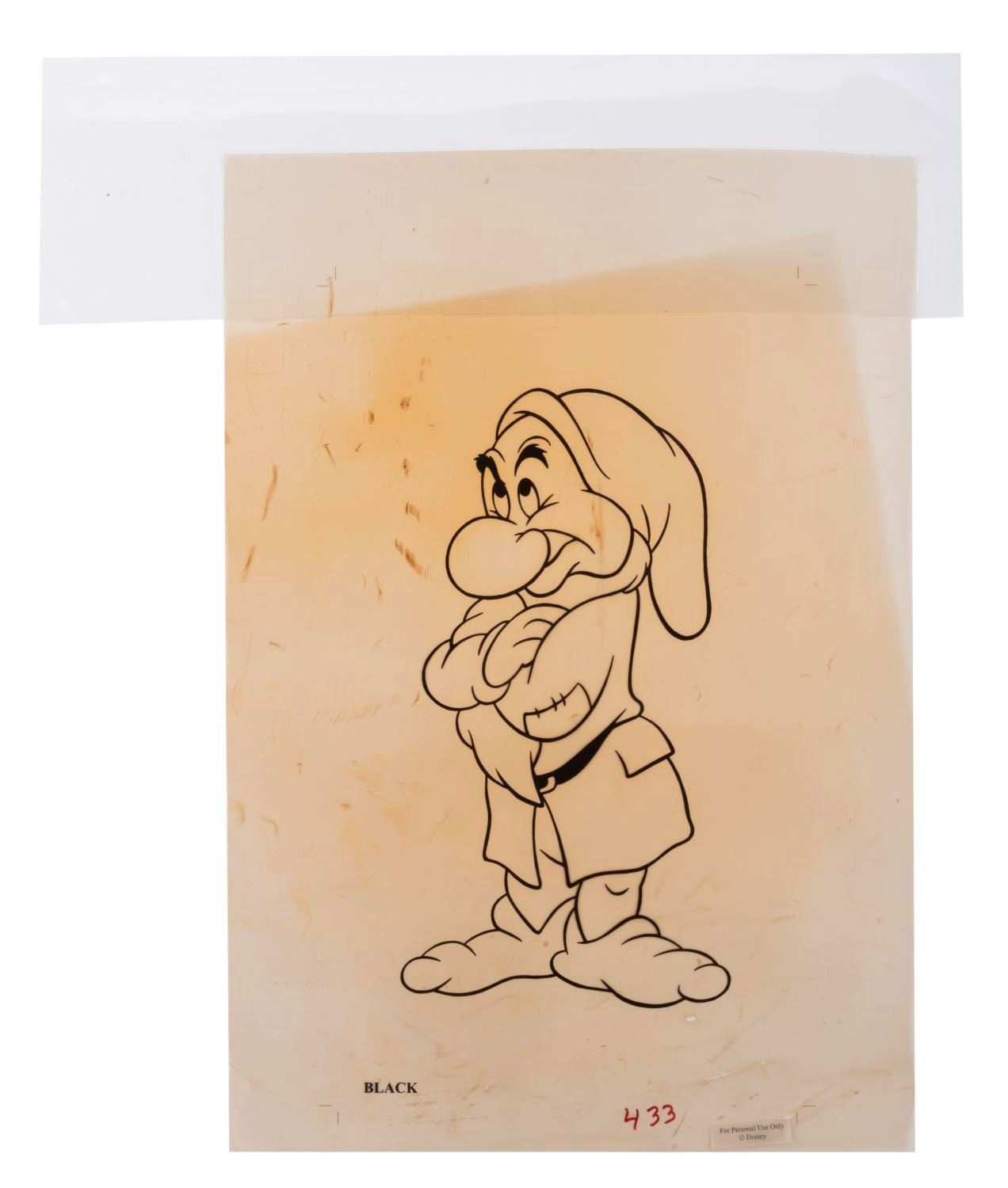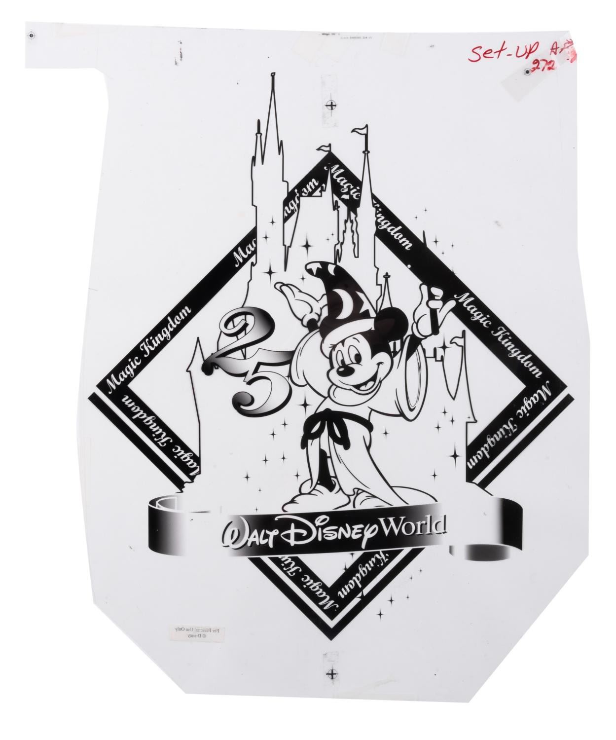 (Disney Parks, 1990s) A collection of six transparencies used to create silkscreens for producing Disney Parks T-shirts. Included are transparencies featuring Donald Duck, Sorcerer Mickey for Walt Disney World's 25th Anniversary, Mickey and Friends for Walt Disney World's Millennium Celebration, Grumpy, and two black and red plate transparencies of Mickey as Indiana Jones for Disneyland's 40th Anniversary. Measuring between 10.5" x 18.75" to 18.25" x 20.5", the transparencies are in good condition with wear, creasing, and pieces of tape typical of production use.