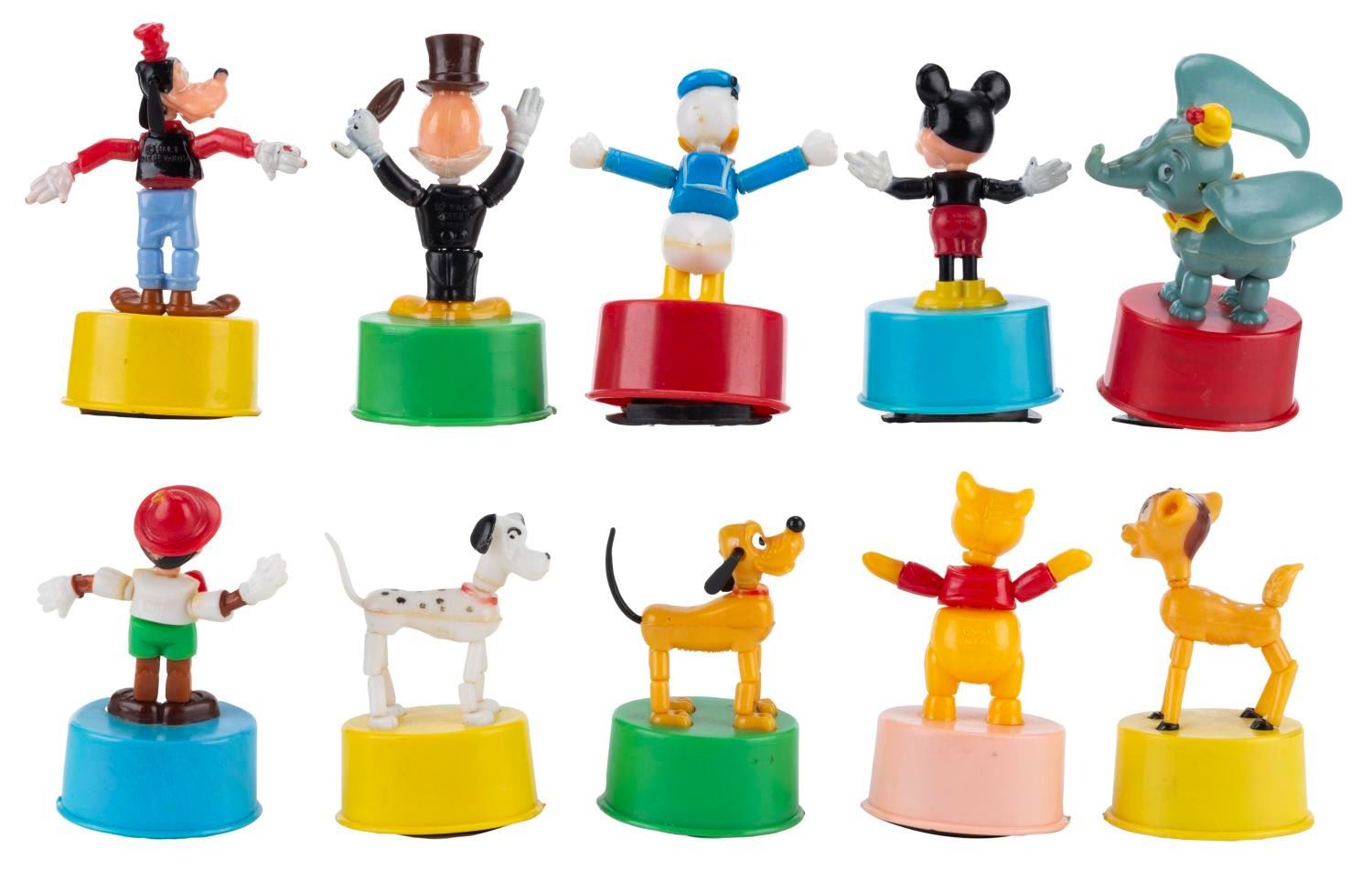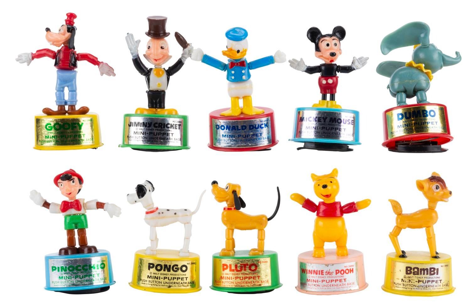 (Disney, 1960s) A set of ten Disney "push" mini puppets. Included are Mickey, Goofy, Donald, Pooh, Pluto, Pinocchio, Jiminy Cricket, Dumbo, Bambi, and Pongo. The puppets are in very good to fine condition.