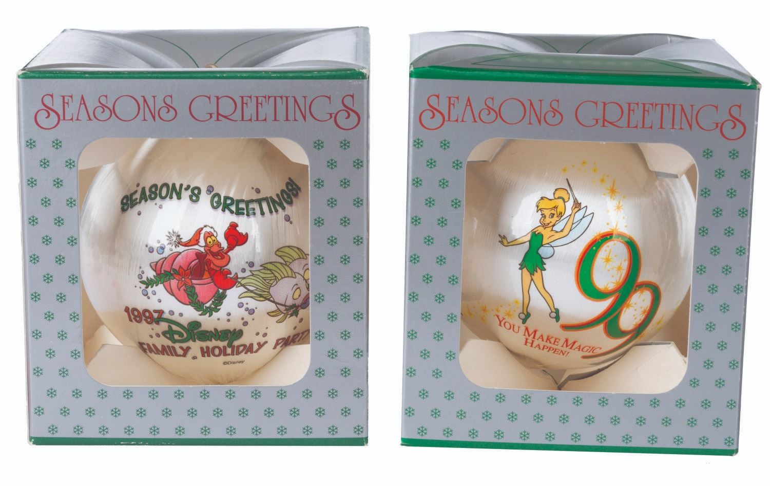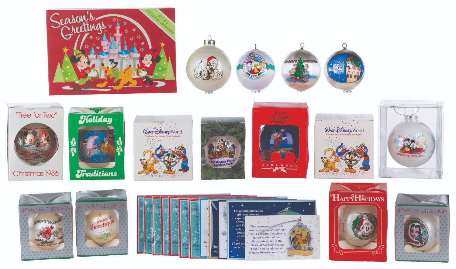 (Disney, 1986-2016) A collection of thirty-four Disney Studio Cast Member and Walt Disney Imagineering holiday ornaments, mostly from the company's annual Family Holiday Celebration. Included are fifteen ball ornaments, six decoupage ornaments in their original box, and thirteen 2009-2016 Family Holiday Celebration ornaments—one loose and twelve in their original packaging, with seven of them duplicates of the 2013 ornament. Measuring from 1.75" x 2.5" to 3" x 3.25", the ornaments are all in very good to fine condition with light surface wear.