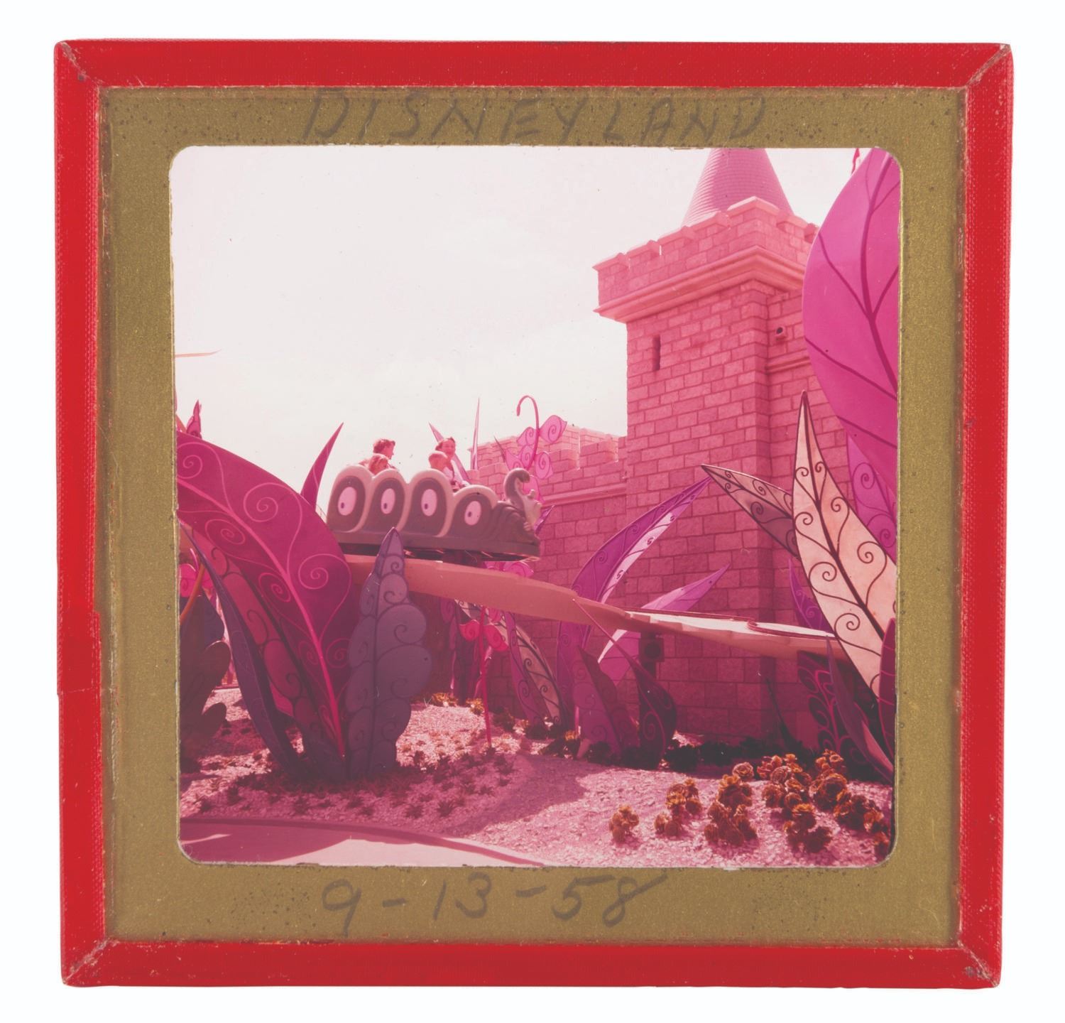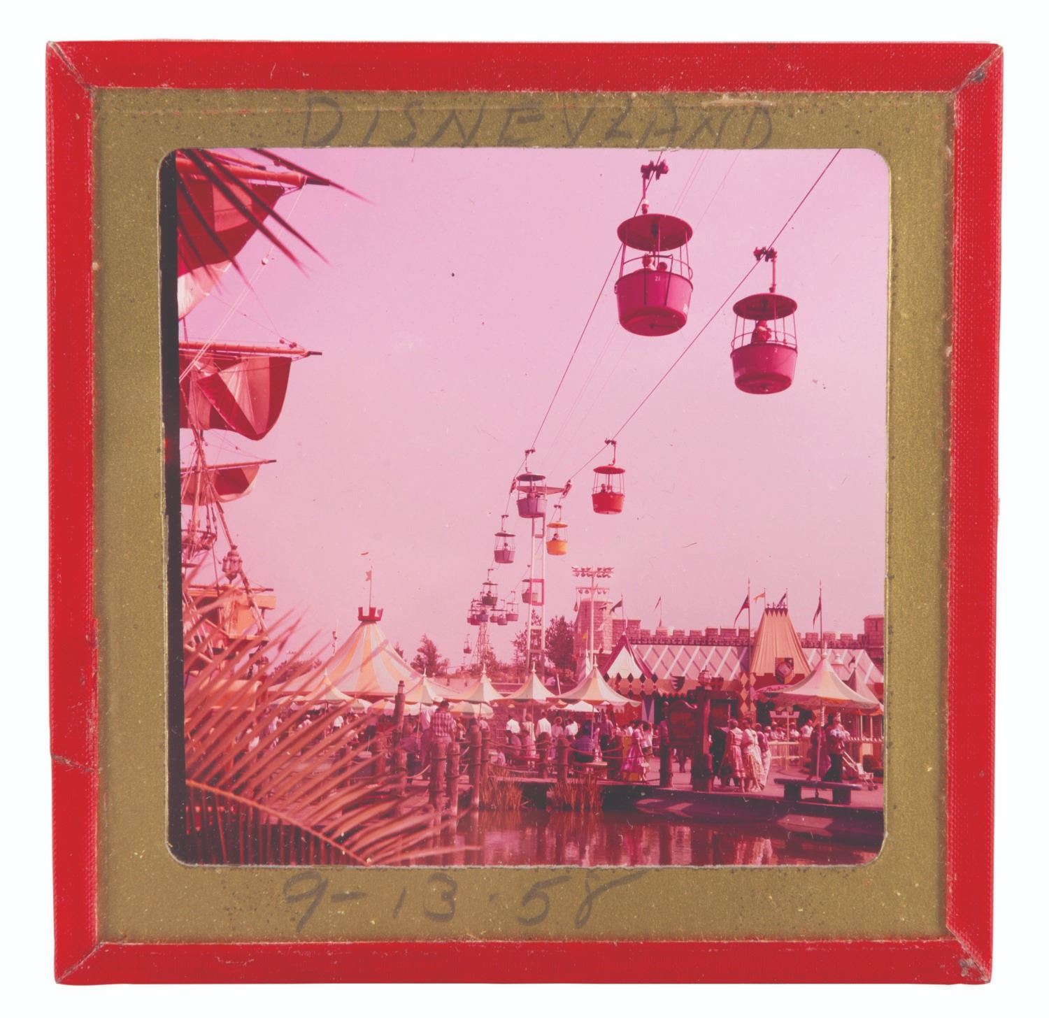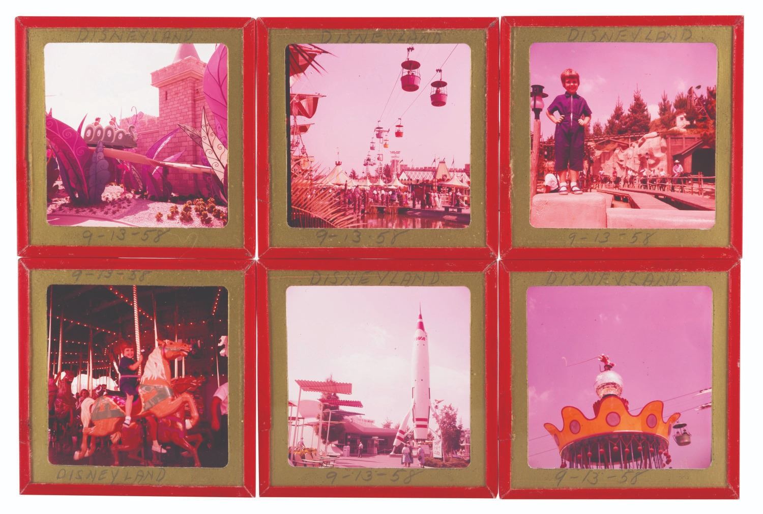(Disneyland, 1958) A collection of six amateur color slides taken at Disneyland on August 13th, 1958. The set includes images of Tomorrowland, the Dumbo ride, Skybuckets, the Alice in Wonderland ride, the Pack Mules, and the King Arthur Carrousel. Each measuring 2.75" x 2.75", the slides are in very good condition showing a magenta shift typical of color-positive film of that era.
