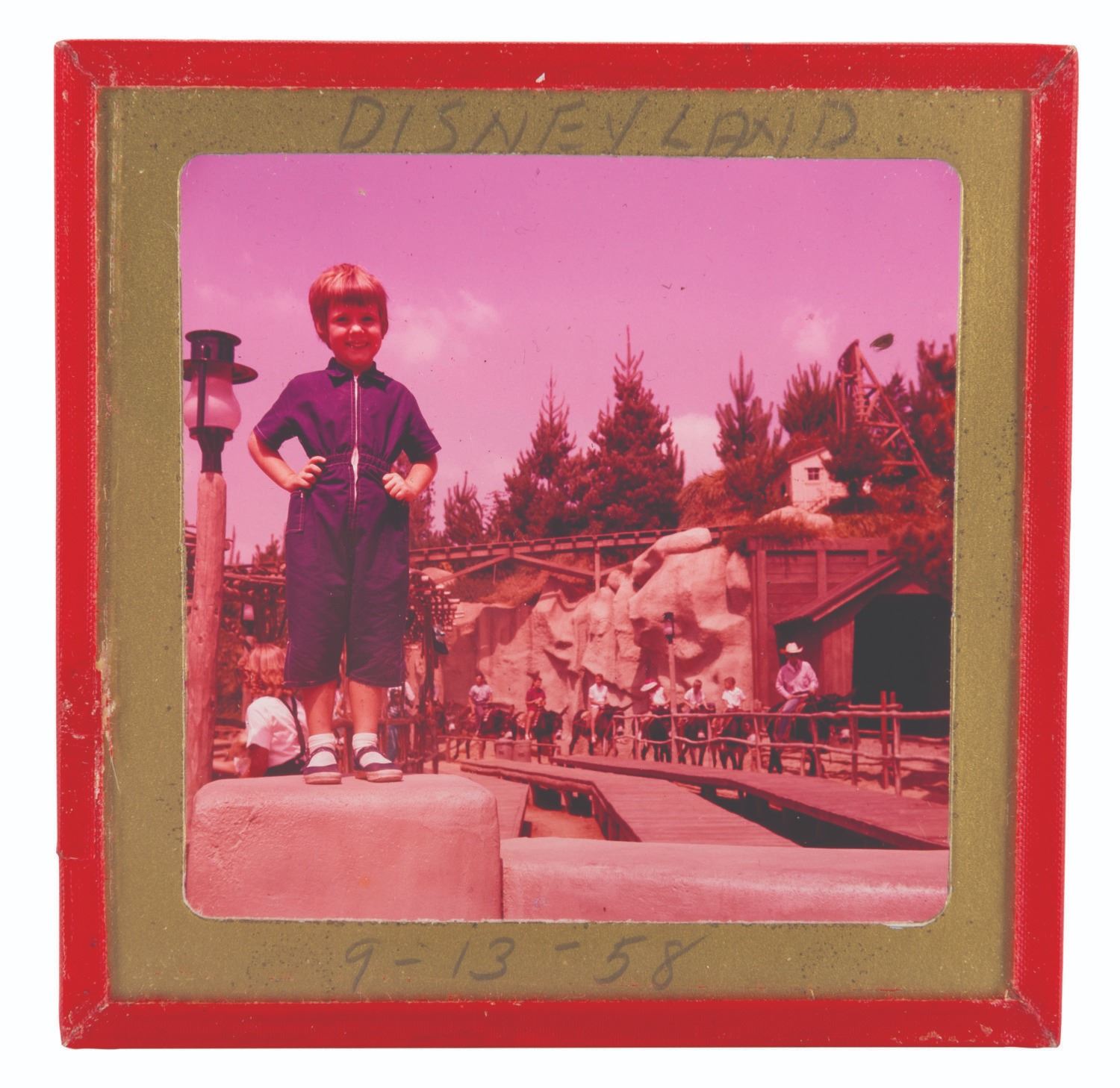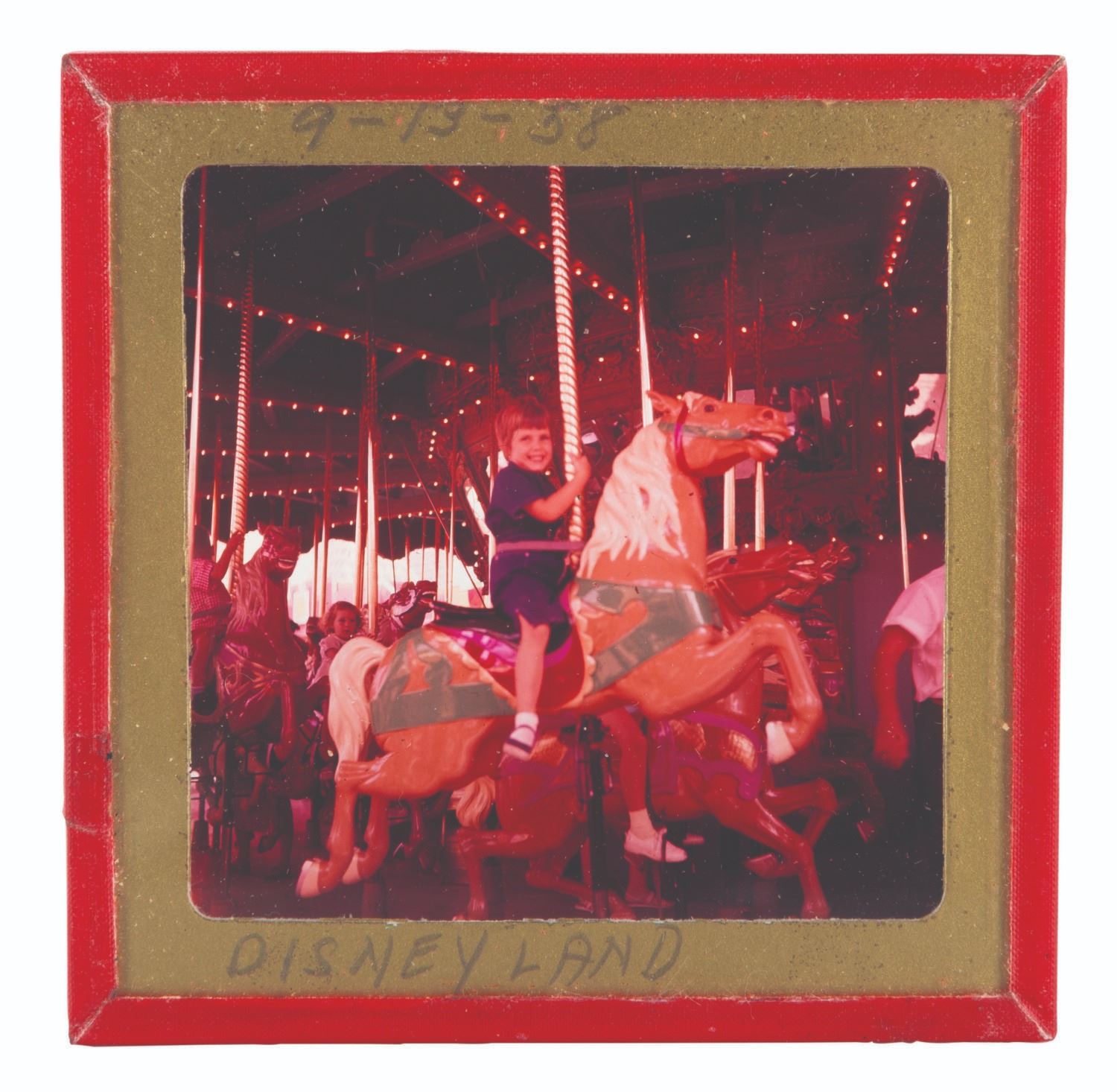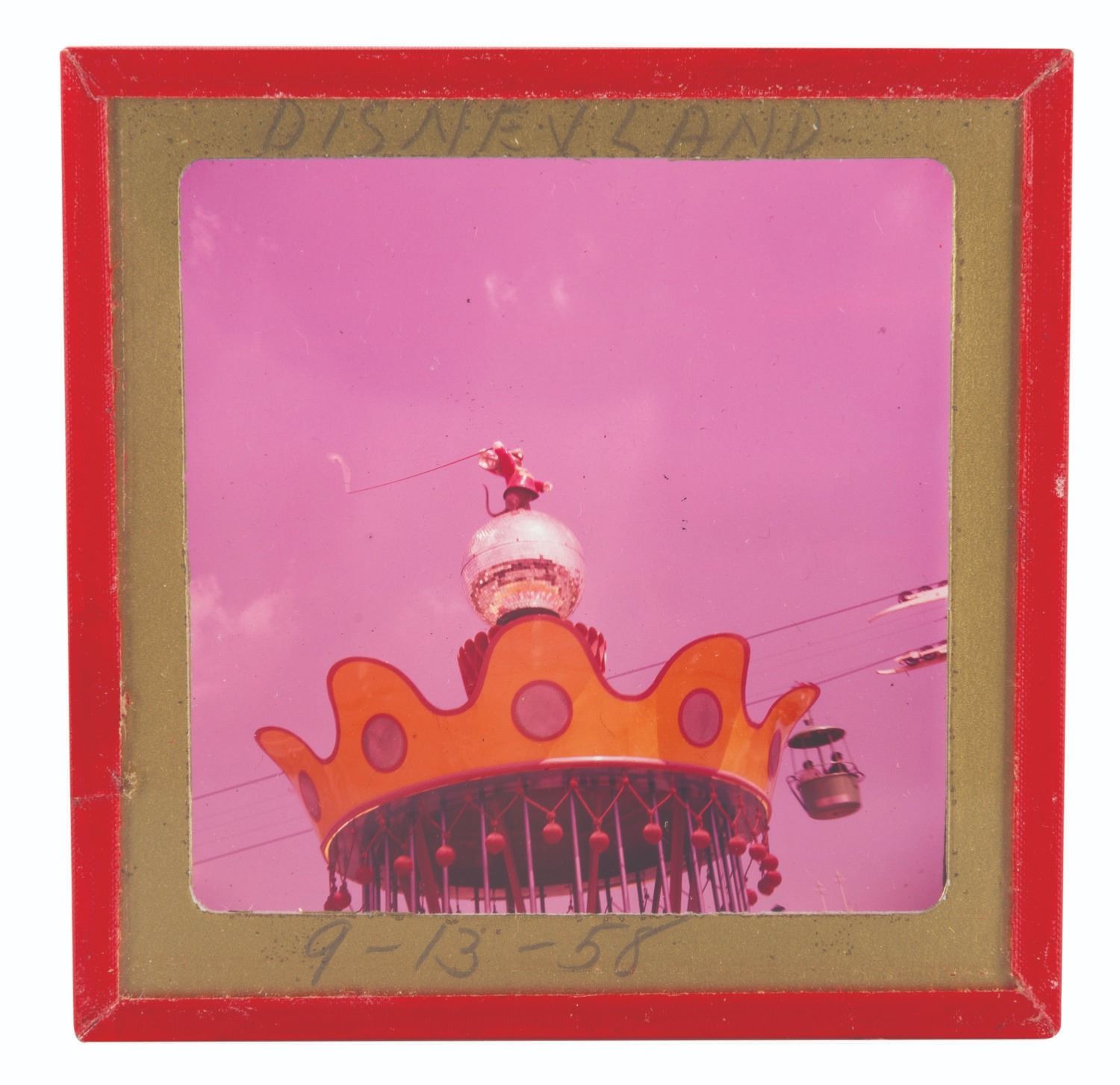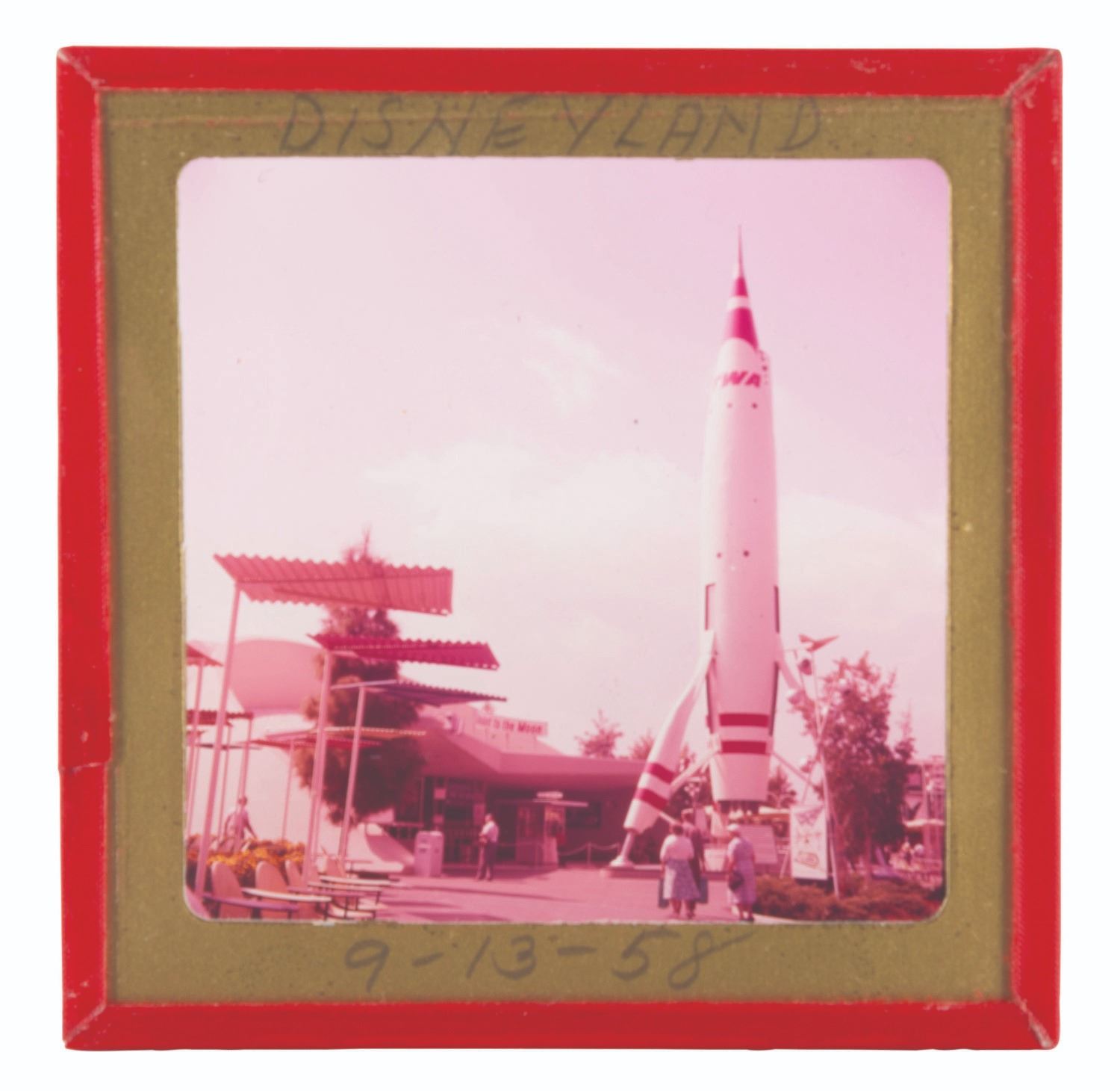 (Disneyland, 1958) A collection of six amateur color slides taken at Disneyland on August 13th, 1958. The set includes images of Tomorrowland, the Dumbo ride, Skybuckets, the Alice in Wonderland ride, the Pack Mules, and the King Arthur Carrousel. Each measuring 2.75" x 2.75", the slides are in very good condition showing a magenta shift typical of color-positive film of that era.