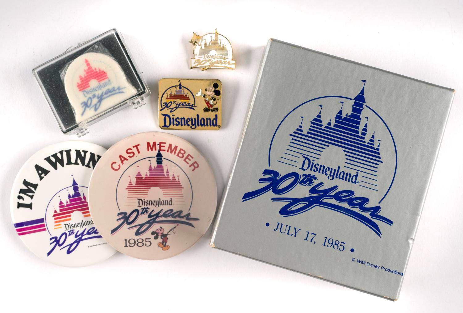 (Disneyland, 1985) A collection of Disneyland 30th Birthday items including a boxed pewter and wood plaque paperweight, (2) buttons (one for cast members), (2) pins, and a printed sugar cube. All are in good condition with expected wear.