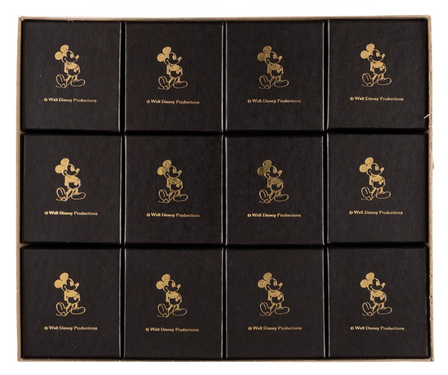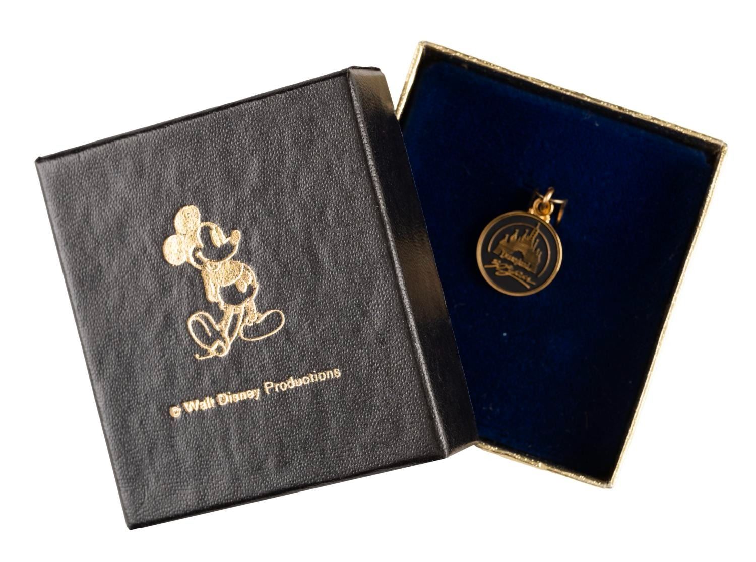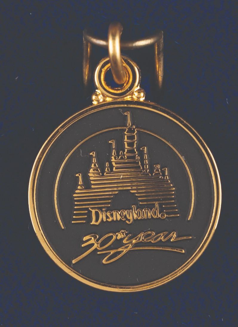 (Disneyland, 1985) A group of twelve "Disneyland 30 Year" pendants. Each 21mm diameter piece has a miniature relief of the "Disneyland 30 Years" logo and comes within its original 2.25"x2.5"x1" box featuring the Walt Disney Productions Mickey Mouse logo. Each piece is in fine condition.
