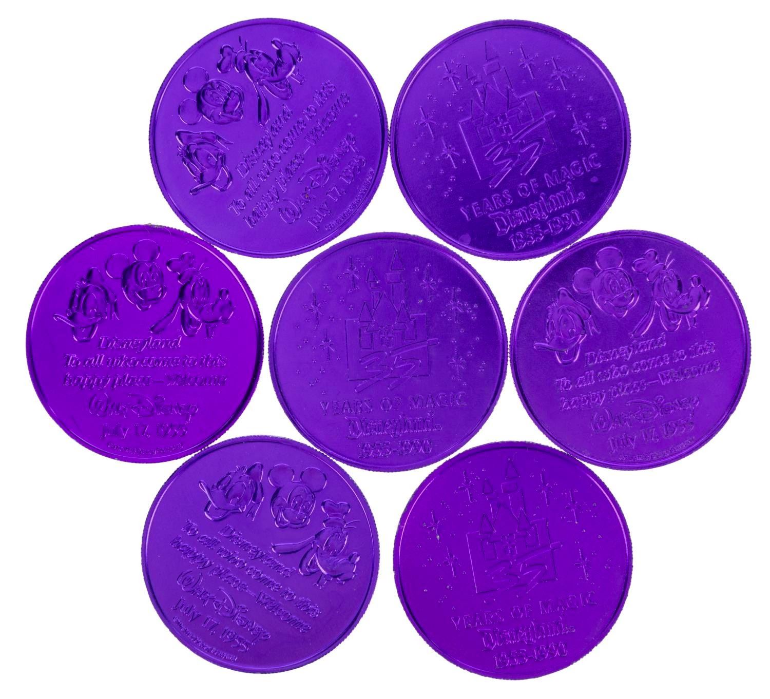 (Disneyland, 1990) A collection of seven Disneyland 35th anniversary coins featuring Sleeping Beauty Castle and Mickey, Goofy, and Donald Duck. Measuring 1.5" in diameter, these purple plastic coins are in very good condition with light scratches and edge wear.