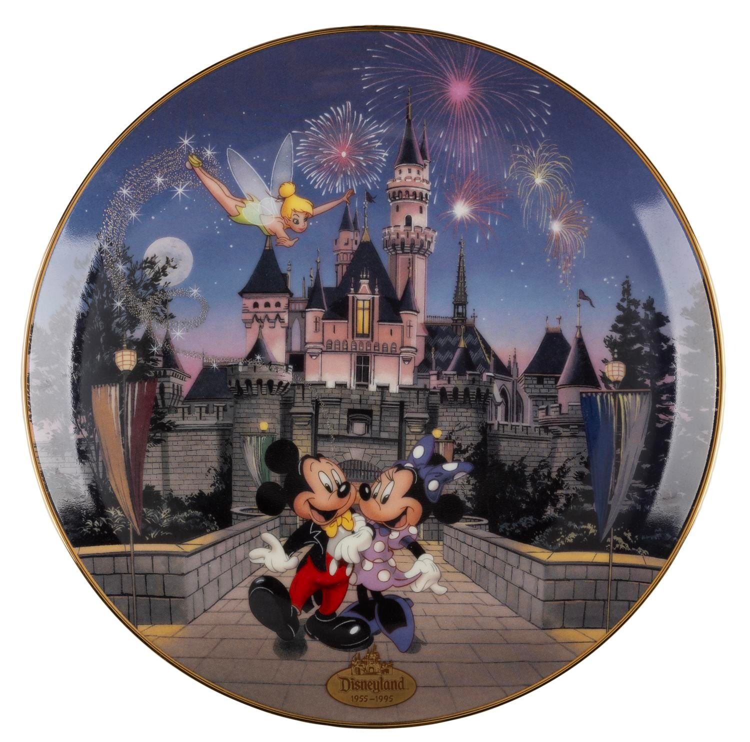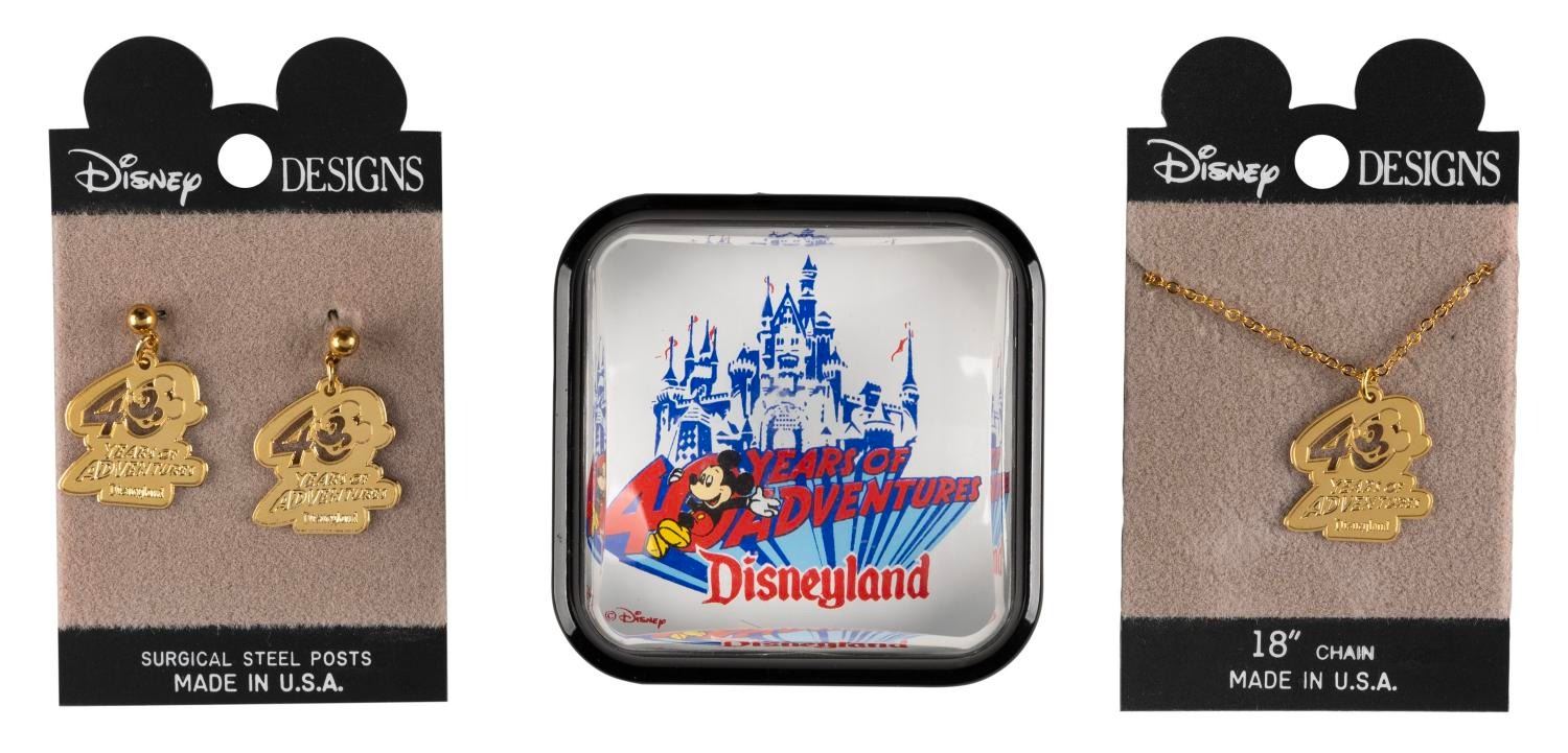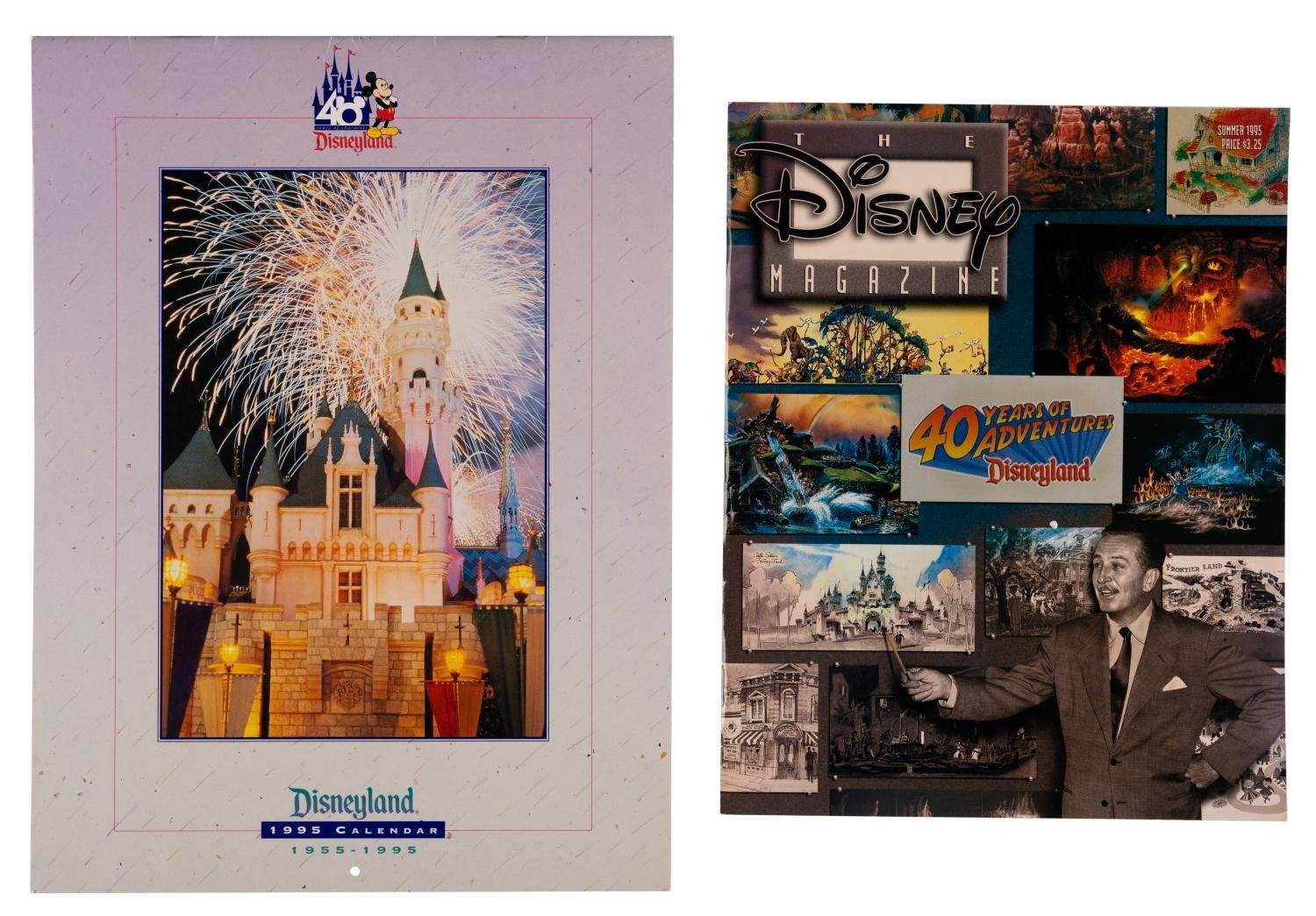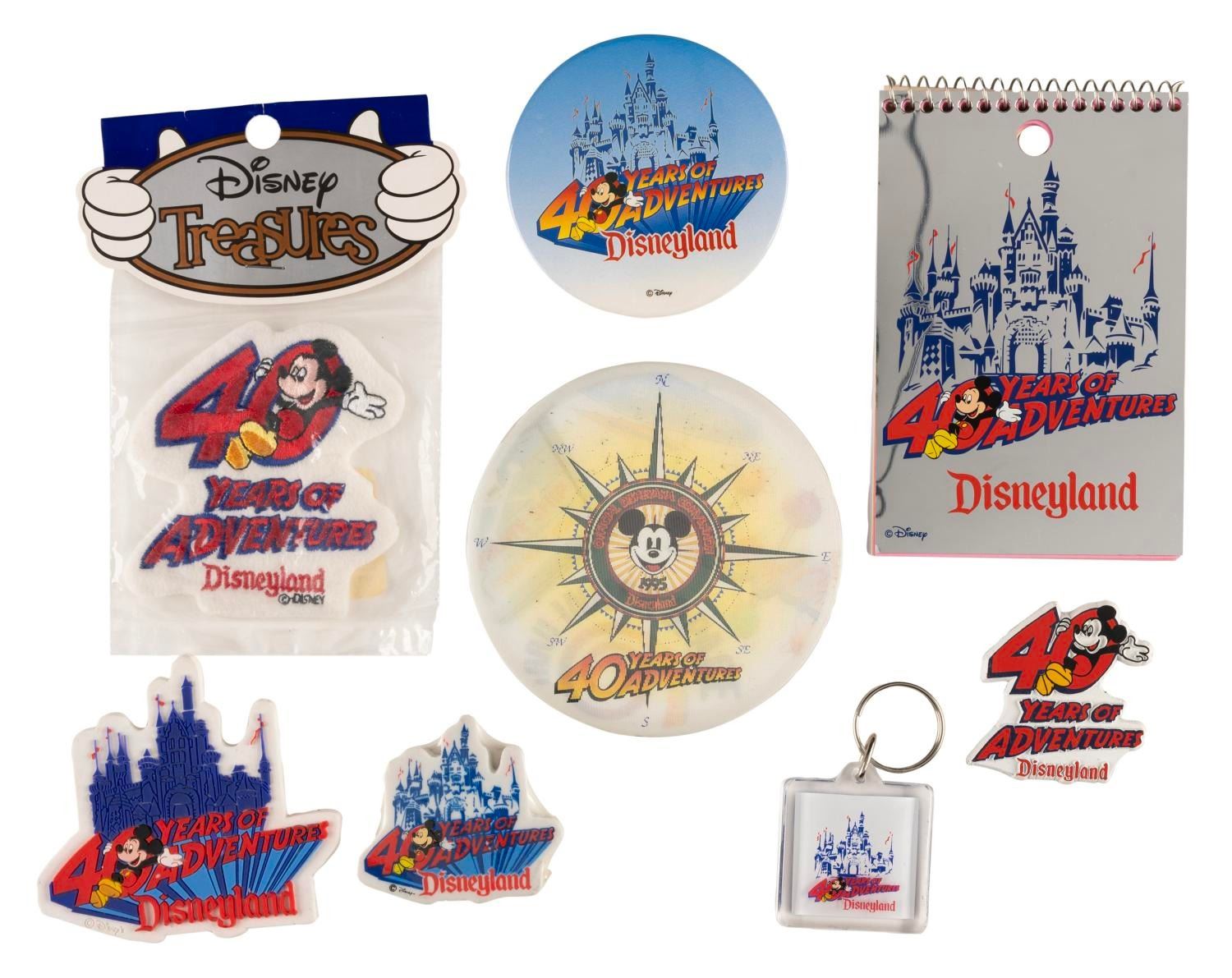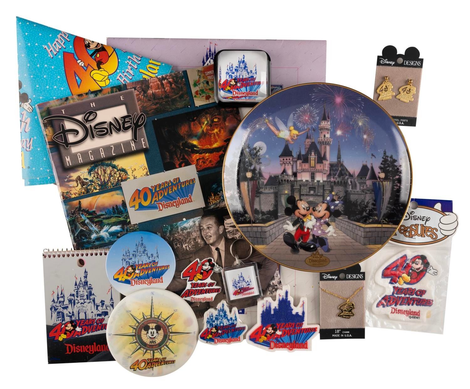 (Disneyland, 1995) A collection of 40th anniversary items including two party hats, one notebook, a decorative plate, a Summer 1995 Disney Magazine, a 1995 calendar, two magnets, an embroidered patch, two pinback buttons, a pair of earrings, a necklace, paperweight, keychain, and an eraser. Measuring from .75"x.75" up to 13"x9.75", the items are in very good to good condition with handling wear to the magazine and calendar, light soiling and surface scratching to the notebook cover, surface scratching on the paperweight, oxidation on the reverse of the buttons, a large fold across one party hat, and adhesive residue on the reverse of the larger magnet. The necklace, earrings, eraser and embroidered patch are in fine condition unopened and on the original packaging.