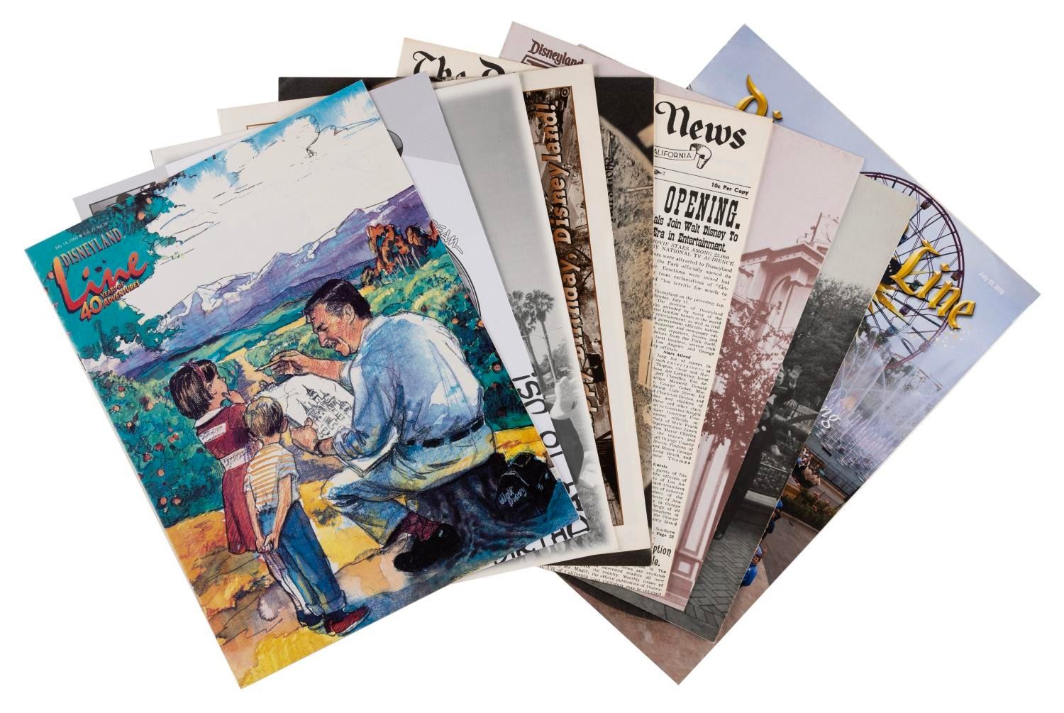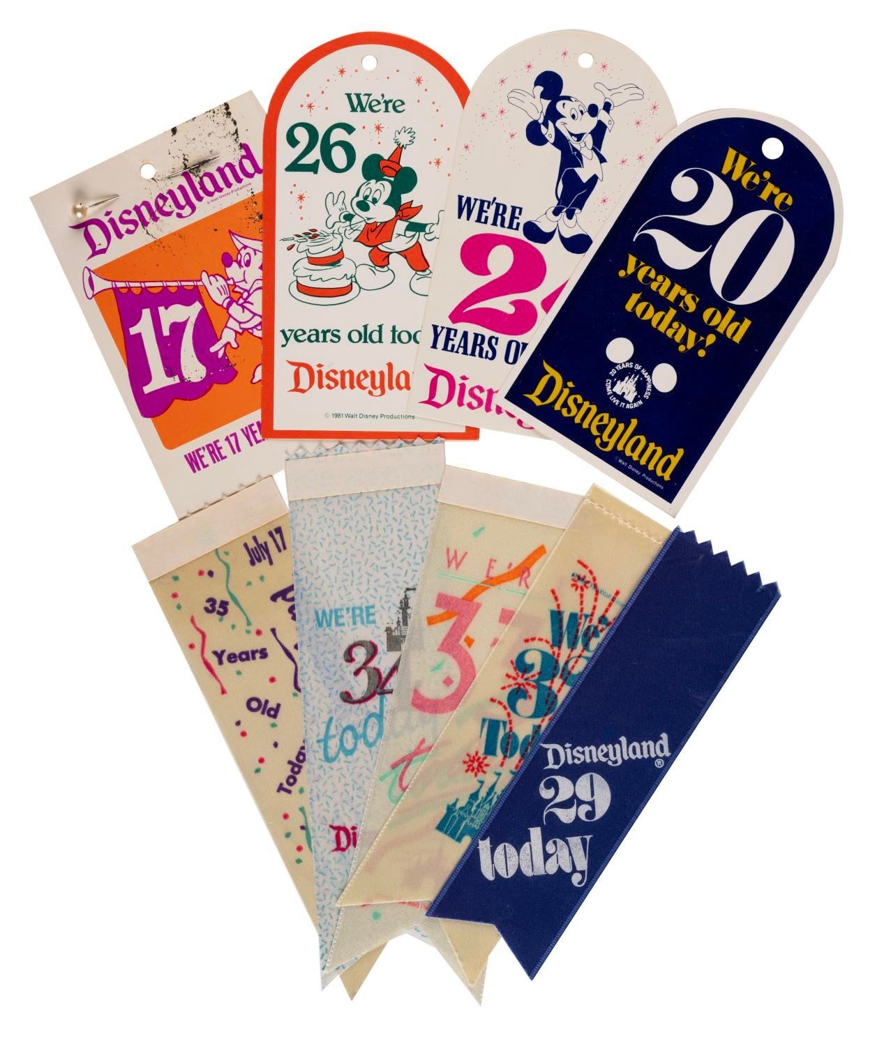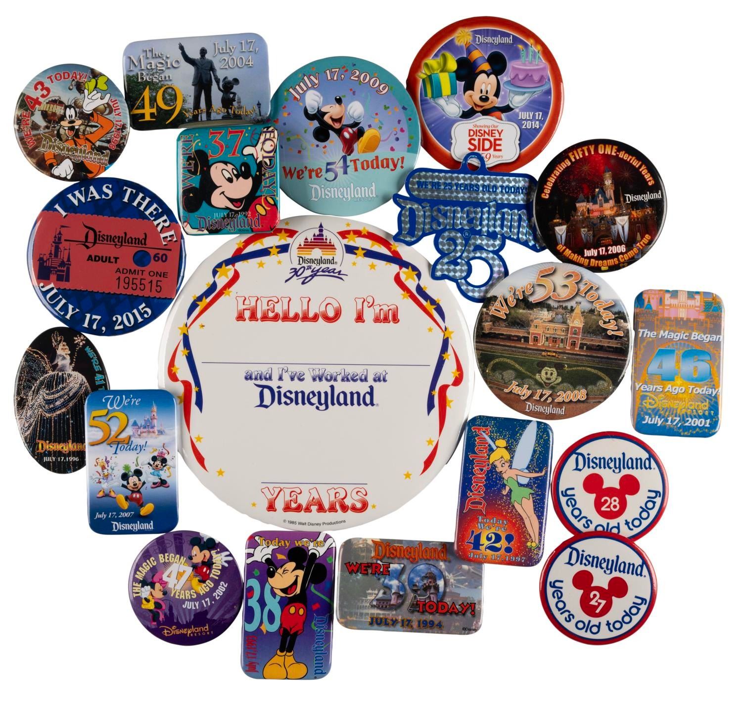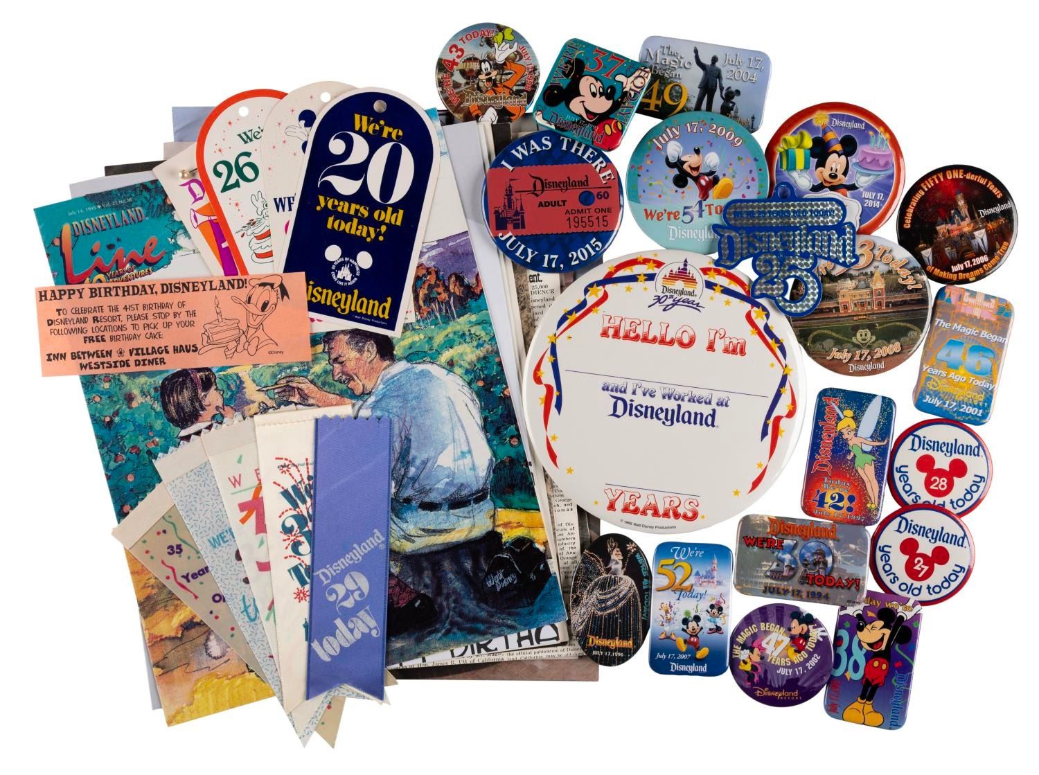 (Disneyland, 1972-2010) A large assortment of Disneyland anniversary souvenirs including Cast Member exclusives. Among this collection are nine Cast Member name badge hang-tags and ribbons, 18 pinback buttons, and nine Disneyland Line magazines ranging in date from 1979-2010. Measuring from 2.25" in diameter to 9" x 12", the items are in very good condition with handling wear to the documents, the buttons have scratching and minimal oxidation, and a small black stain on the "We're 17" hang-tag.