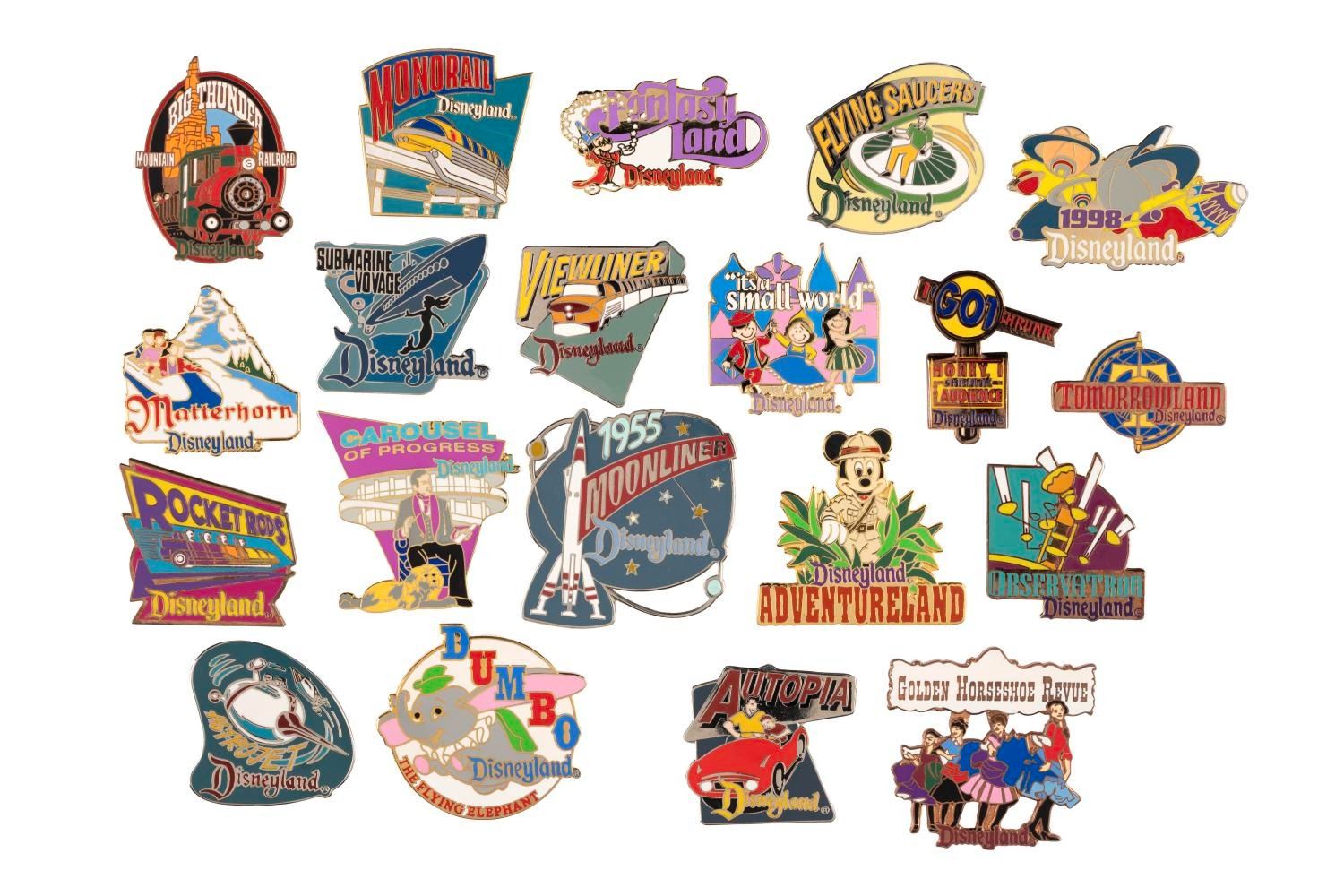(Disneyland, 1990s) A collection of 20 Disneyland attraction pins including pins of the Viewliner, Matterhorn, Rocket Rods, Carousel of Progress, and more. Measuring 1.25"x1" to 1.5"x1.75", each pin retains its Disneyland pin card, all in very good condition with wear to some of their pinbacks.