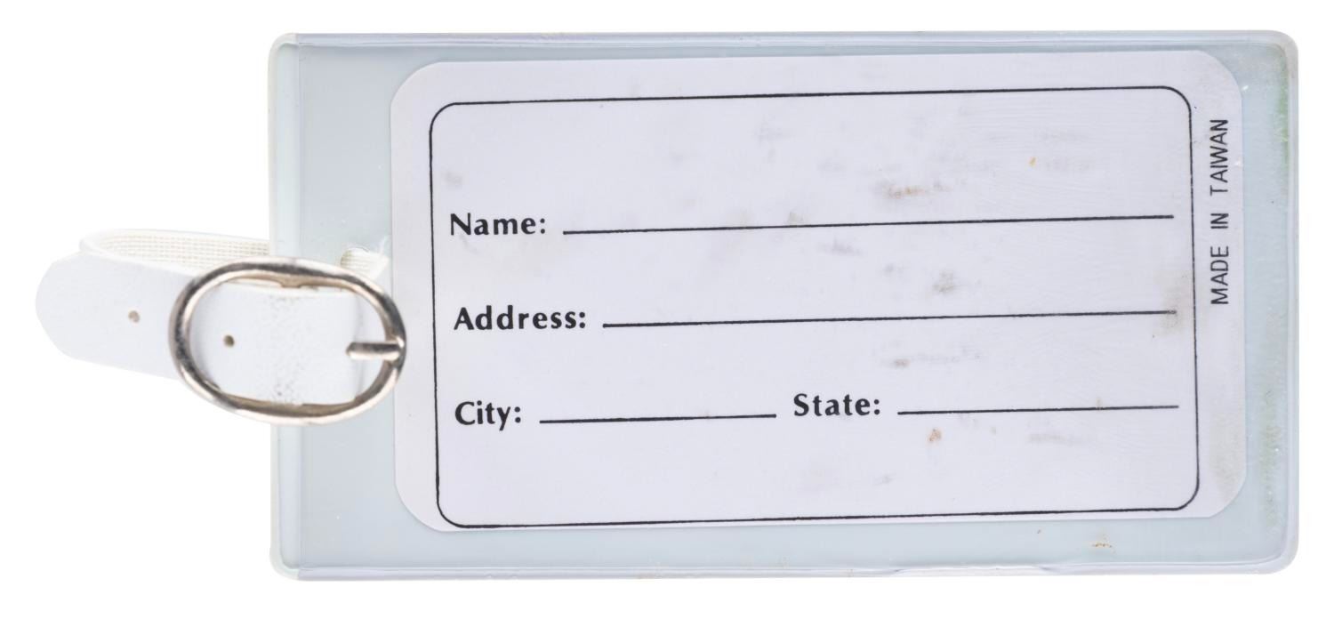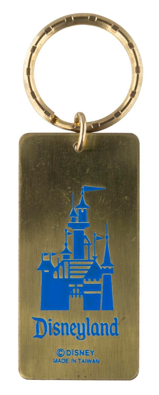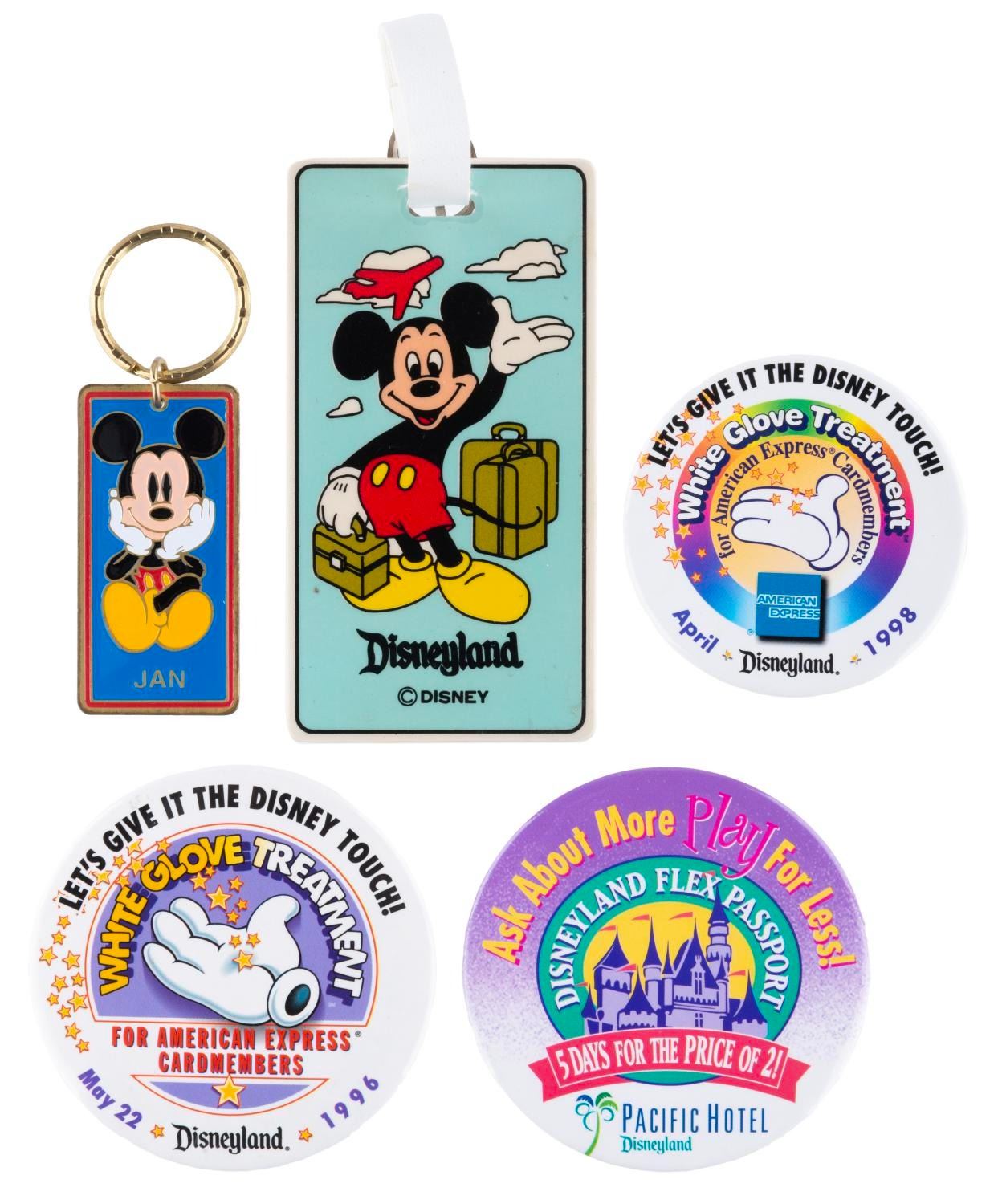 (Disneyland, 1970s-90s) A collection of two American Express Disneyland buttons, a Pacific Coast Hotel button, a Mickey Mouse and Sleeping Beauty Castle keychain that reads "Jan," and a Mickey Mouse luggage tag. Measuring from the 1.25" x 2.5" keychain to the 2.25" x 4.25" luggage tag, the collection is in good condition with scuffs and scratches to the keychain and the reverse of the buttons, and light discoloration, scuffs, and smudges to the back of the luggage tag.