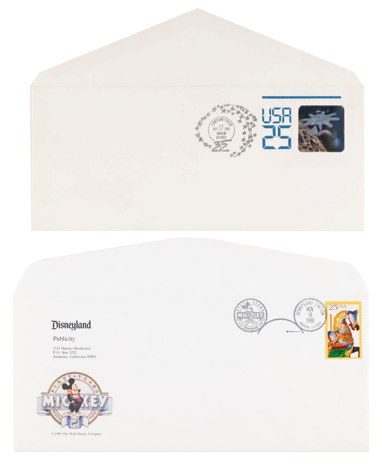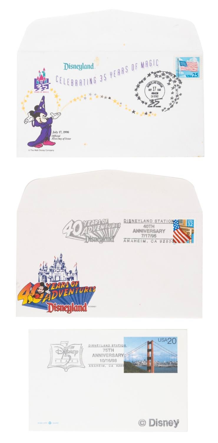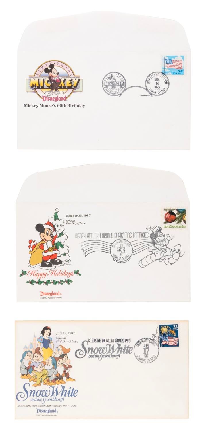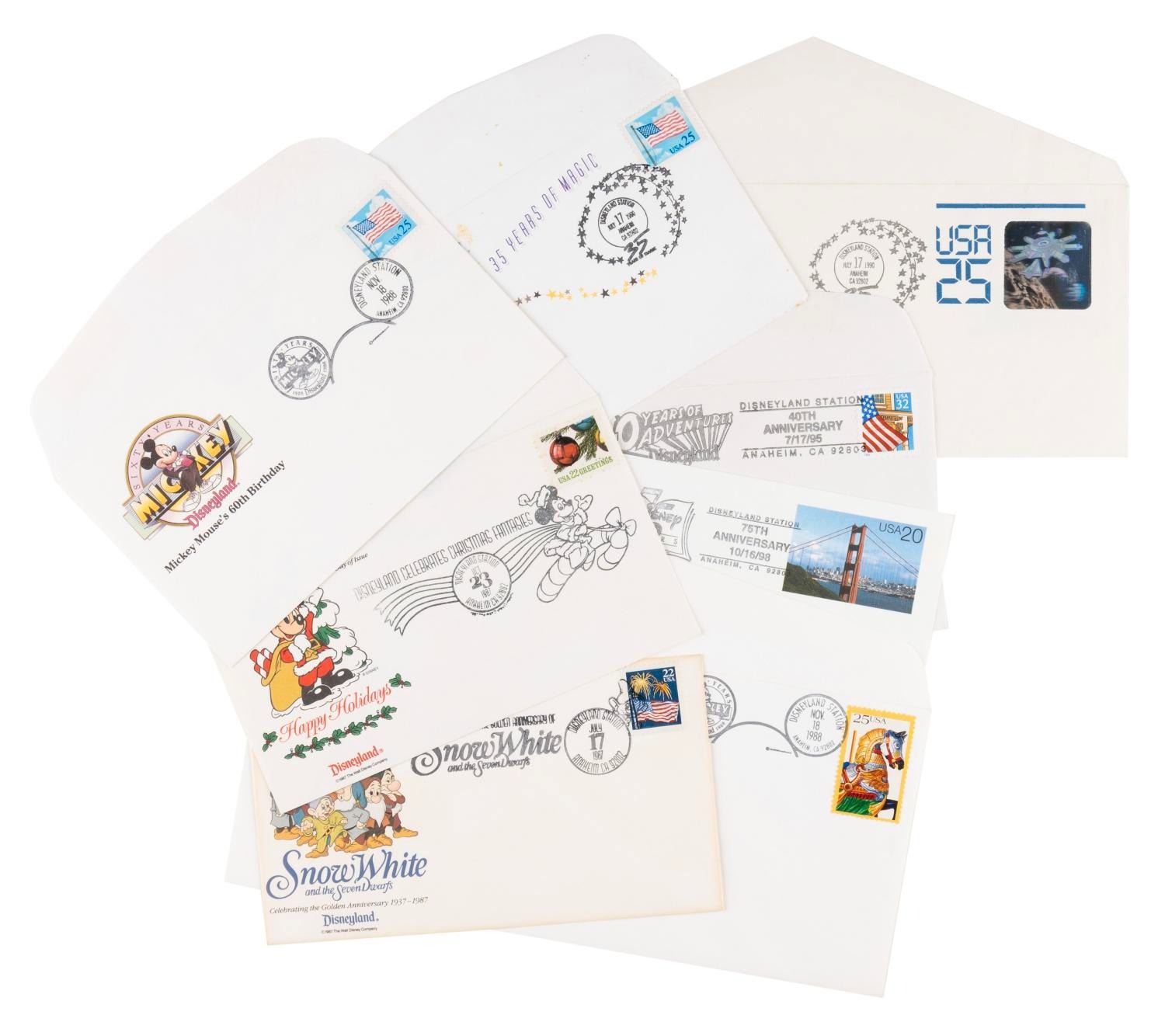 (Disneyland, 1987-98) A collection of one postcard and seven envelopes with commemorative and first-day-of-issue postmarks from the Disneyland Postal Station. Postmarks range from “Snow White and the Seven Dwarfs” on July 17, 1987, to the Walt Disney Company’s 75th anniversary on October 16, 1998. Measuring 9.5” x 6” and under, the envelopes and postcard are in very good condition with the Snow White and 35 Years of Magic envelopes showing light wear from age.