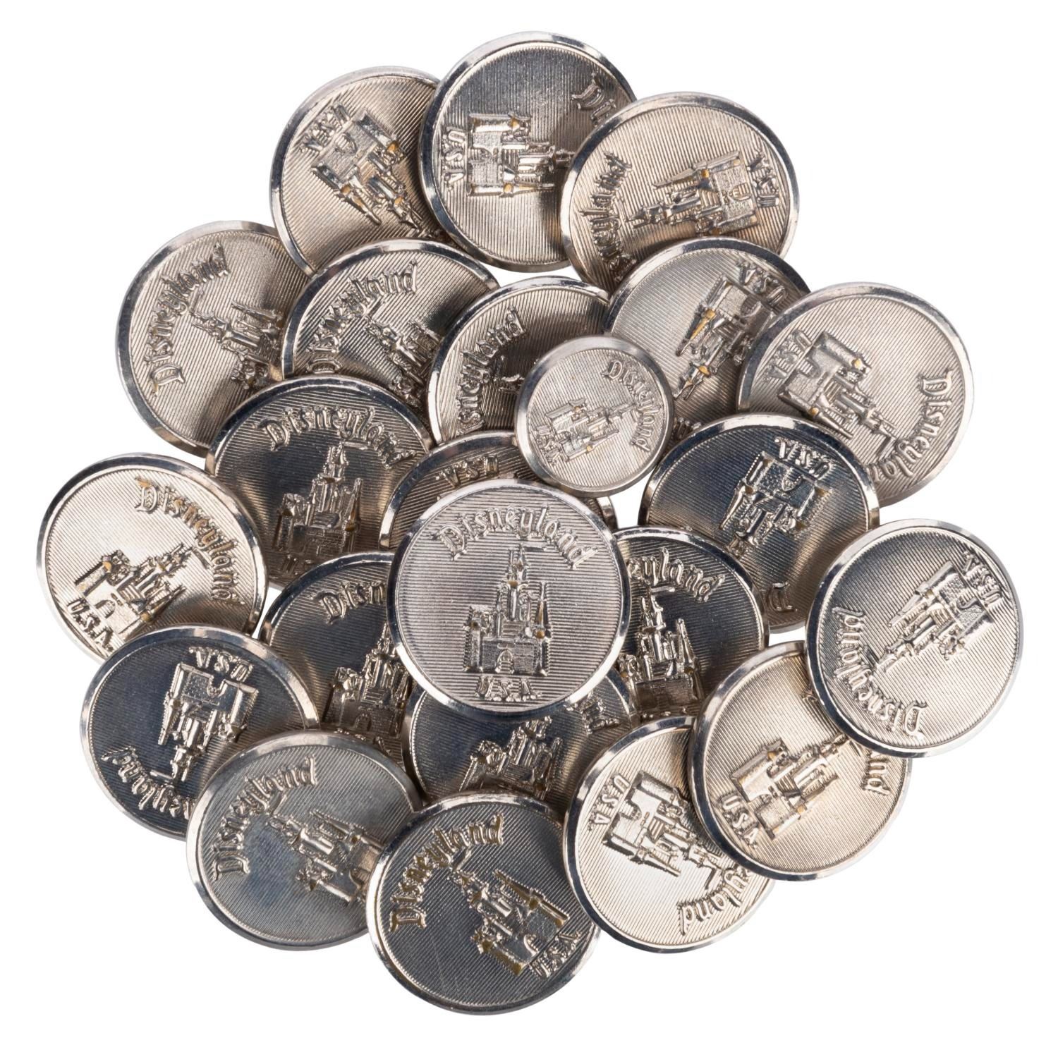 (Disneyland, 1960s-80s) A Collection of 24 Disneyland costume buttons featuring the Sleeping Beauty Castle emblem and "Disneyland U.S.A." Buttons of this style were manufactured expressly for the Disneyland Wardrobe Department from the 1960s to the 1980s. Measuring .75" and .5" in diameter, each button is in very good condition with minor wear and scuffs to some pieces.