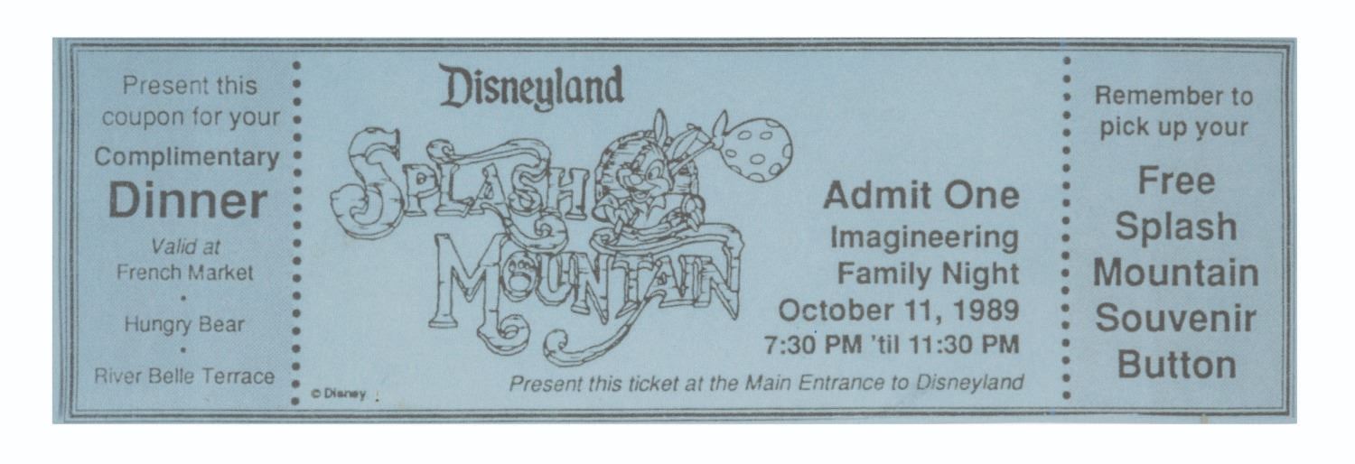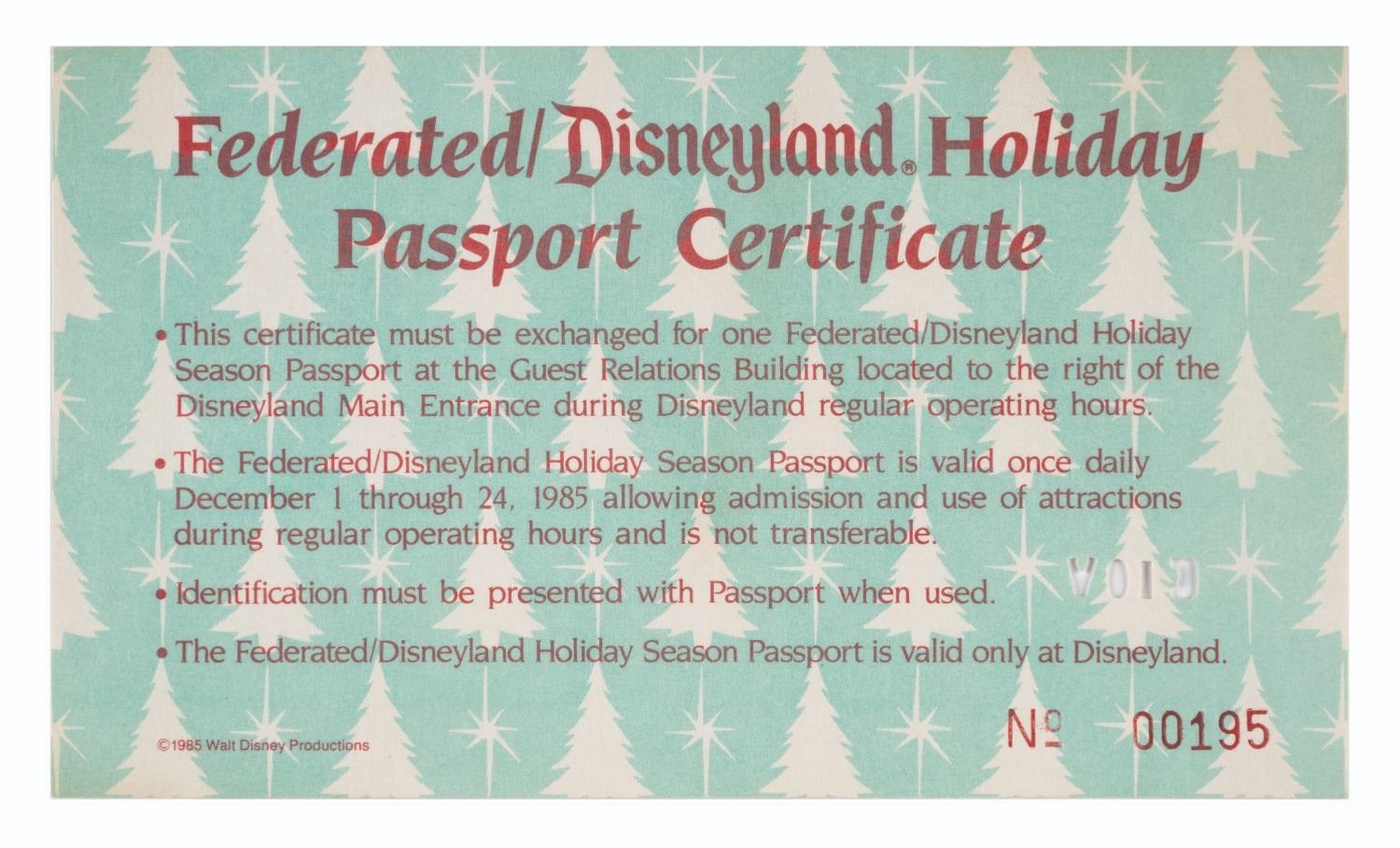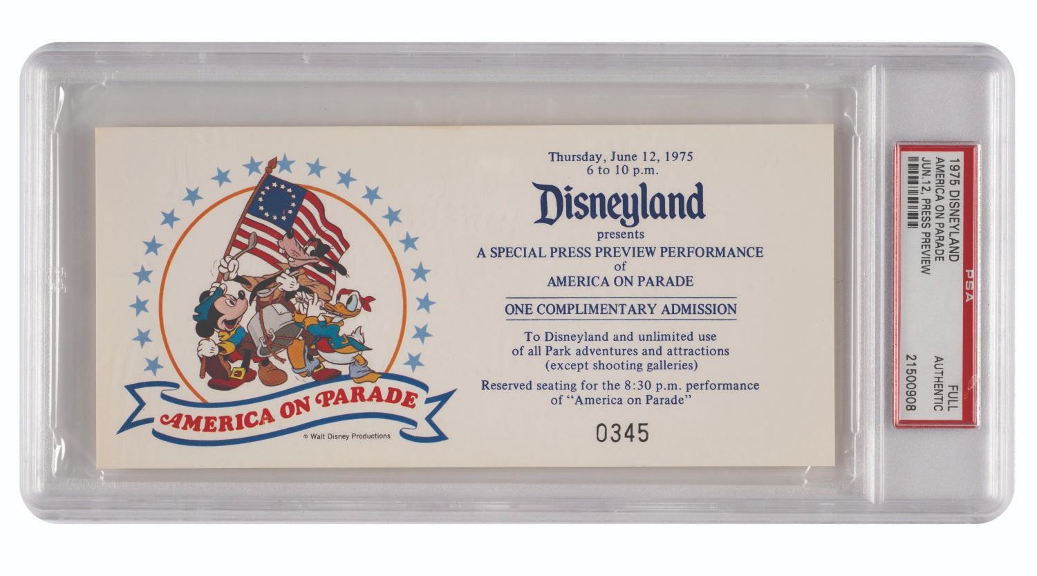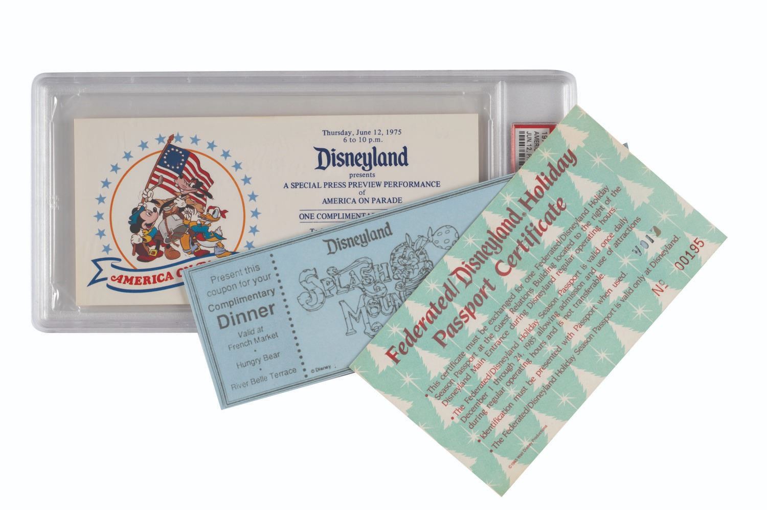(Disneyland, 1975-89) A Collection of 3 tickets to Disneyland Events. This lot includes an America on Parade Press Preview Performance ticket, a 1985 Disneyland Holiday Passport Certificate, and a 1989 Splash Mountain Imagineering Family Fun Night ticket. The Holiday Passport (numbered "00195") has been "voided," the Imagineering Family Night ticket retains its stubs, and the America on Parade ticket (numbered "0345") has been PSA Certified. Measuring 6"x3.5" and 7"x3.25", each ticket is in fine to good condition with spots of discoloration to the back of one and some minor edge wear.