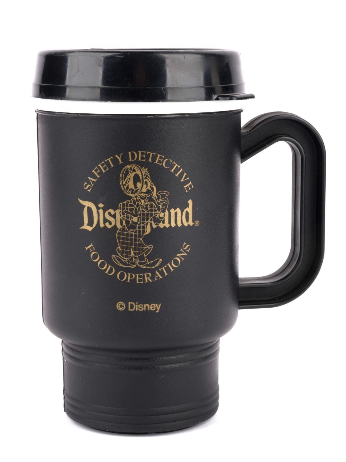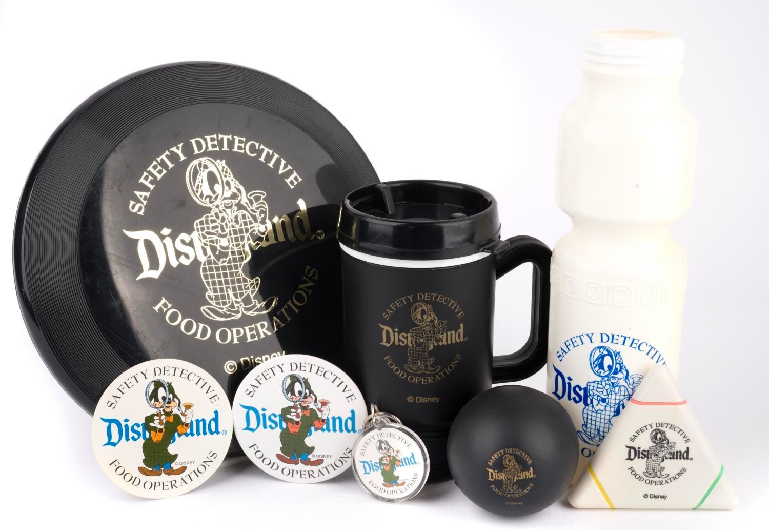 (Disneyland, 1980s-90s) A set of eight Disneyland Food Operations items featuring Goofy as a "Safety Detective" on a frisbee, a travel mug, water bottle, stress ball, highlighter, button, keychain, and sticker. Measuring from 2" in diameter to 9.75" tall, the items are overall in very good condition, with the frisbee and stress ball in good condition with minor wear and scratches from use. The water bottle is missing its lid.