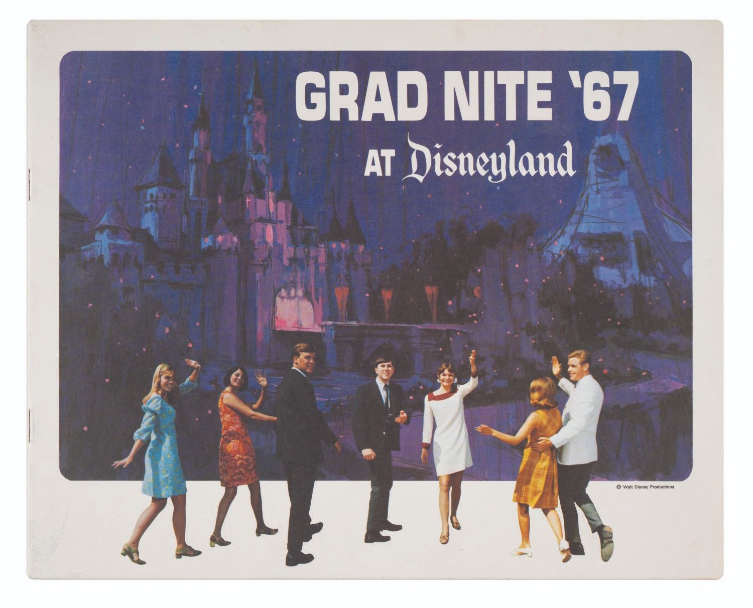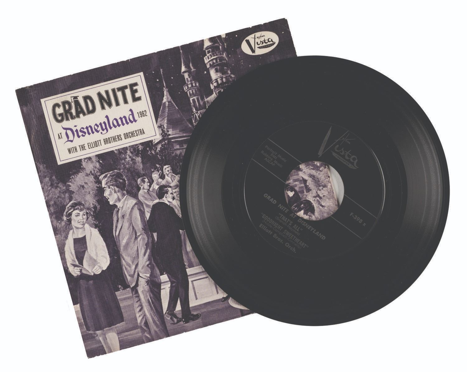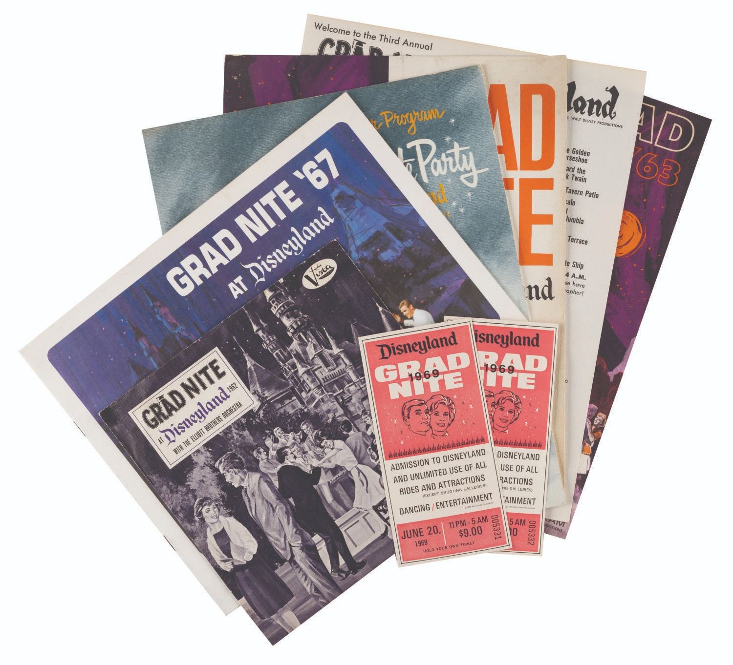 (Disneyland, 1961-69) A Collection of eight Disneyland Grad Nite Souvenirs. Among this collection are (4) souvenir programs (from 1961, 1963, 1964, and 1967), a "Grad Nite at Disneyland 1962 with The Elliott Brothers Orchestra" record (featuring the songs "That's All," "Goodnight Sweetheart," and "La Raspa"), a 1963 handbill, and a pair of 1969 tickets. Measuring between 5.75"x5" and 11.25"x8.75", each piece is in very good condition with minor discoloration and a few small tears and wear to the paper and vinyl record from handling and use.