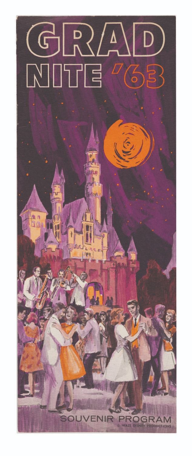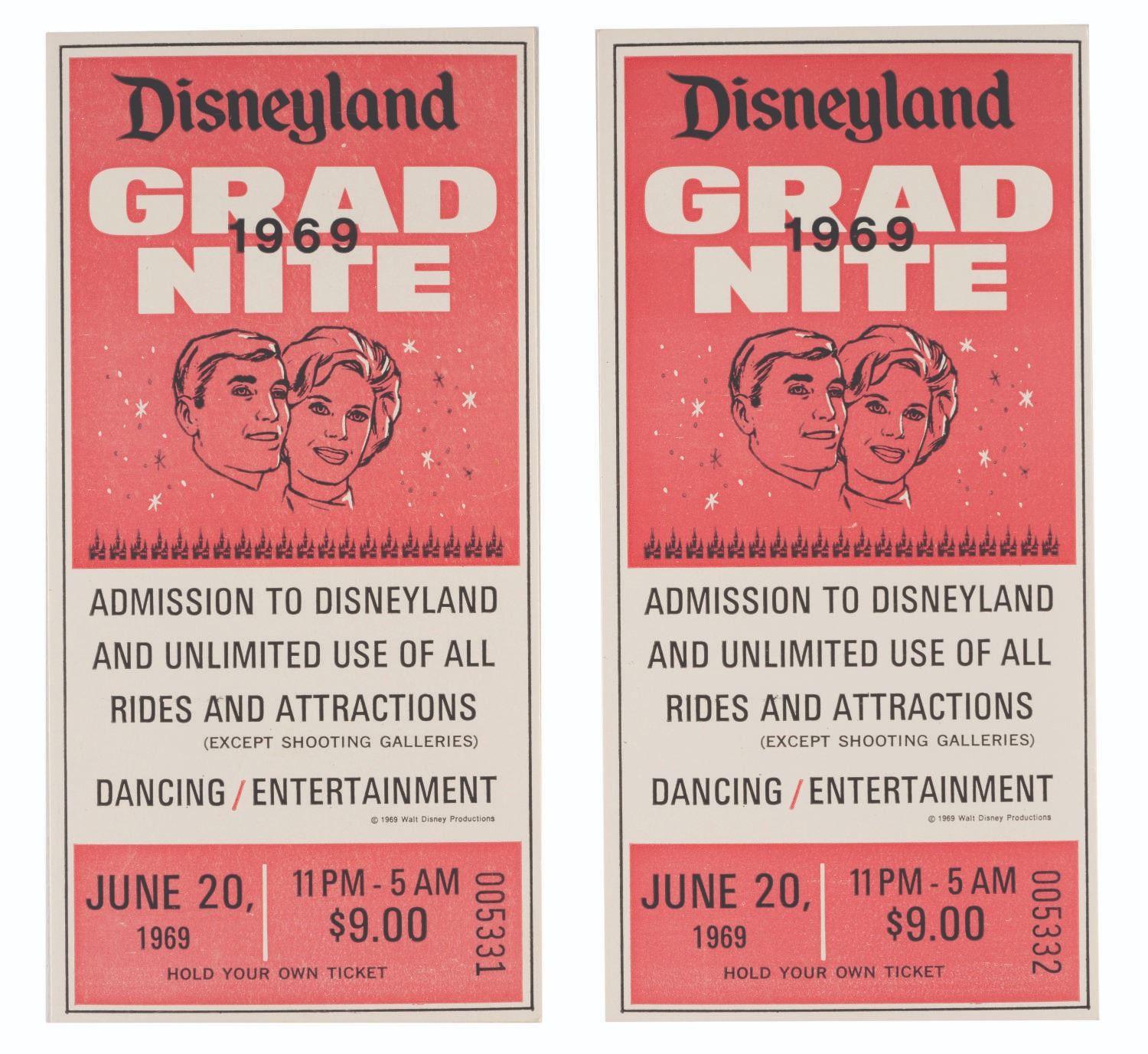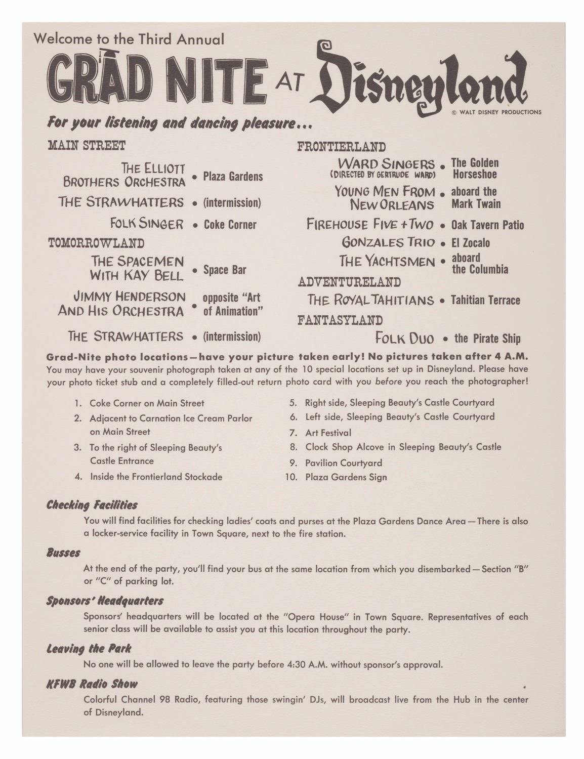 (Disneyland, 1961-69) A Collection of eight Disneyland Grad Nite Souvenirs. Among this collection are (4) souvenir programs (from 1961, 1963, 1964, and 1967), a "Grad Nite at Disneyland 1962 with The Elliott Brothers Orchestra" record (featuring the songs "That's All," "Goodnight Sweetheart," and "La Raspa"), a 1963 handbill, and a pair of 1969 tickets. Measuring between 5.75"x5" and 11.25"x8.75", each piece is in very good condition with minor discoloration and a few small tears and wear to the paper and vinyl record from handling and use.