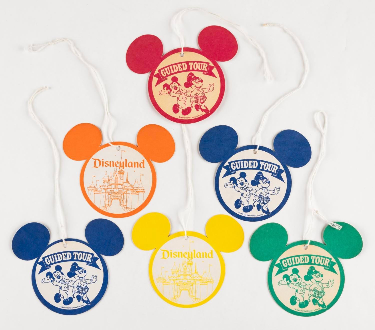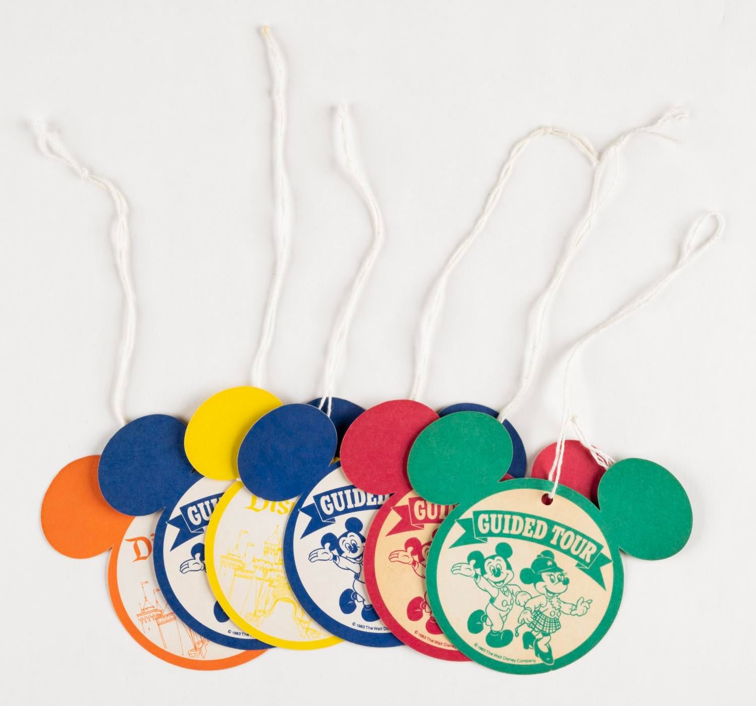 (Disneyland, 1983) A collection of six Guided Tour ID tags featuring Mickey and Minnie Mouse. Measuring 3.5” in diameter each, the colorful tags are in fine condition.