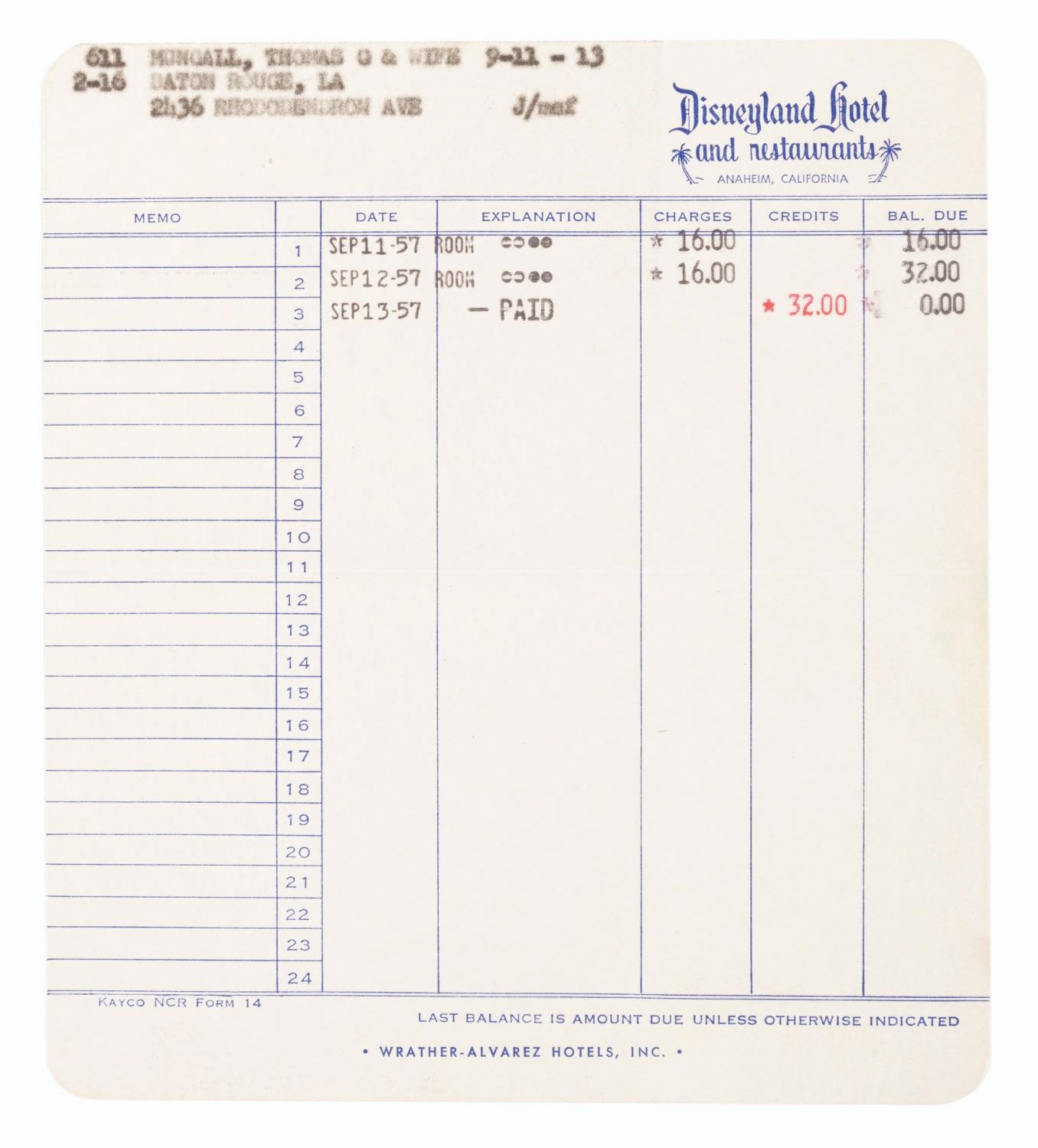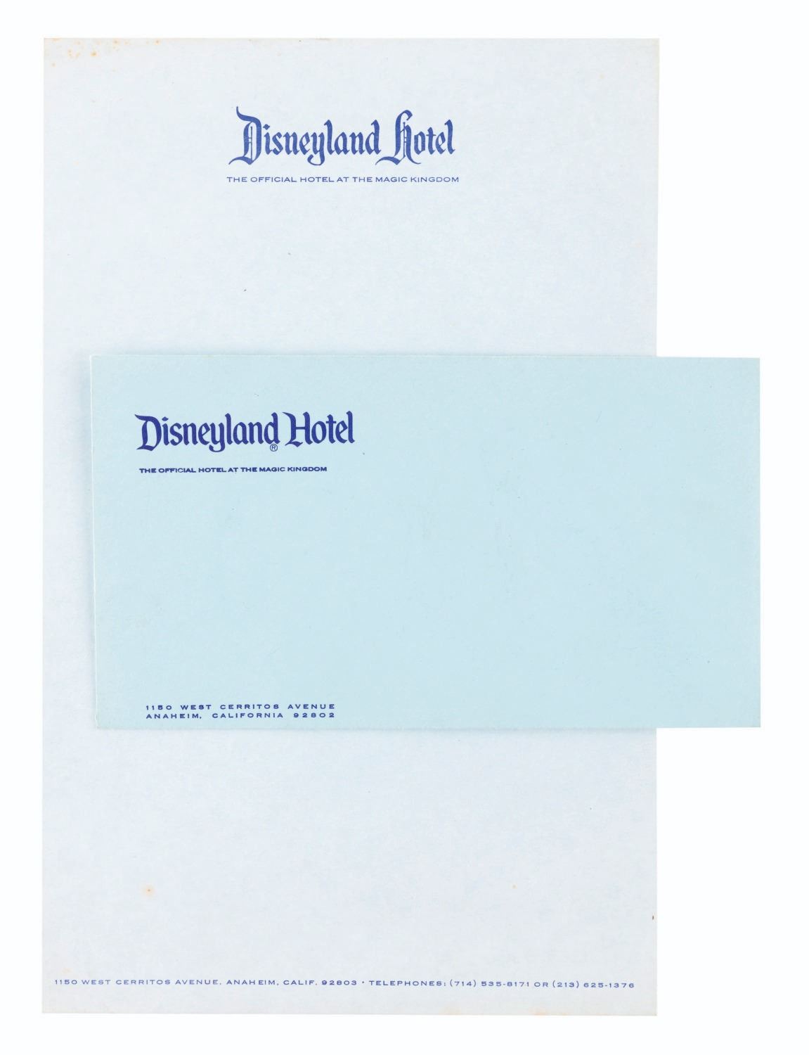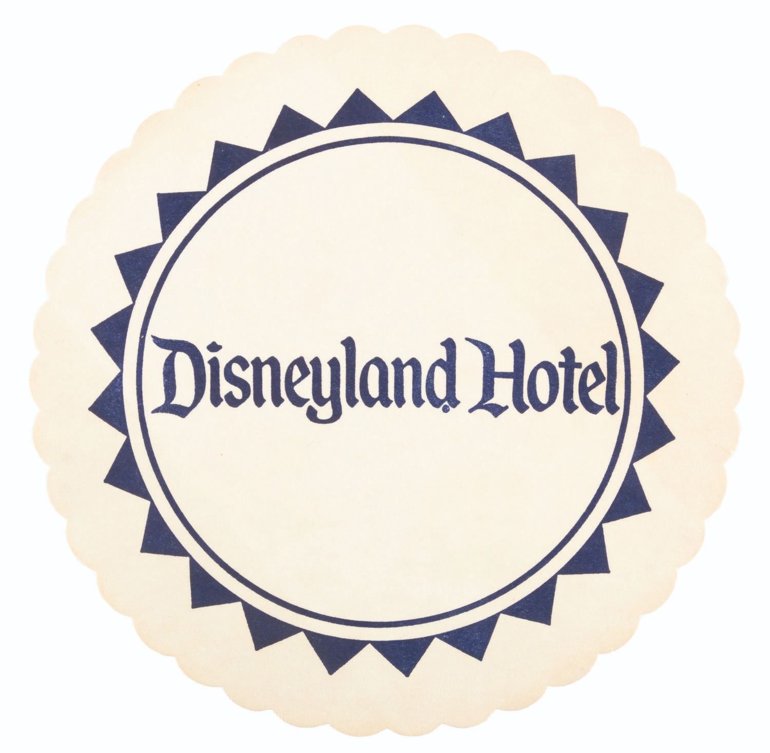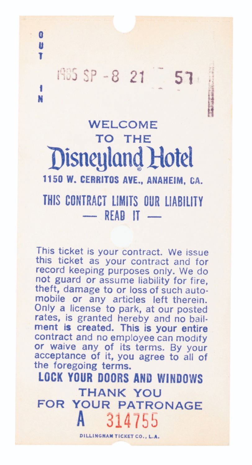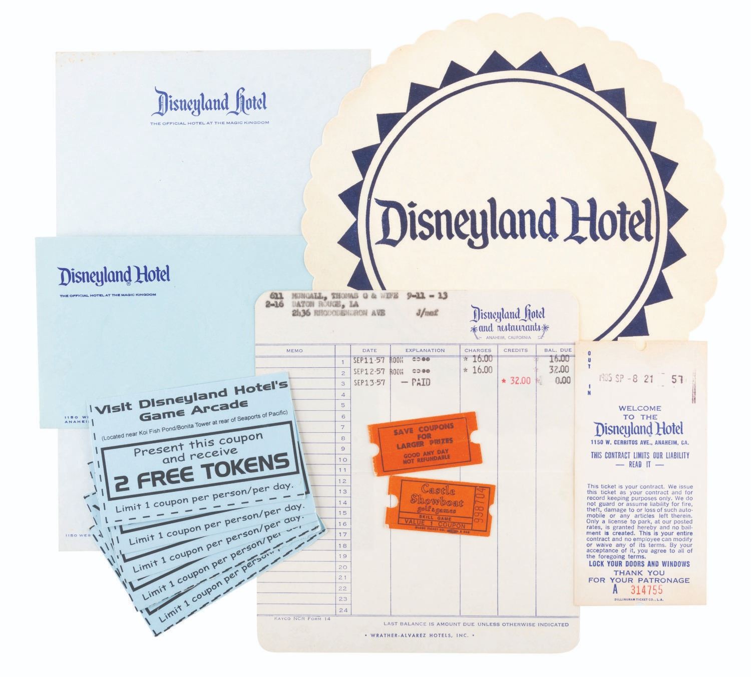 (Disneyland, 1950s-80s) A collection of Disneyland Hotel paper ephemera. Included are a doily, an unused sheet of stationery and envelope, a hotel bill from 1957, a parking ticket from 1985, five Game Arcade tokens coupons, and a pair of Castle Showboat game coupons. Ranging in size from the 1” x 2” game coupons to the 8” diameter doily, the items all display in good to very good condition with edge wear, light discoloration from age, and light stains to the stationery.