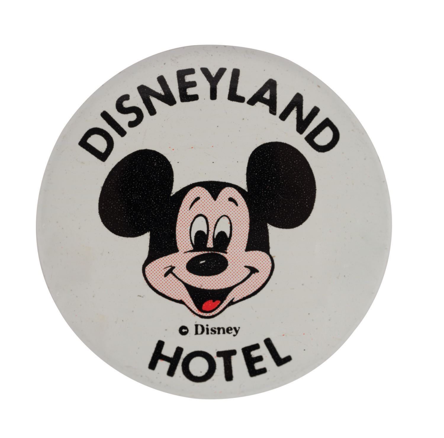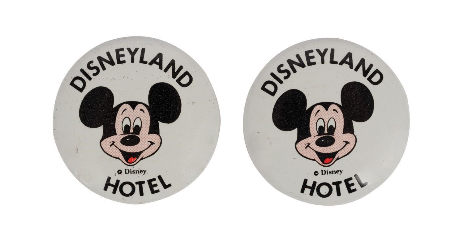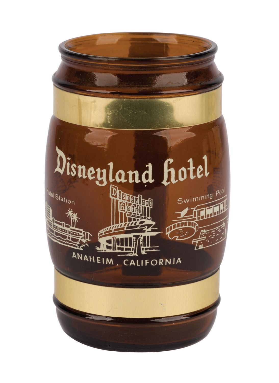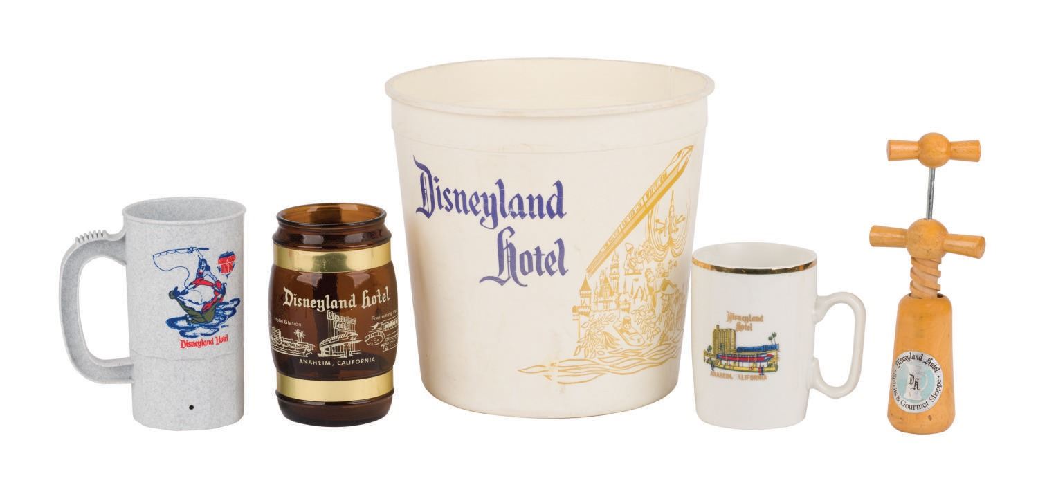 (Disneyland, 1960s/70s) A collection of vintage souvenirs from the Disneyland Hotel. Among the lot are an ice bucket, a 1960s souvenir mug, a Spirits & Gourmet Shop wine cork extractor, a 1961-66 matchbook, a 1961-66 mug, two Disneyland Hotel buttons, and a 1970s Shipyard Inn mug. Measuring various sizes, the mementos of The Disneyland Hotel are in very good to good condition exhibiting minor wear.
