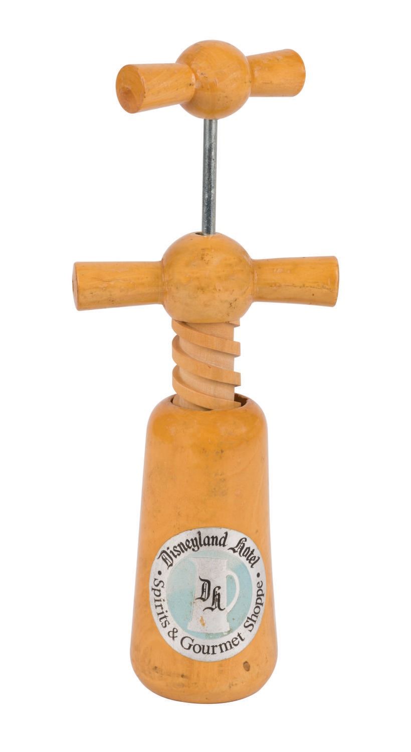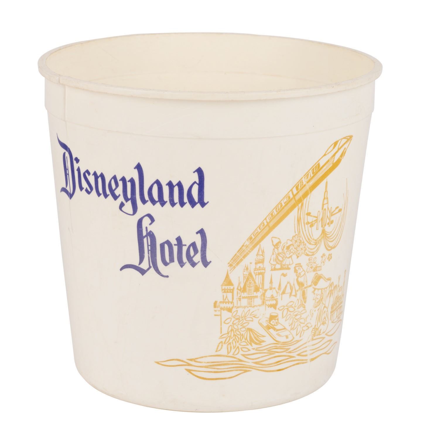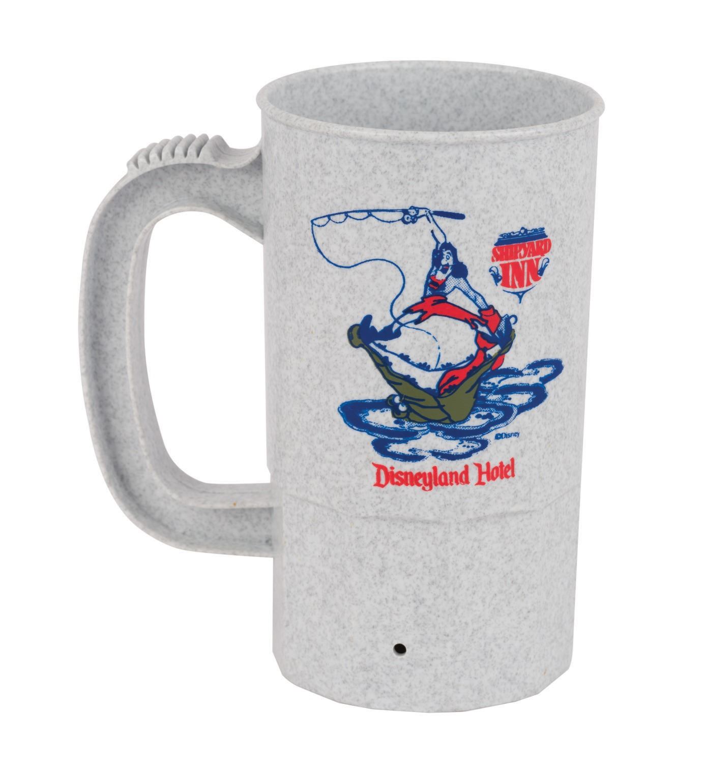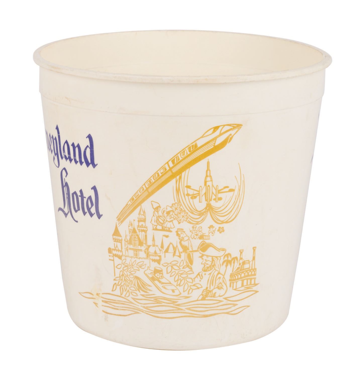 (Disneyland, 1960s/70s) A collection of vintage souvenirs from the Disneyland Hotel. Among the lot are an ice bucket, a 1960s souvenir mug, a Spirits & Gourmet Shop wine cork extractor, a 1961-66 matchbook, a 1961-66 mug, two Disneyland Hotel buttons, and a 1970s Shipyard Inn mug. Measuring various sizes, the mementos of The Disneyland Hotel are in very good to good condition exhibiting minor wear.