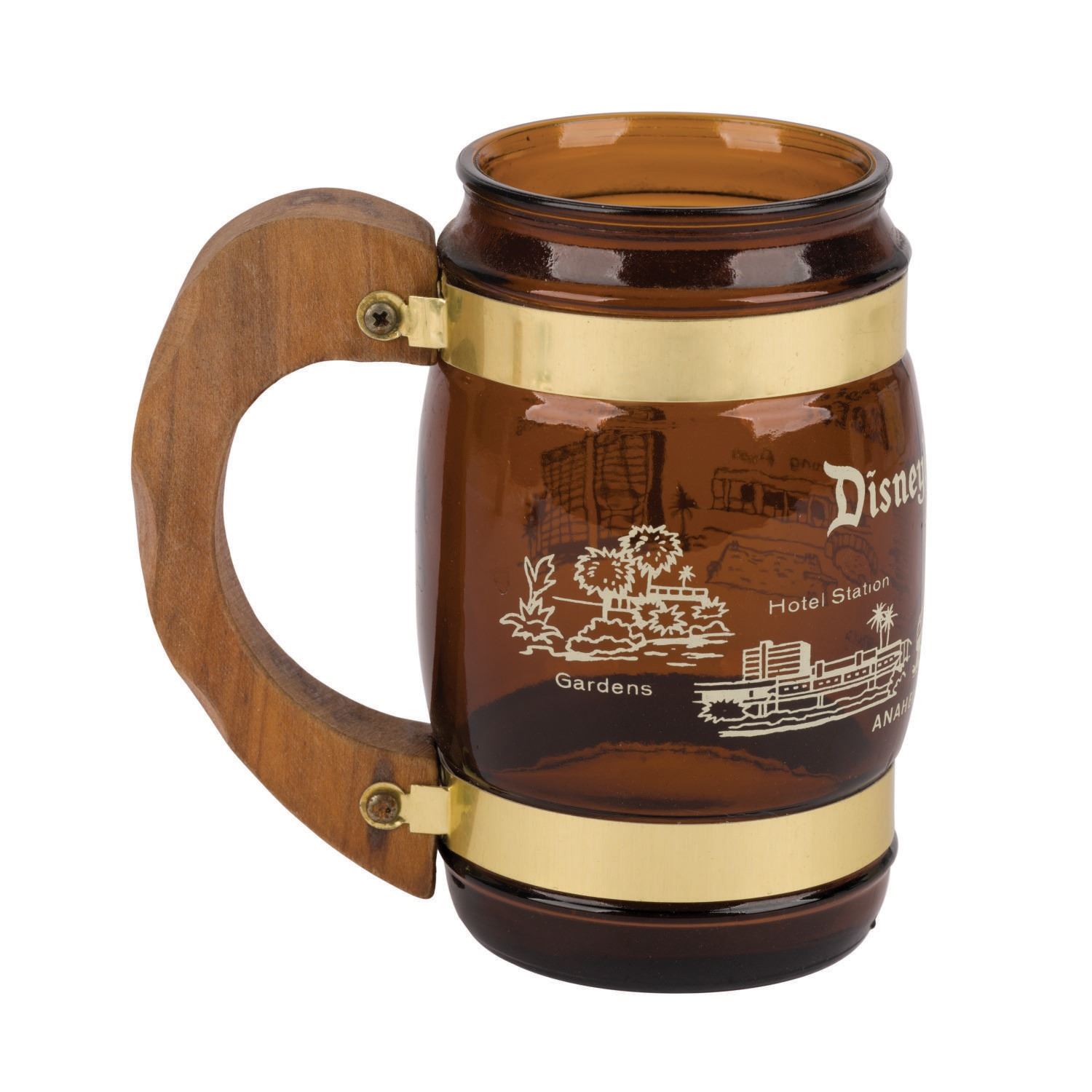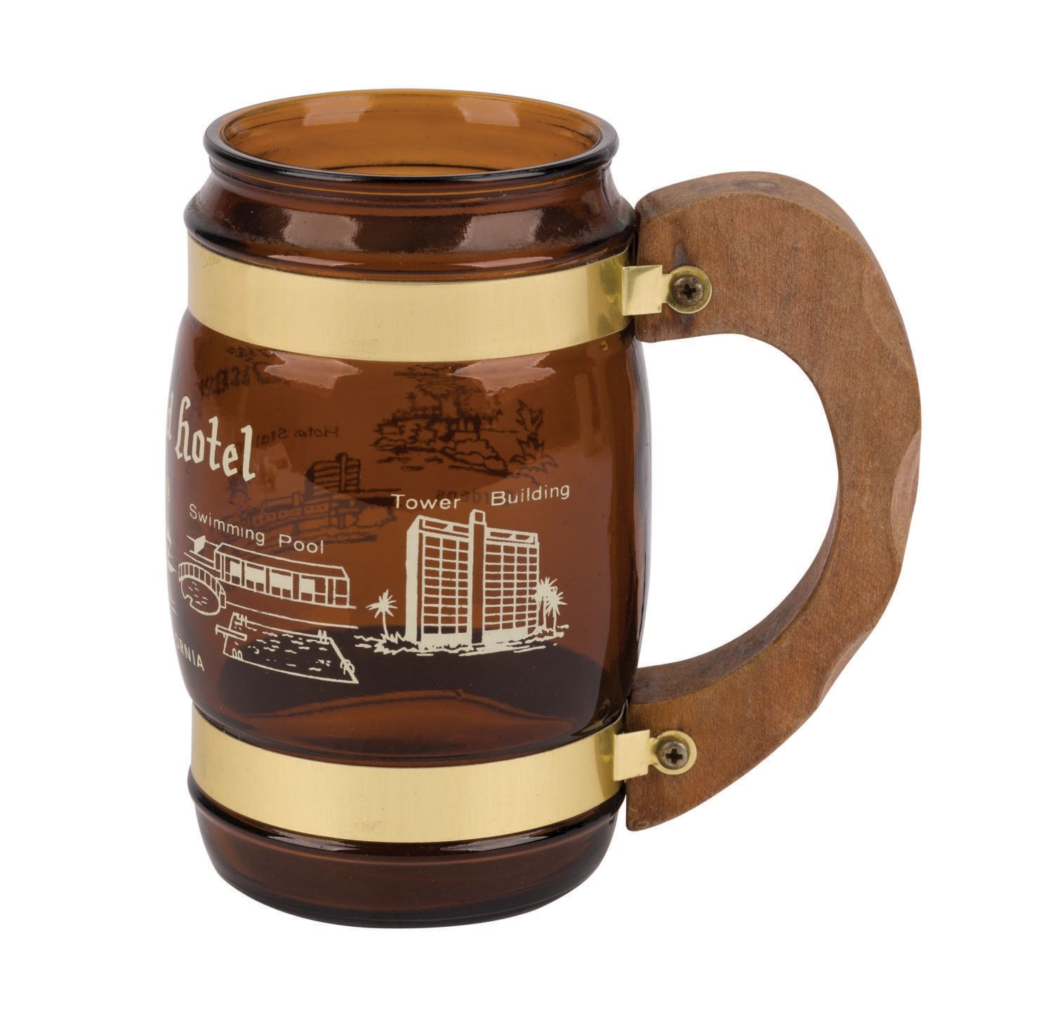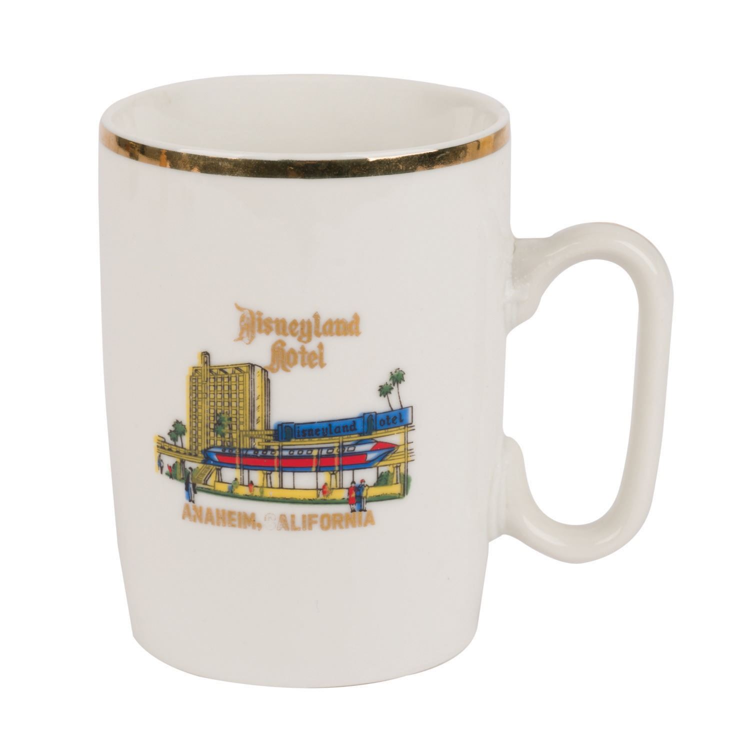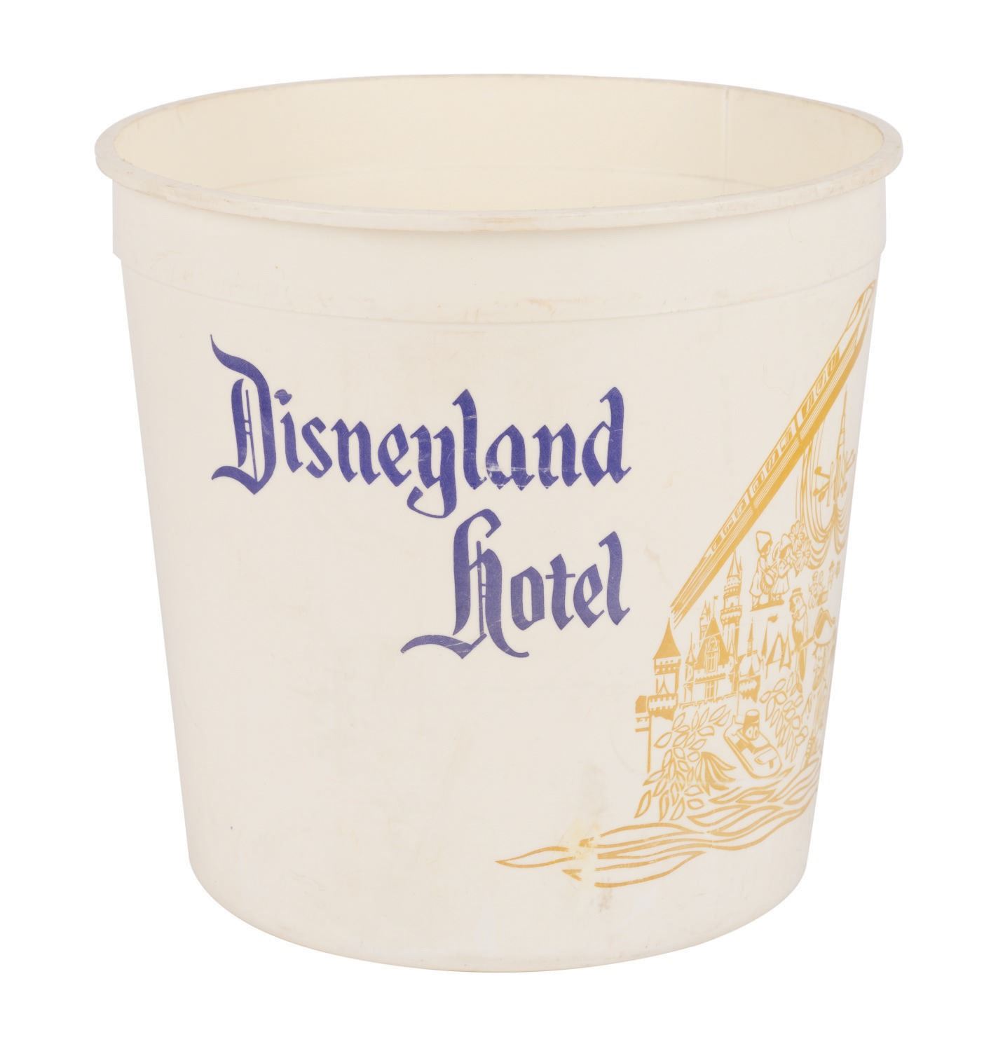 (Disneyland, 1960s/70s) A collection of vintage souvenirs from the Disneyland Hotel. Among the lot are an ice bucket, a 1960s souvenir mug, a Spirits & Gourmet Shop wine cork extractor, a 1961-66 matchbook, a 1961-66 mug, two Disneyland Hotel buttons, and a 1970s Shipyard Inn mug. Measuring various sizes, the mementos of The Disneyland Hotel are in very good to good condition exhibiting minor wear.