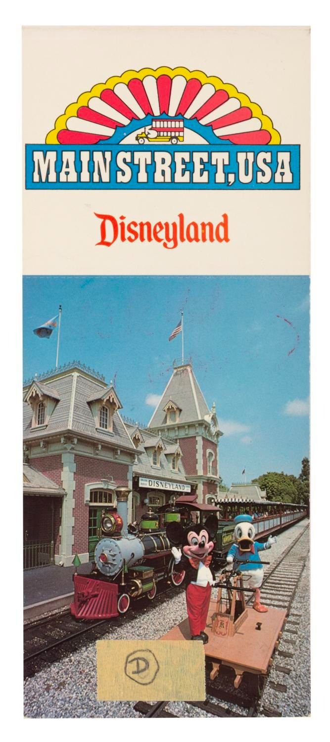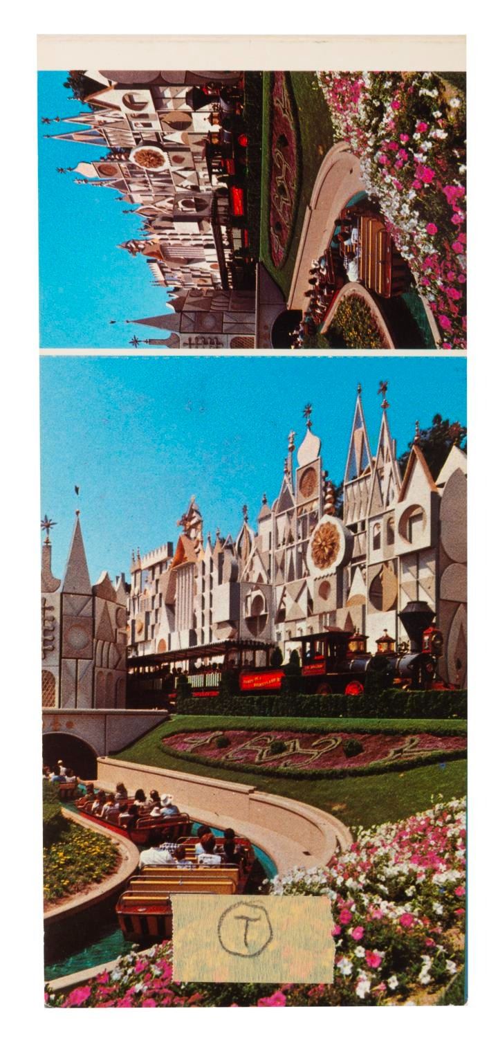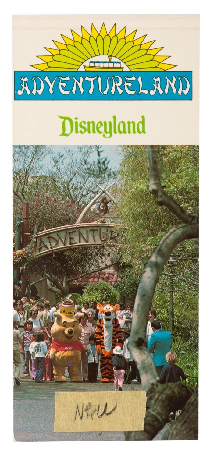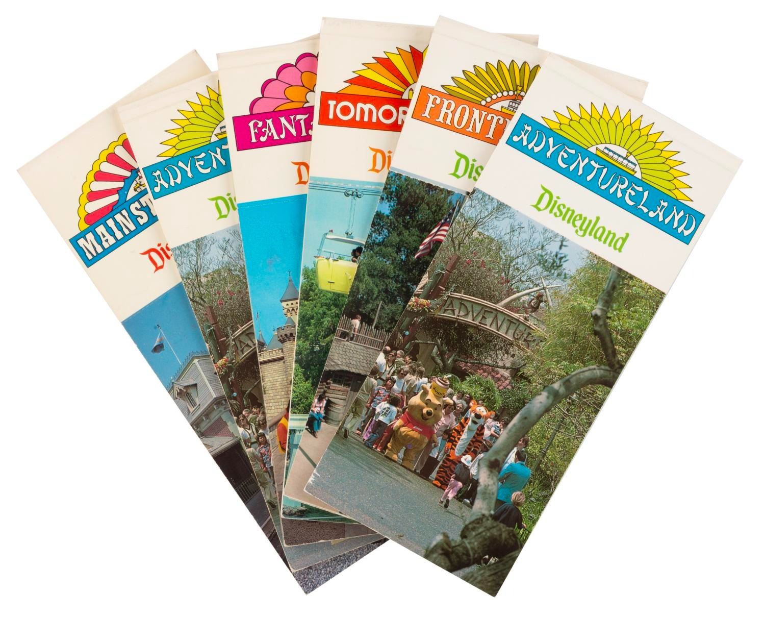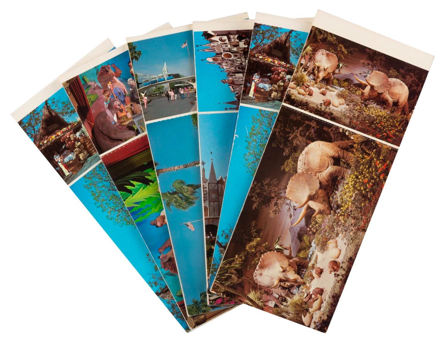 (Disneyland, 1960s) A collection of six Disneyland postcard books from Fantasyland, Main Street, U.S.A., Frontierland, Tomorrowland, and two from Adventureland, each containing 8 postcards. Measuring approximately 3.5” x 8.5” each, the books are in fair to good condition with edge wear, tape, notations in graphite and grease pencil, and one postcard missing from both the Main Street and Frontierland books.