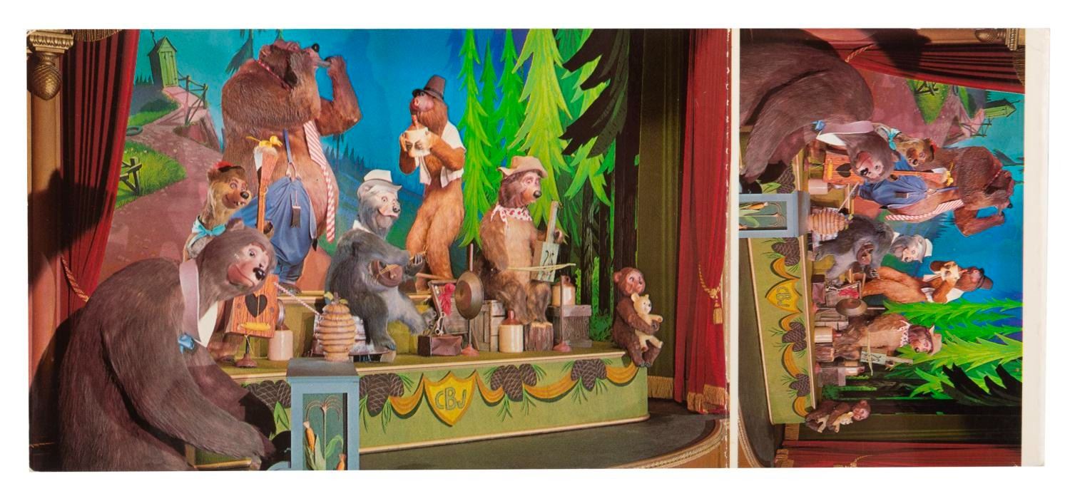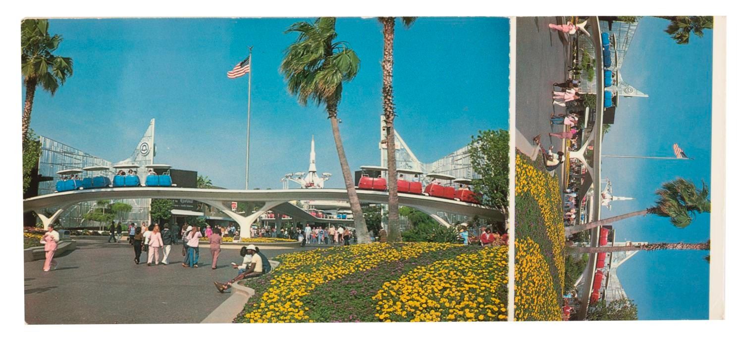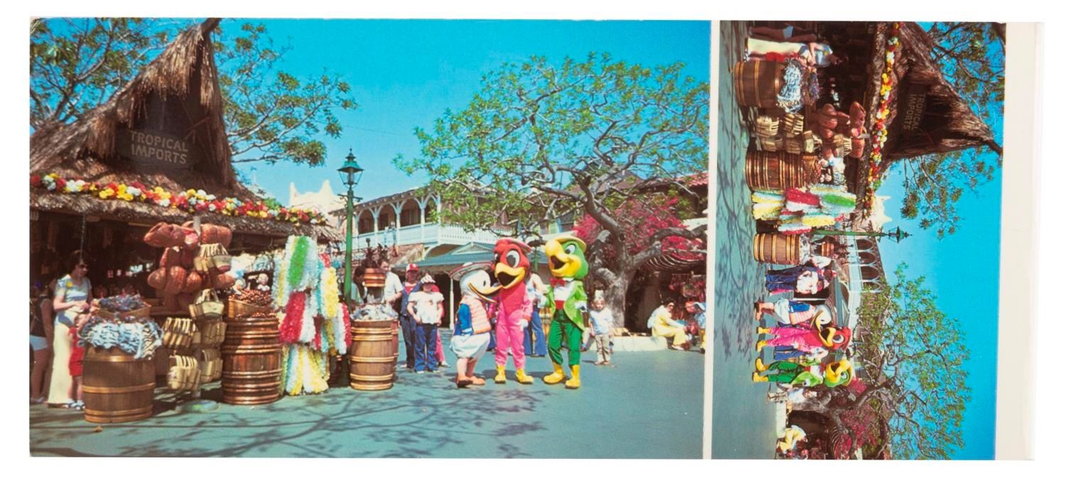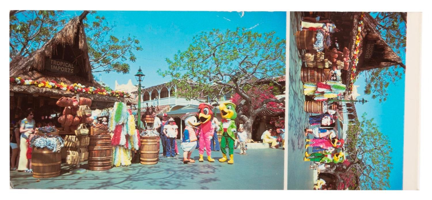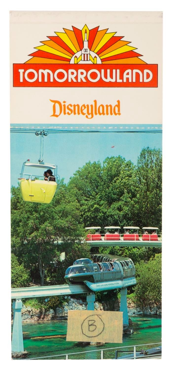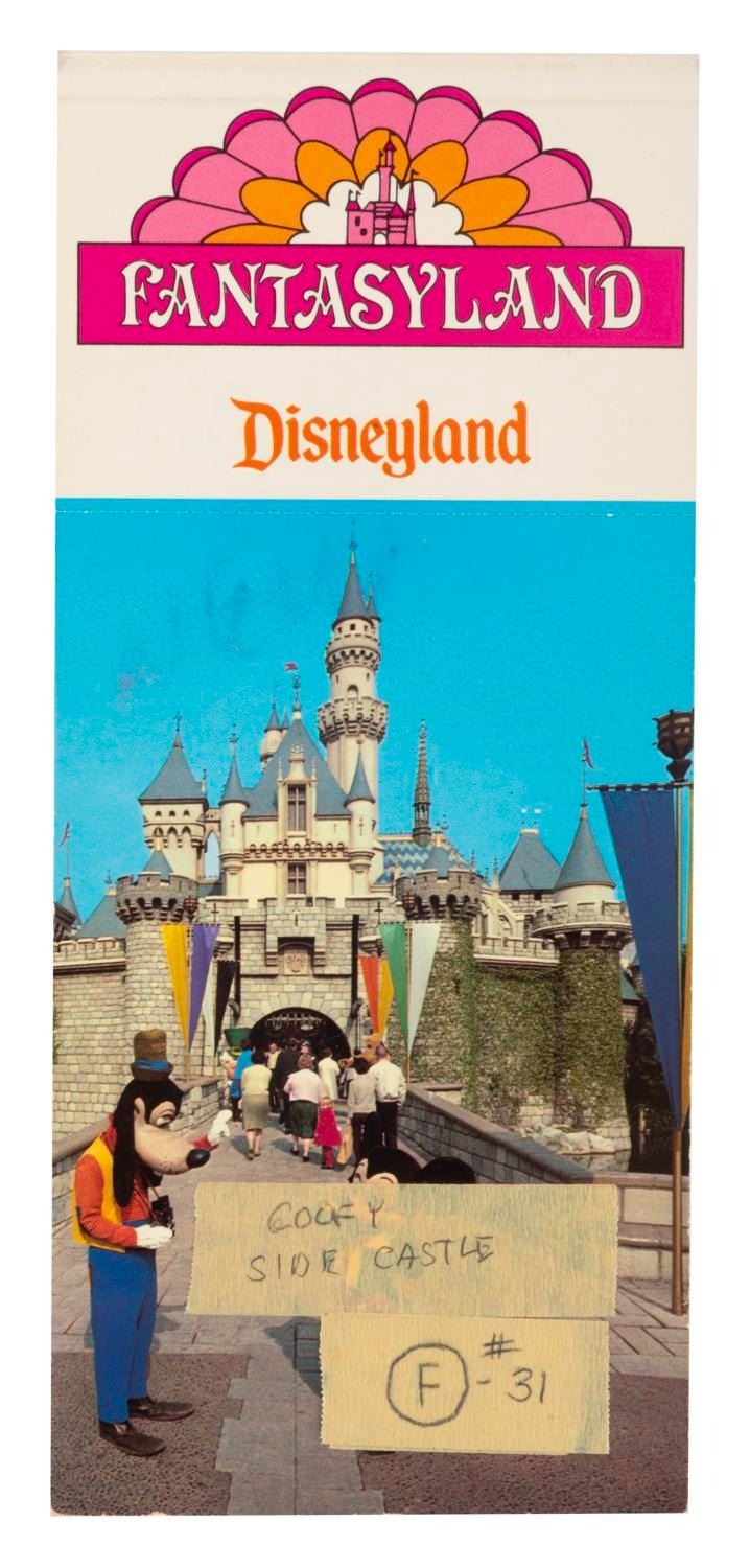 (Disneyland, 1960s) A collection of six Disneyland postcard books from Fantasyland, Main Street, U.S.A., Frontierland, Tomorrowland, and two from Adventureland, each containing 8 postcards. Measuring approximately 3.5” x 8.5” each, the books are in fair to good condition with edge wear, tape, notations in graphite and grease pencil, and one postcard missing from both the Main Street and Frontierland books.