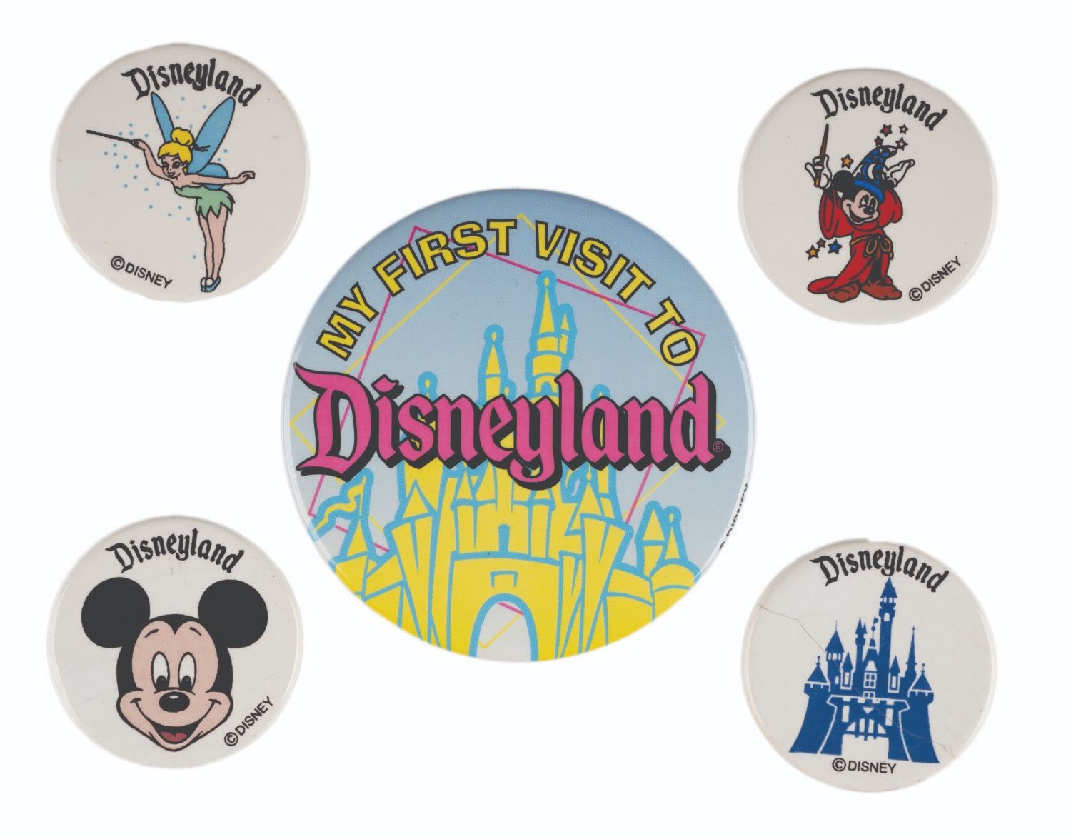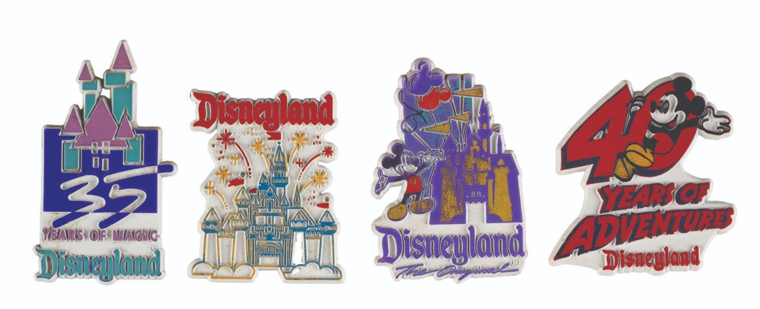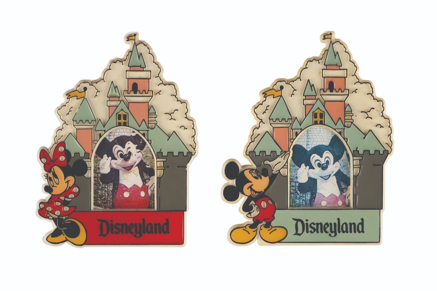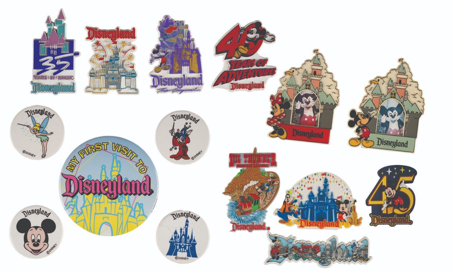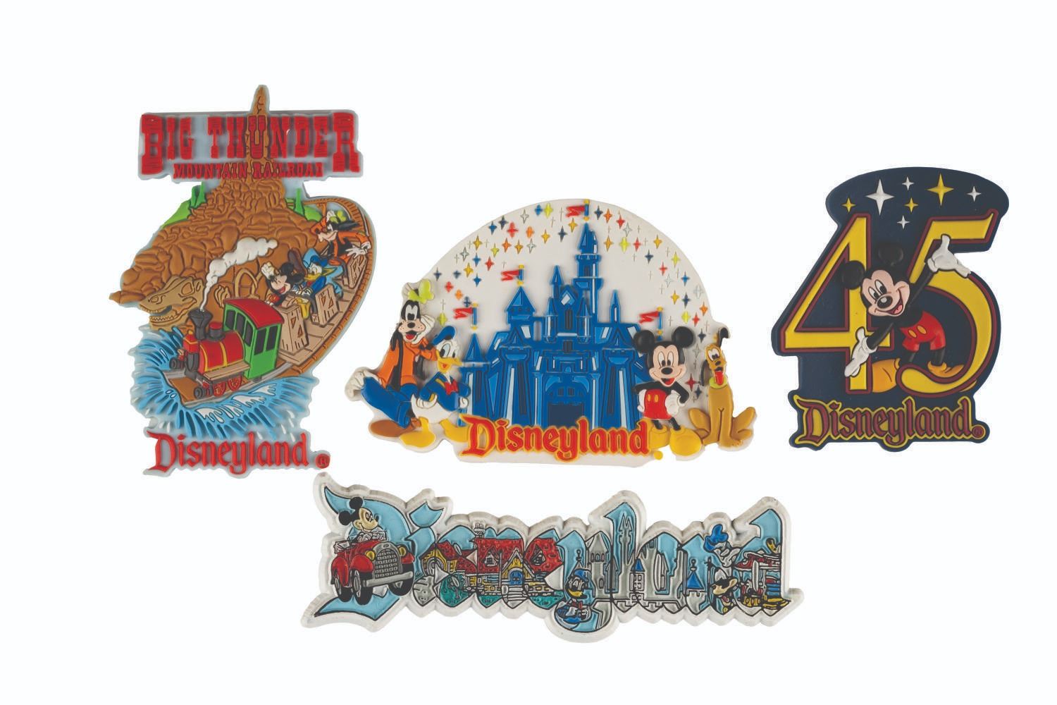 (Disneyland, 1980s-2000s) A collection of 16 souvenir fridge magnets, featuring the 35, 40th, and 45th Park anniversaries. Also included are Big Thunder Mountain, "My First Visit to Disneyland," photo frame magnets featuring Mickey and Minnie, and more. Measuring from 1.5" in diameter up to 3" x 4", the magnets are in very good condition with light wear from age and handling. The placeholder images of Mickey in the photo magnets are faded and worn, though intended to be replaced.