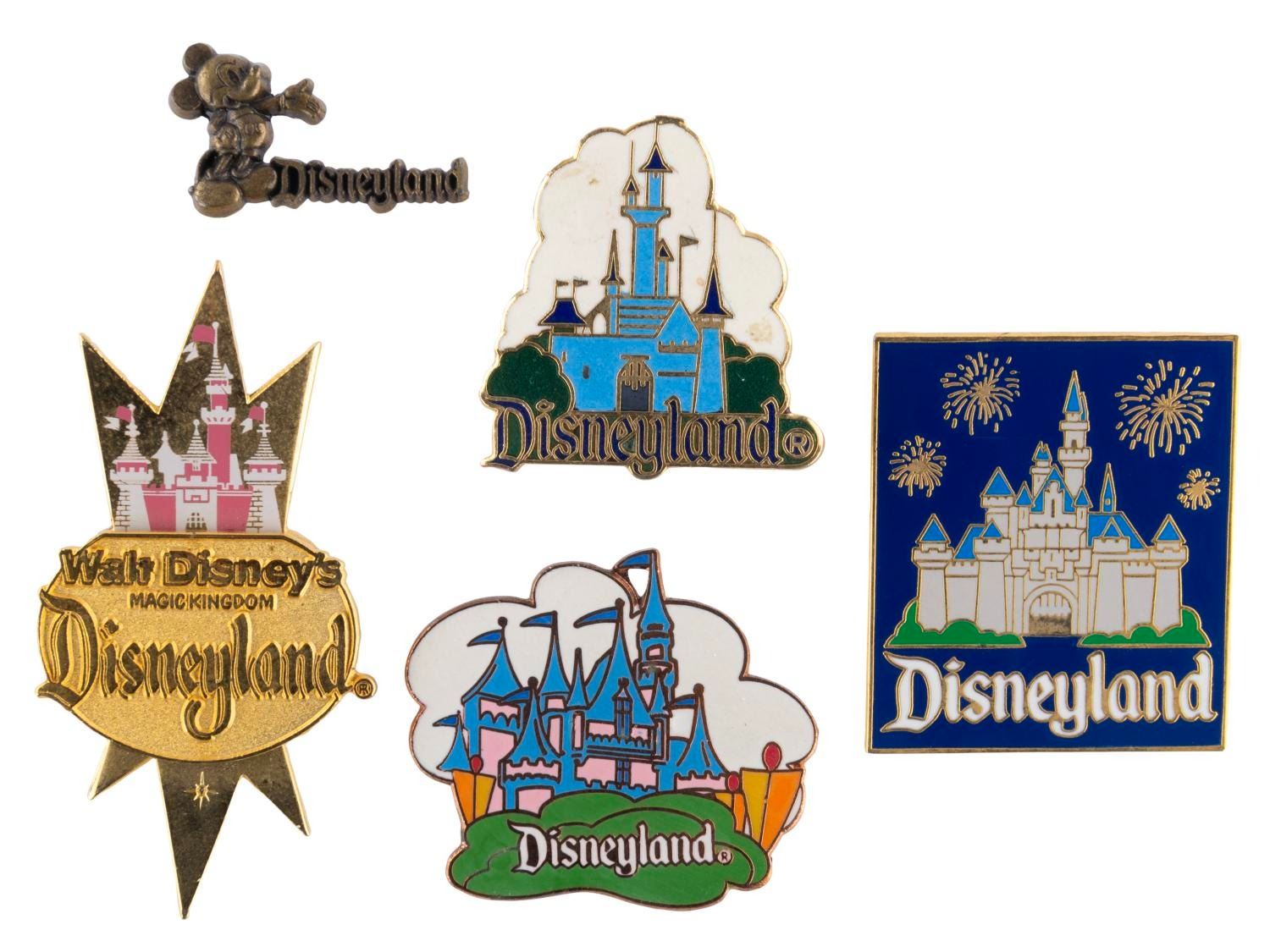 (Disneyland, 1990s-2000s) A collection of four Disneyland pins featuring Sleeping Beauty Castle and one with Mickey Mouse. Measuring 1" to 2", the pins are in good condition with light smudges, discoloration, and wear from age.