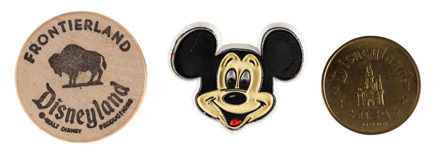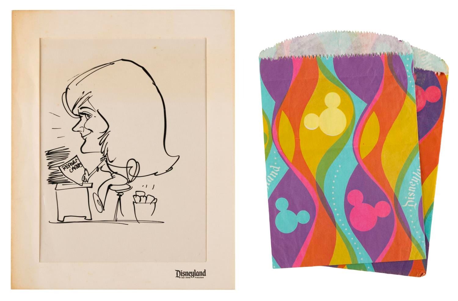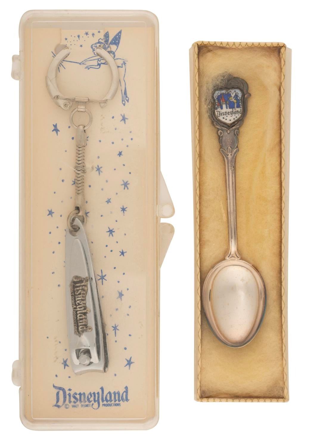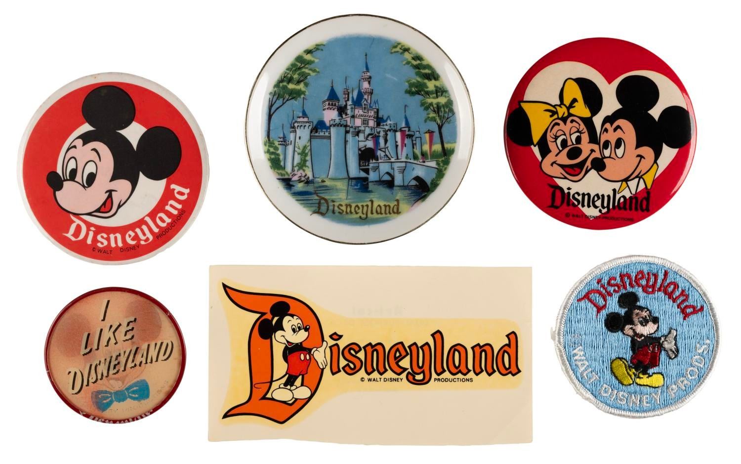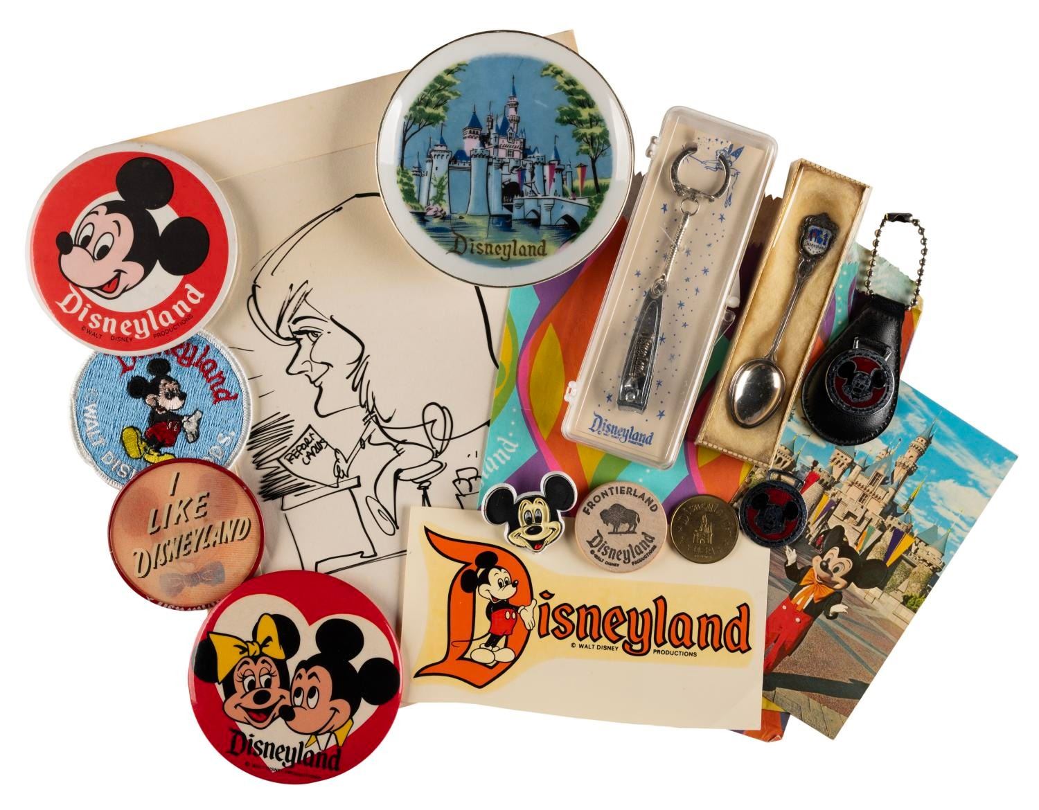 (Disneyland, 1950s-1980s) A collection of 16 souvenirs from Disneyland, included are four buttons, two gift bags, one caricature cel, one embroidered patch, a wooden nickel, a decal, a spoon, keychain, plate, nail clippers, and two postcards. Measuring from 1" in diameter to 8" x 10", the items are in very good to good condition with light oxidation to the buttons, spoon, coin, and nail clippers, minor paint loss to the plate, and creasing, discoloration, edge and general handling wear to the paper items.