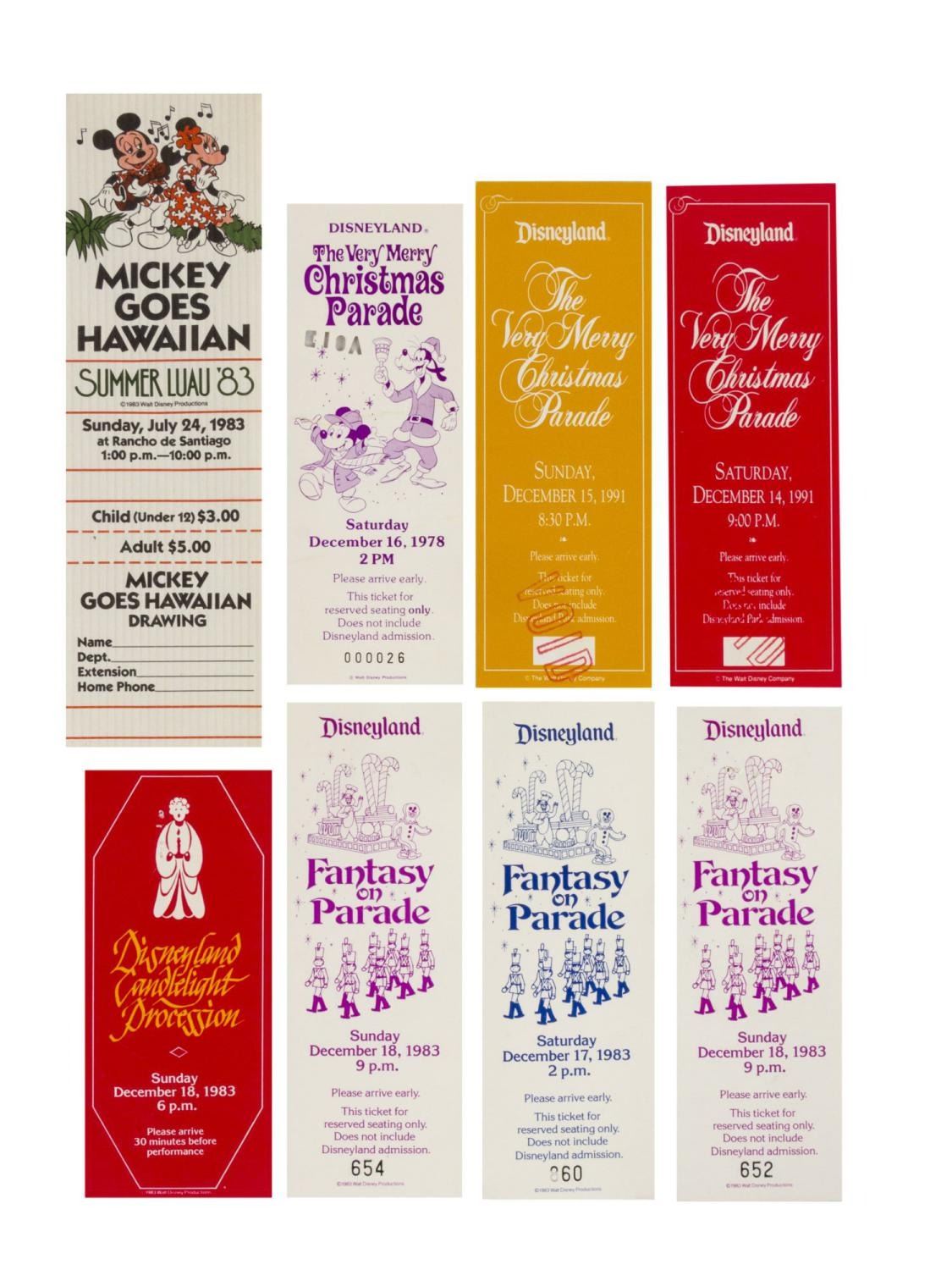 (Disneyland, 1978-91) A collection of eight Disneyland special event tickets from 1978 to 1991. Included are tickets for the Disneyland Candlelight Procession, three for the Very Merry Christmas Parade, three for Fantasy on Parade, and one for the "Mickey Goes Hawaiian" Summer Luau. The tickets range in size from 2” x 4.75" to 2.25” x 7.5" and are in very good to fine unused condition with light edge wear, small staple holes, and void stamps.