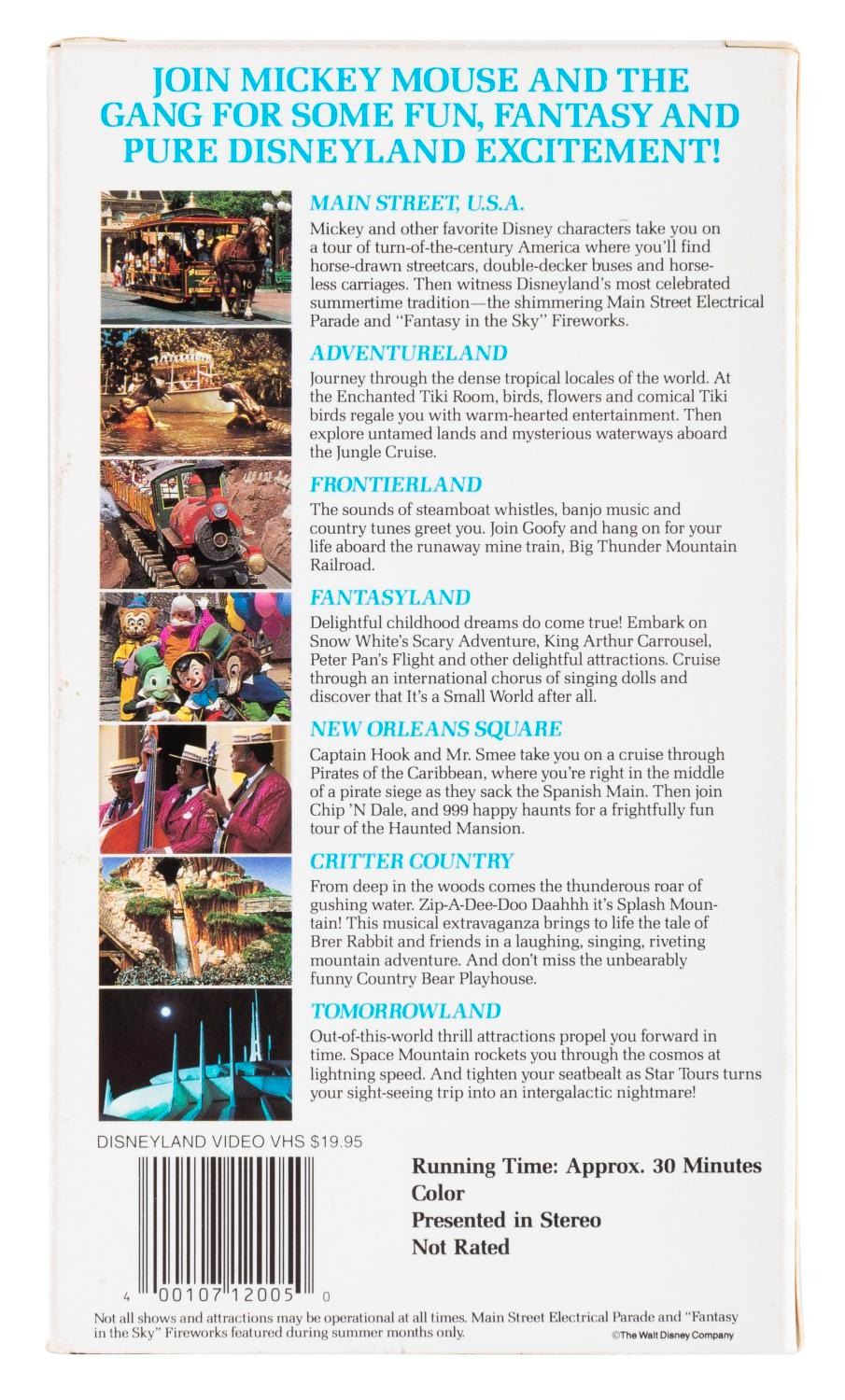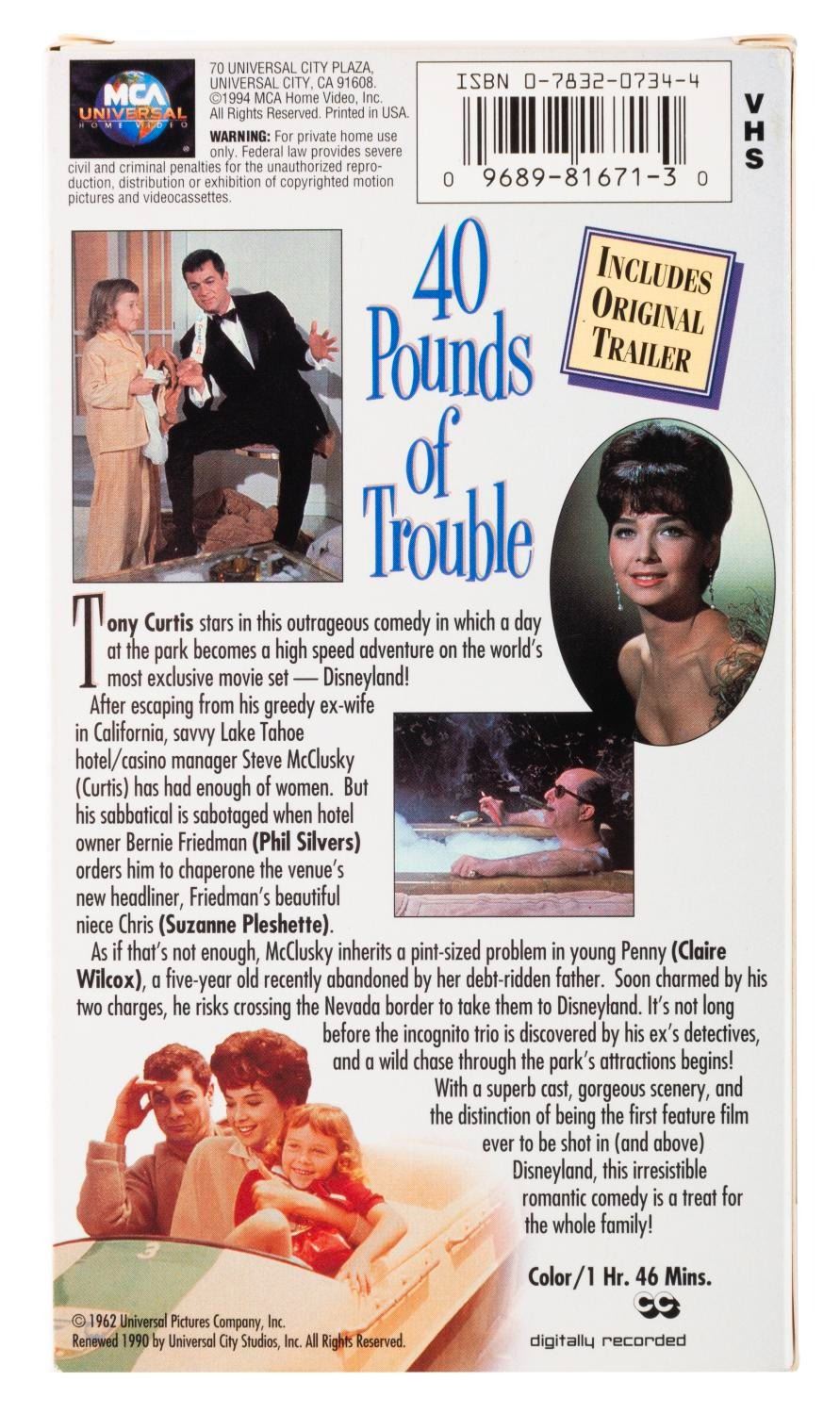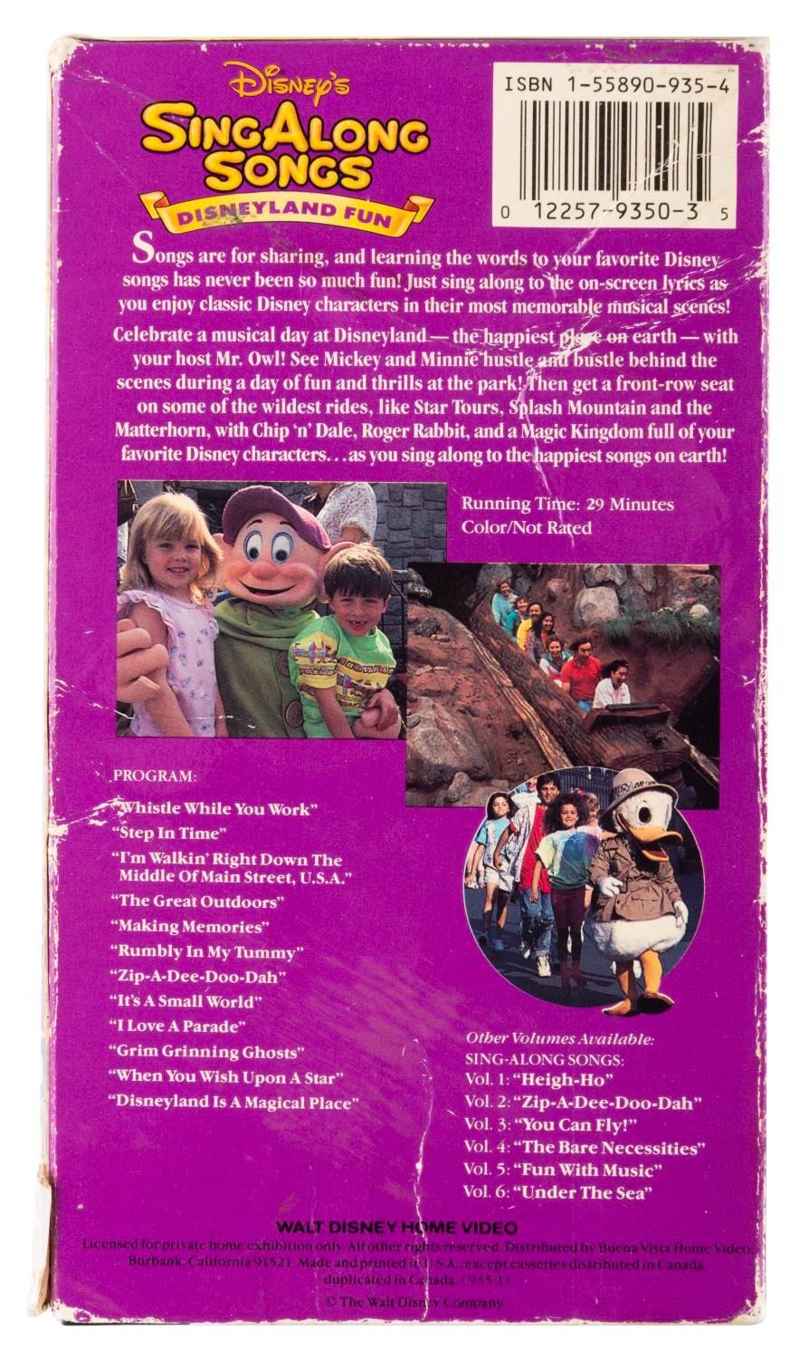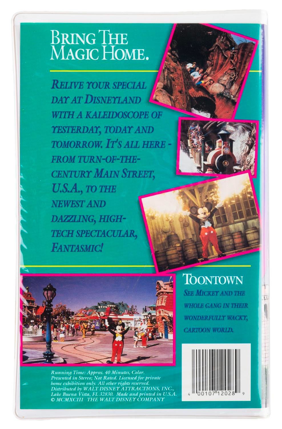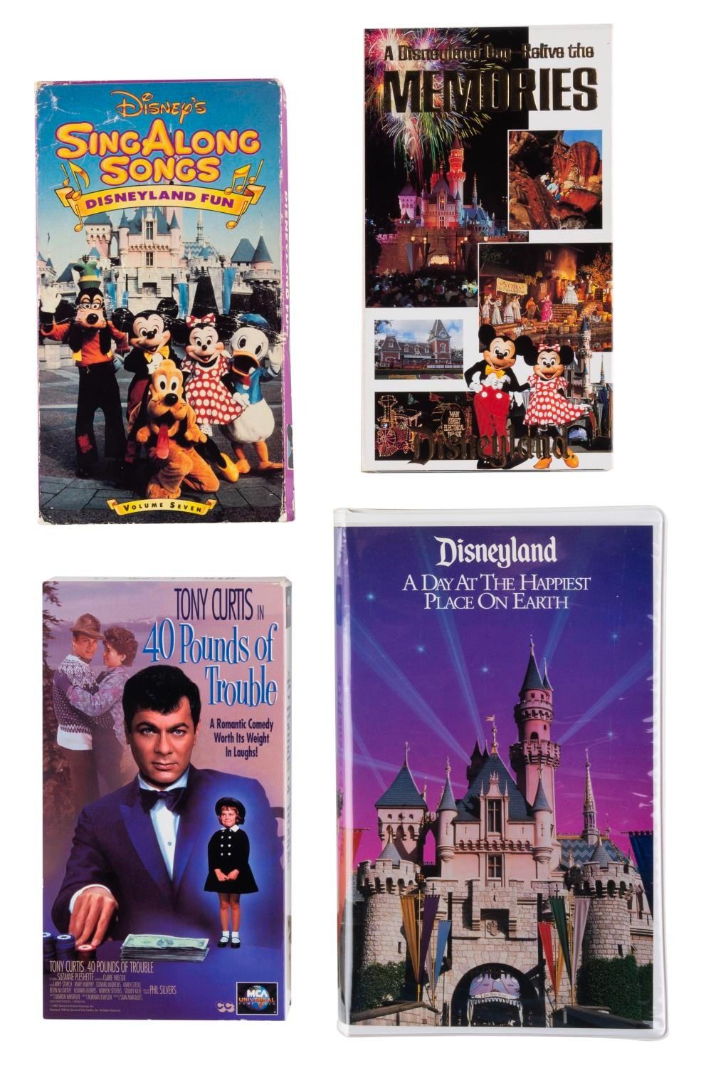 (Universal/Buena Vista/Disneyland, 1980s-90s) A collection of Disneyland-related VHS tapes, including "Disney's Sing Along Songs: Disneyland Fun, Volume Seven," "A Disneyland Day: Relive the Memories," "Disneyland: A Day at the Happiest Place on Earth," and 1962's "40 Pounds of Trouble," which features an extensive sequence of Tony Curtis chasing through Disneyland Park. The untested VHS tapes are in good to presumably fine condition, with the "Disney’s Sing Along Songs" tape displaying adhesive residue on the label, and a sleeve with edge wear and creases throughout.