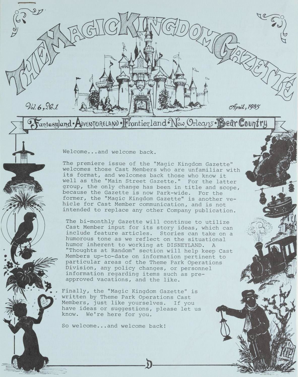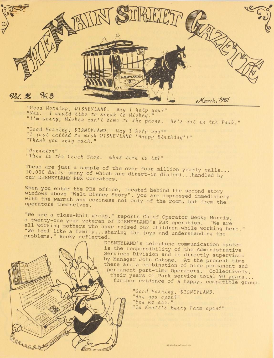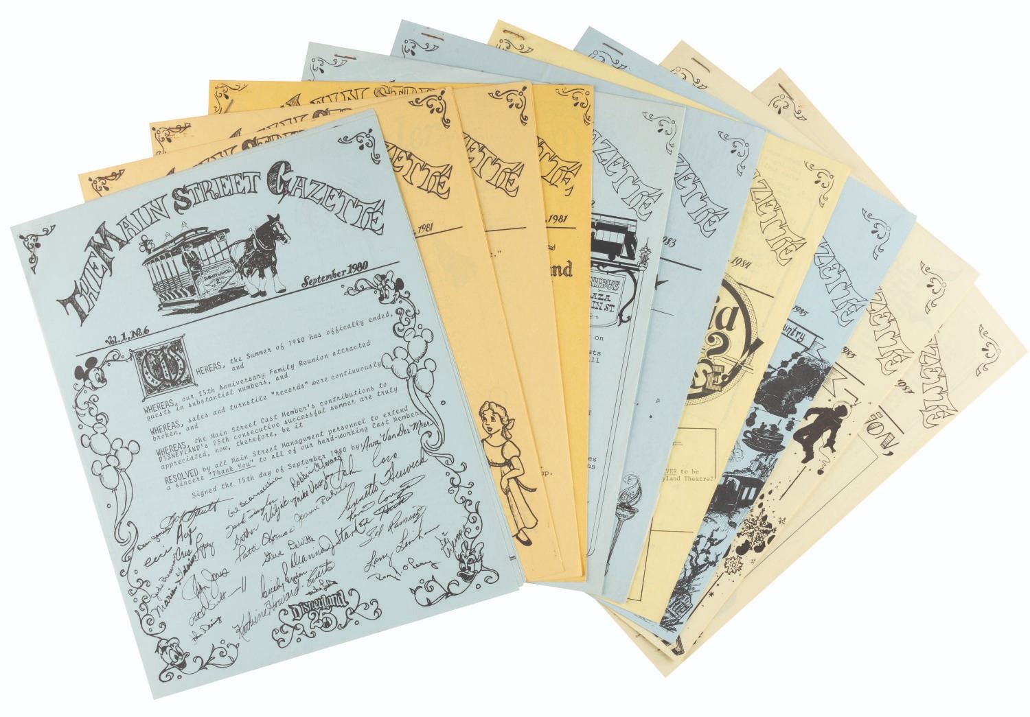(Disneyland, 1980-1987) A Collection of ten issues of Disneyland's Main Street Gazette dating from September 1980 to April 1987. The publication written by Disneyland employees for Disneyland employees changed its name to Magic Kingdom Gazette when it went Park-wide in 1985. Each measuring 8.5" x 11", the gazettes are in very good condition, with some light handling wear, and some oxidation to staples.