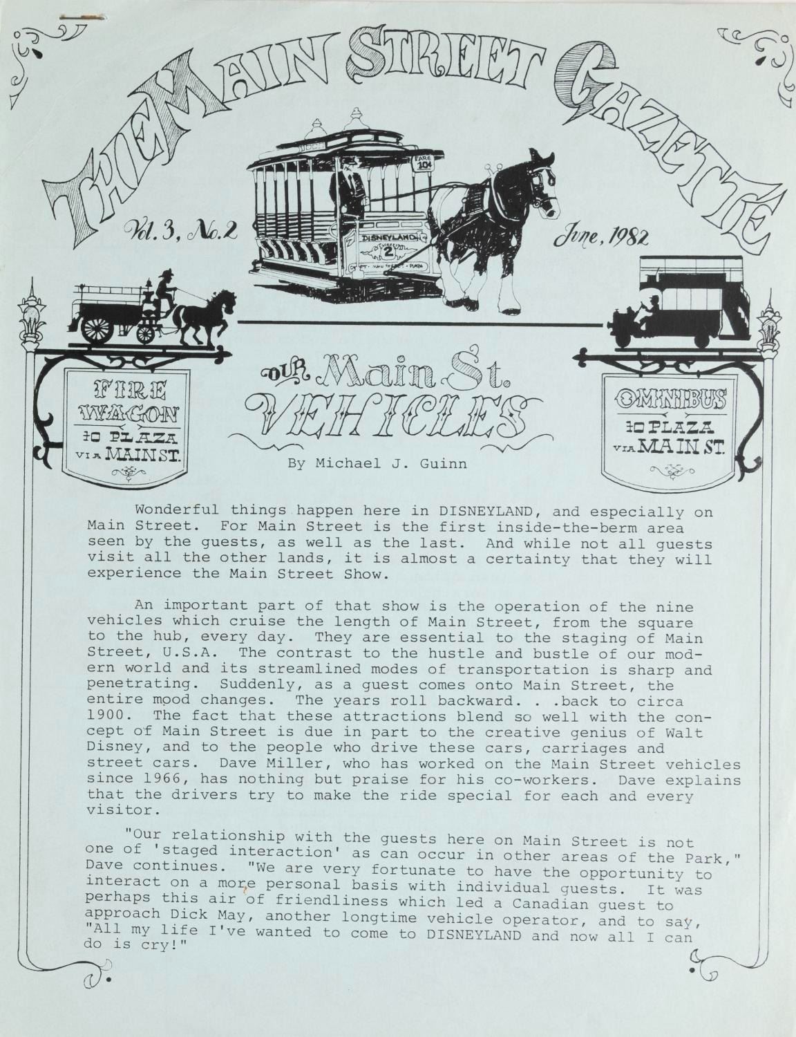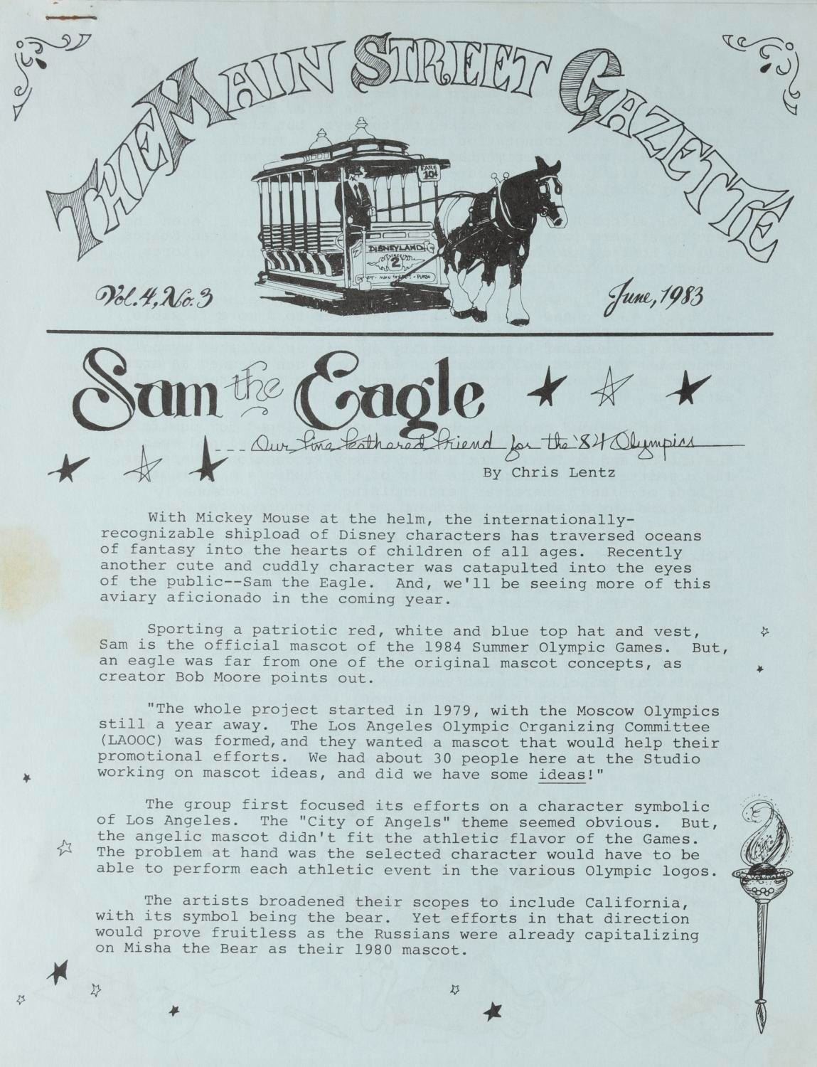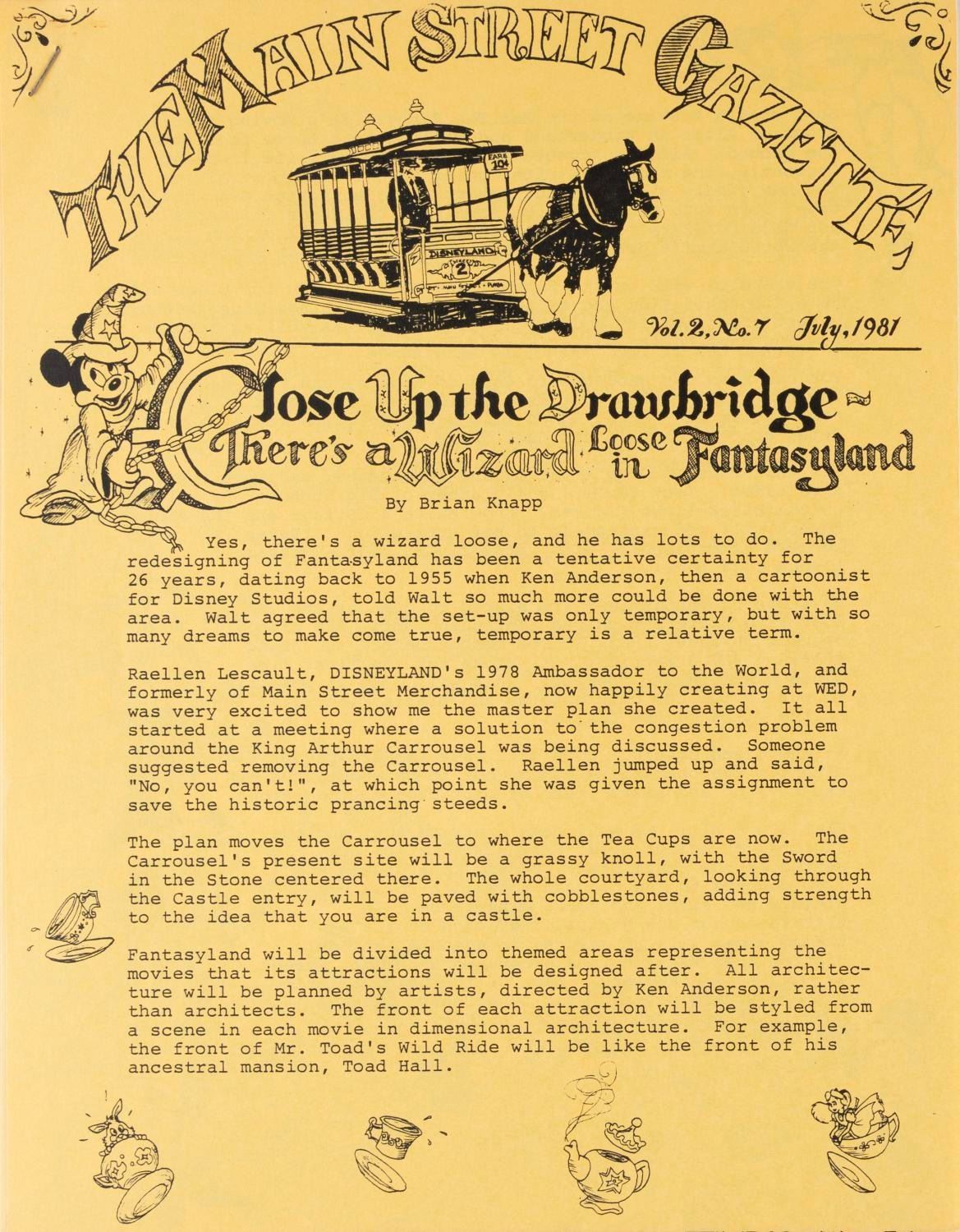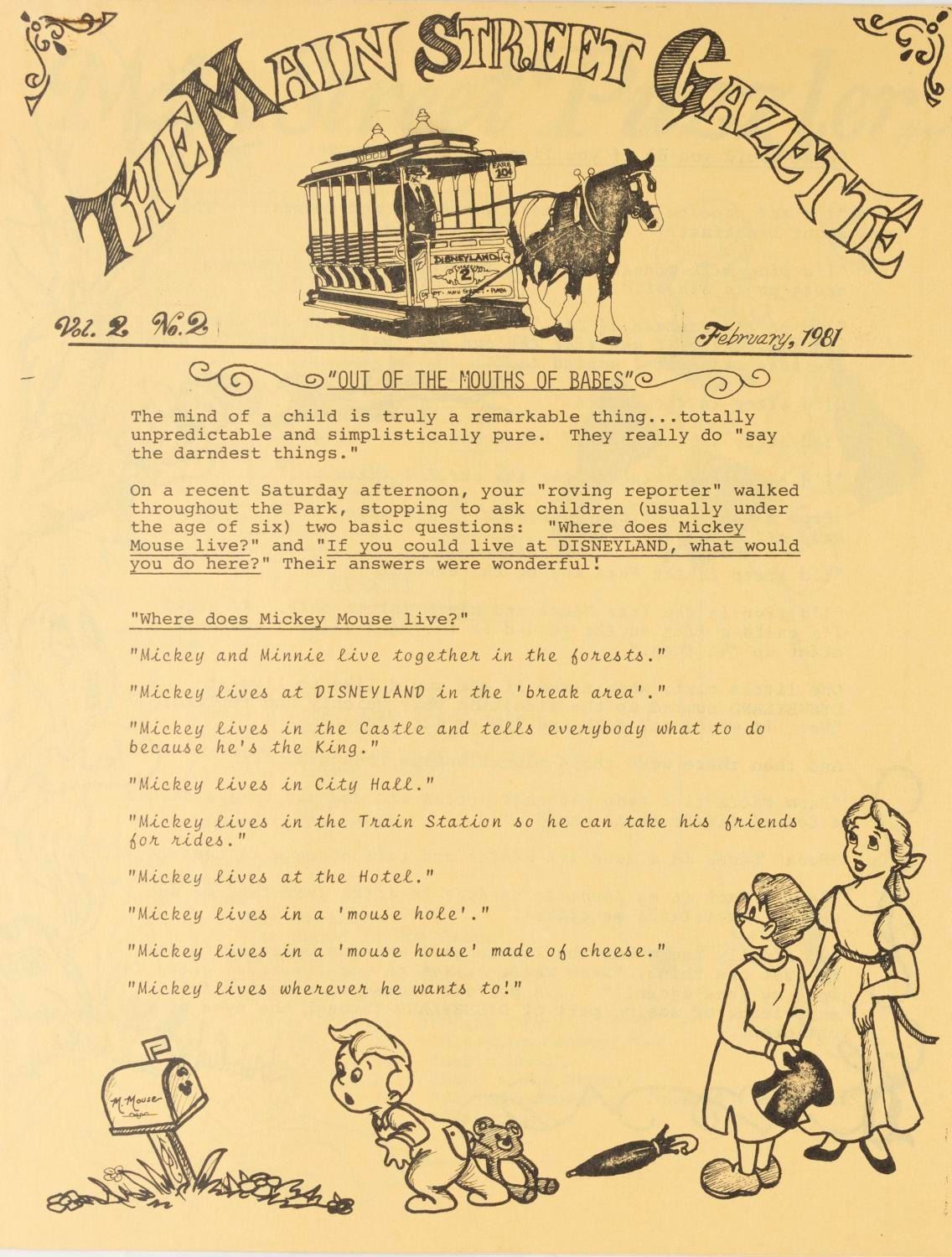 (Disneyland, 1980-1987) A Collection of ten issues of Disneyland's Main Street Gazette dating from September 1980 to April 1987. The publication written by Disneyland employees for Disneyland employees changed its name to Magic Kingdom Gazette when it went Park-wide in 1985. Each measuring 8.5" x 11", the gazettes are in very good condition, with some light handling wear, and some oxidation to staples.