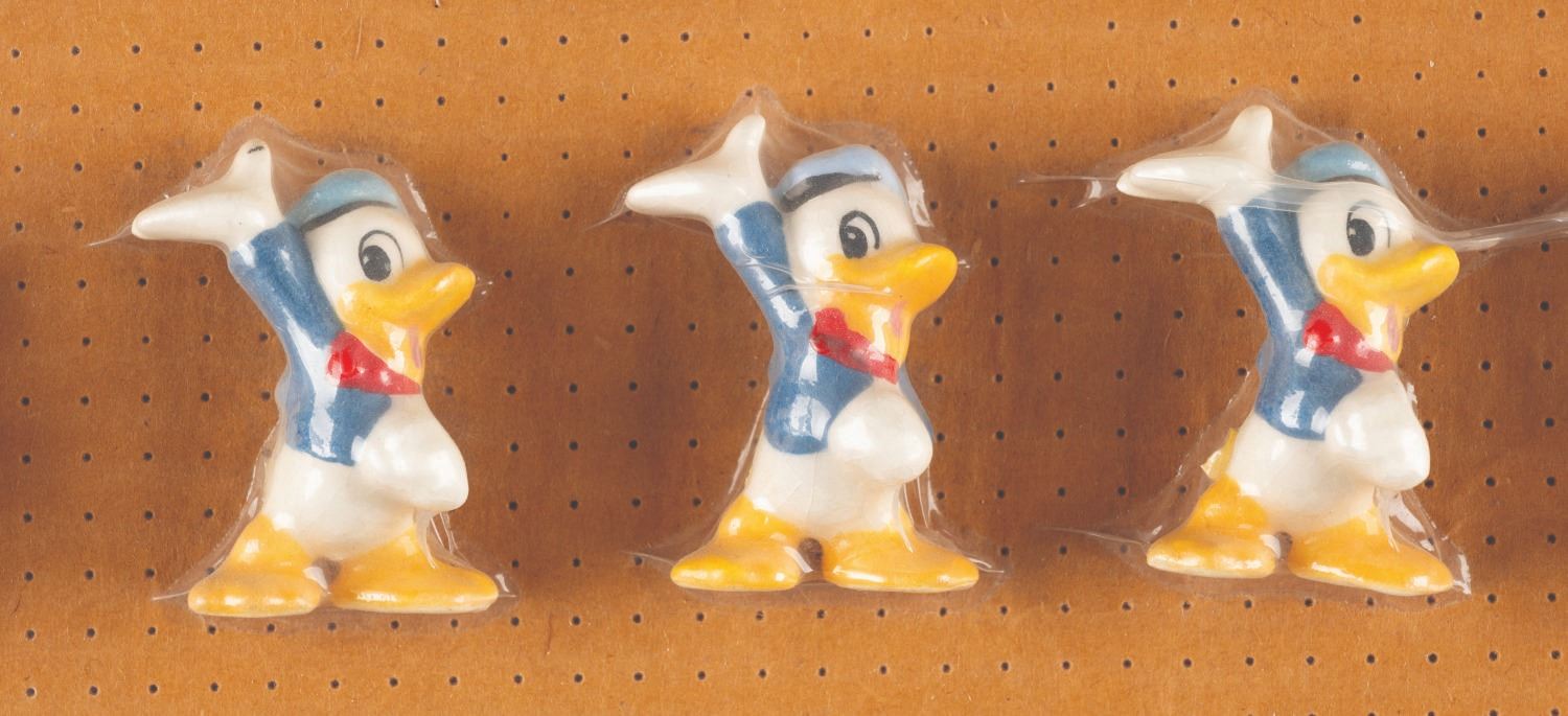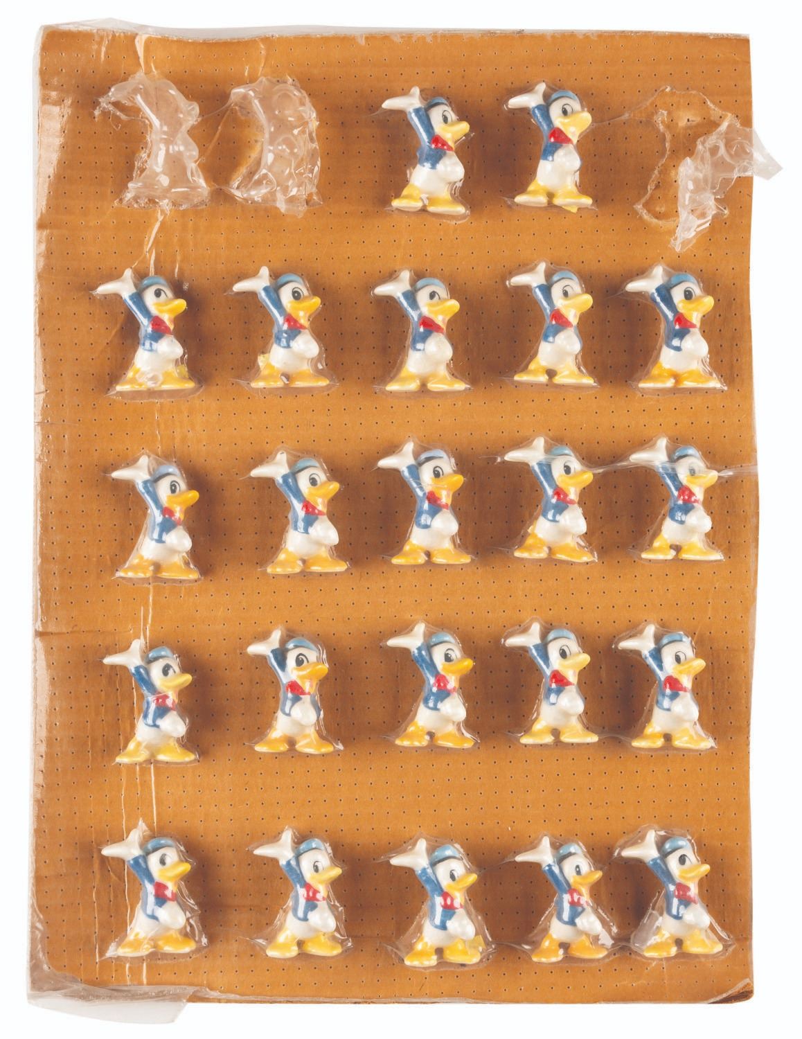 (Disney, 1950s-70s) A collection of 22 shrink-wrapped Donald Duck ceramic figurines. The figurines are as originally shipped by the manufacturer, with three removed. Measuring 2" x 1.5" each on 12" x 16" cardboard backing, the unopened ceramic figures are in good condition with visible crazing and may have some unseen cracks, damage, or wear once unwrapped.