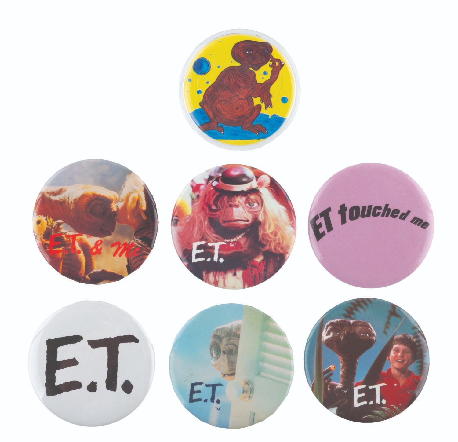 (Universal, 1982) A collection of seven “E. T.” buttons, including some likely unlicensed. Each measuring 2.25” in diameter, the buttons are in very good condition with some typical handling wear.