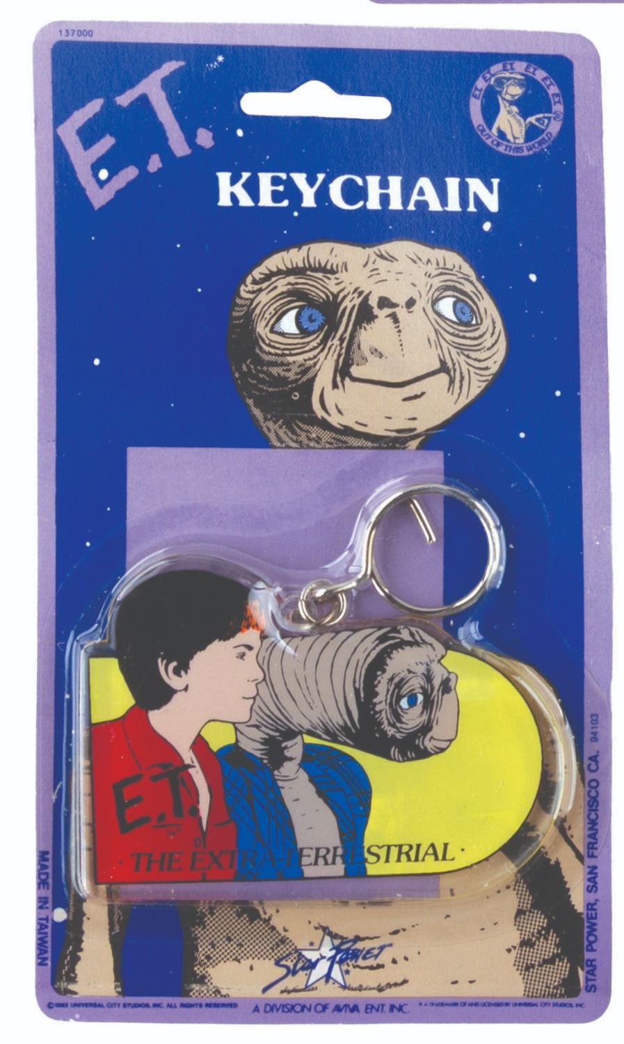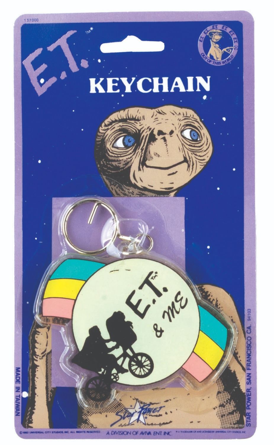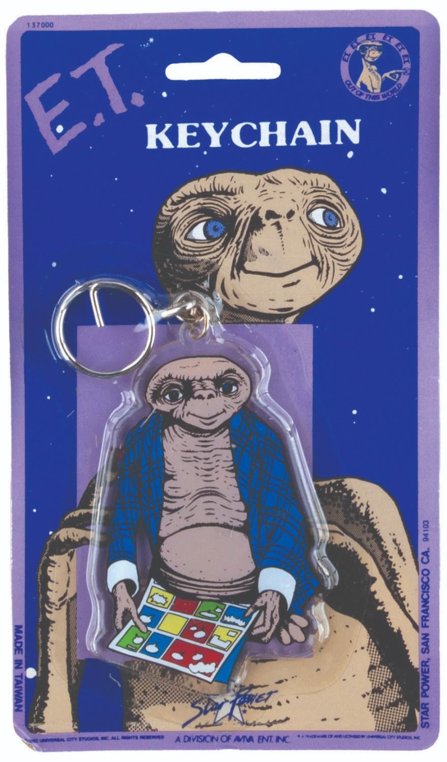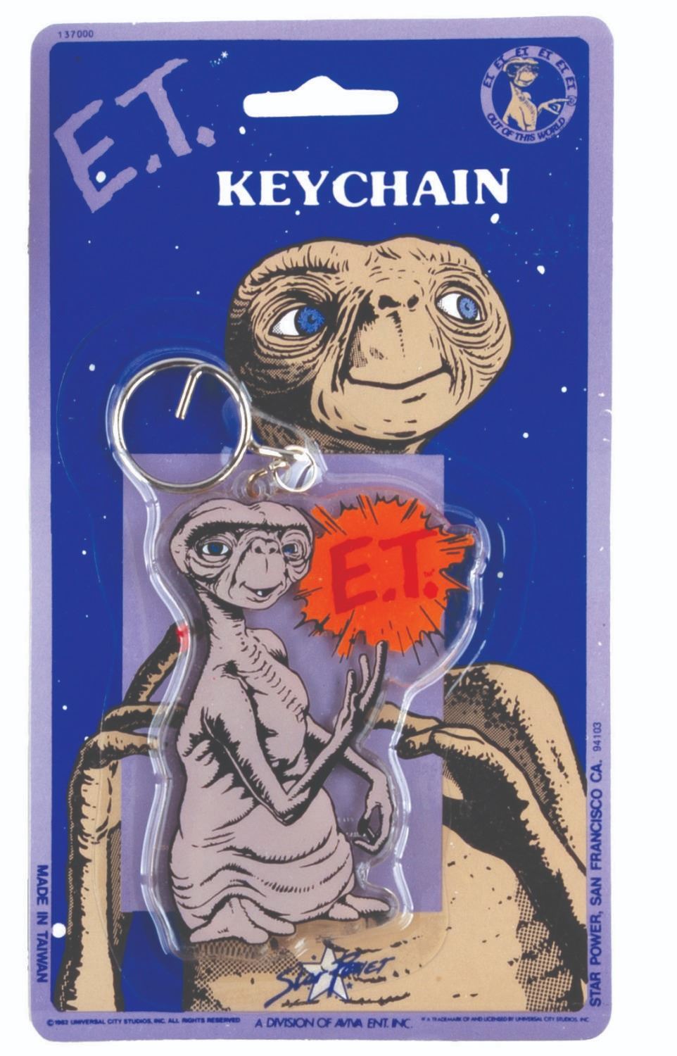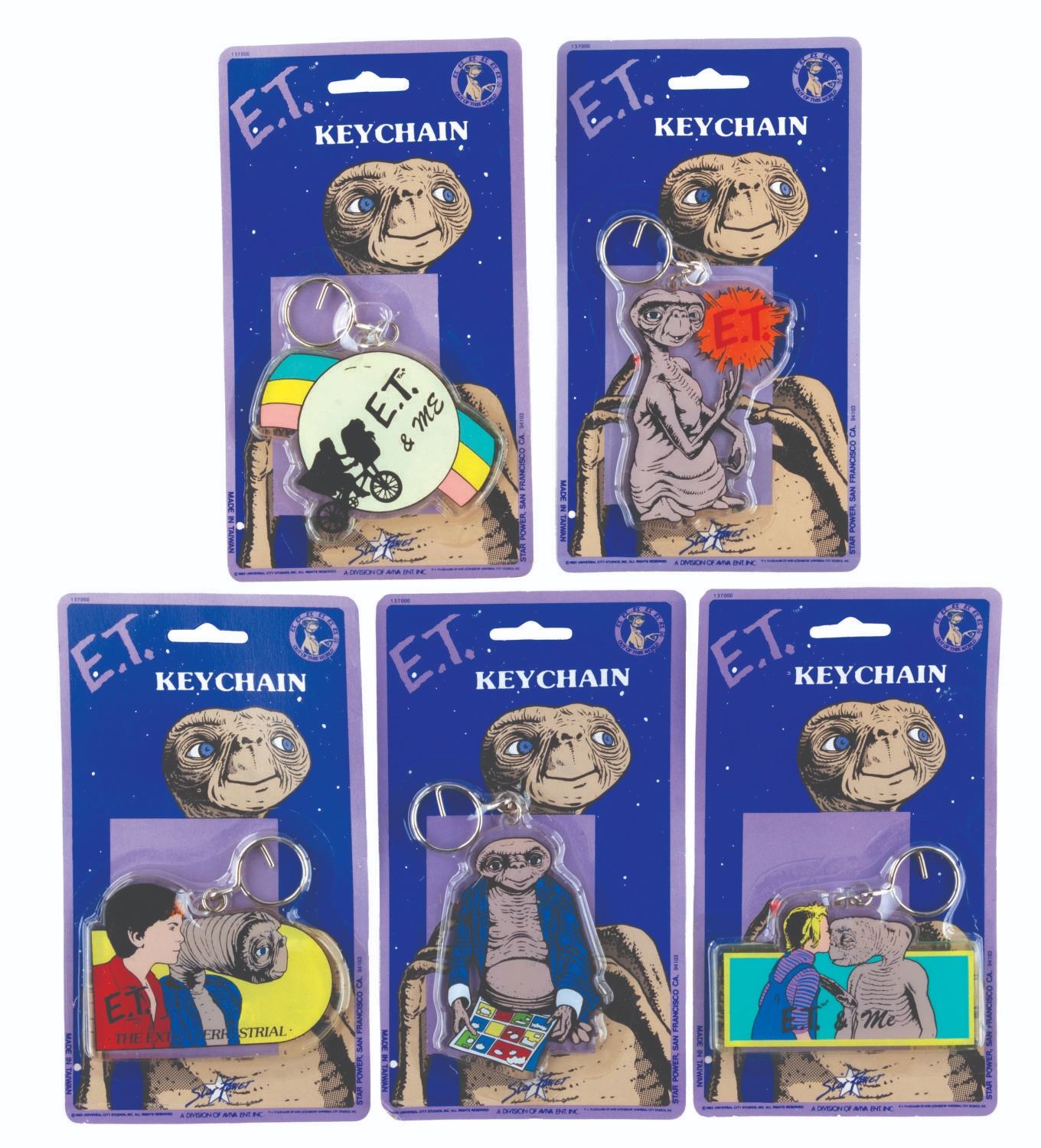 (Star Power, 1982) A collection of five “E.T.” keychains featuring E.T., Elliot, and Gertie. Measuring up to 3.75” x 3” on 7.75” x 4.5” cards, the keychains are in fine condition with light handling wear to some cards.