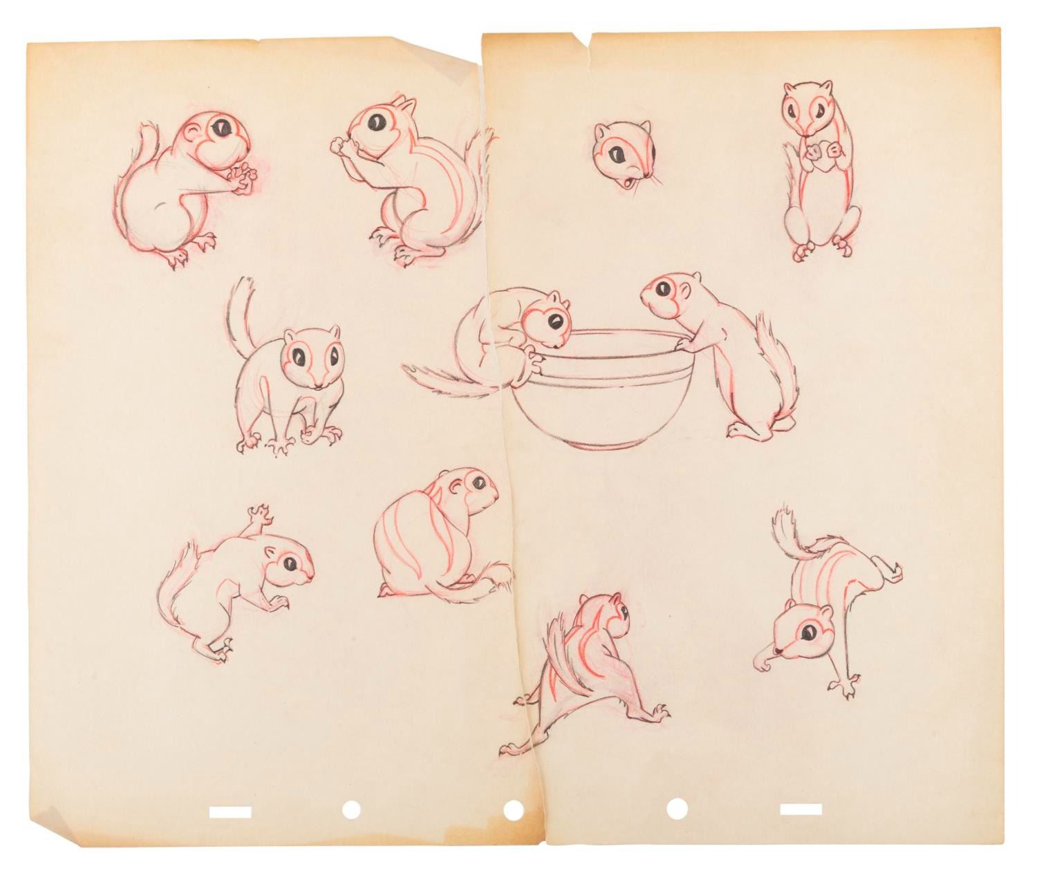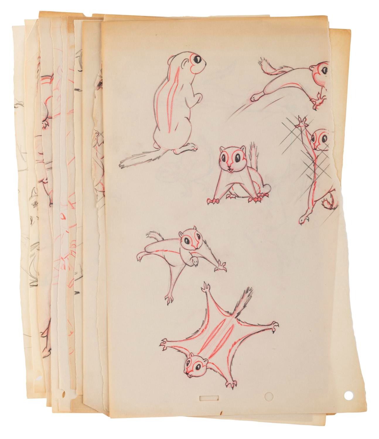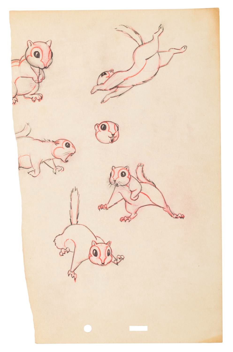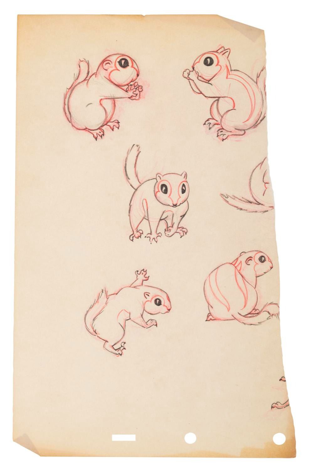 (Disney, 1930s-40s) A collection of eleven half-torn pages of squirrel drawings from an unknown early Disney production. The graphite and colored pencil drawings are in good condition with discoloration from age, creases, oxidation from a metal clip, and wear along the tears.